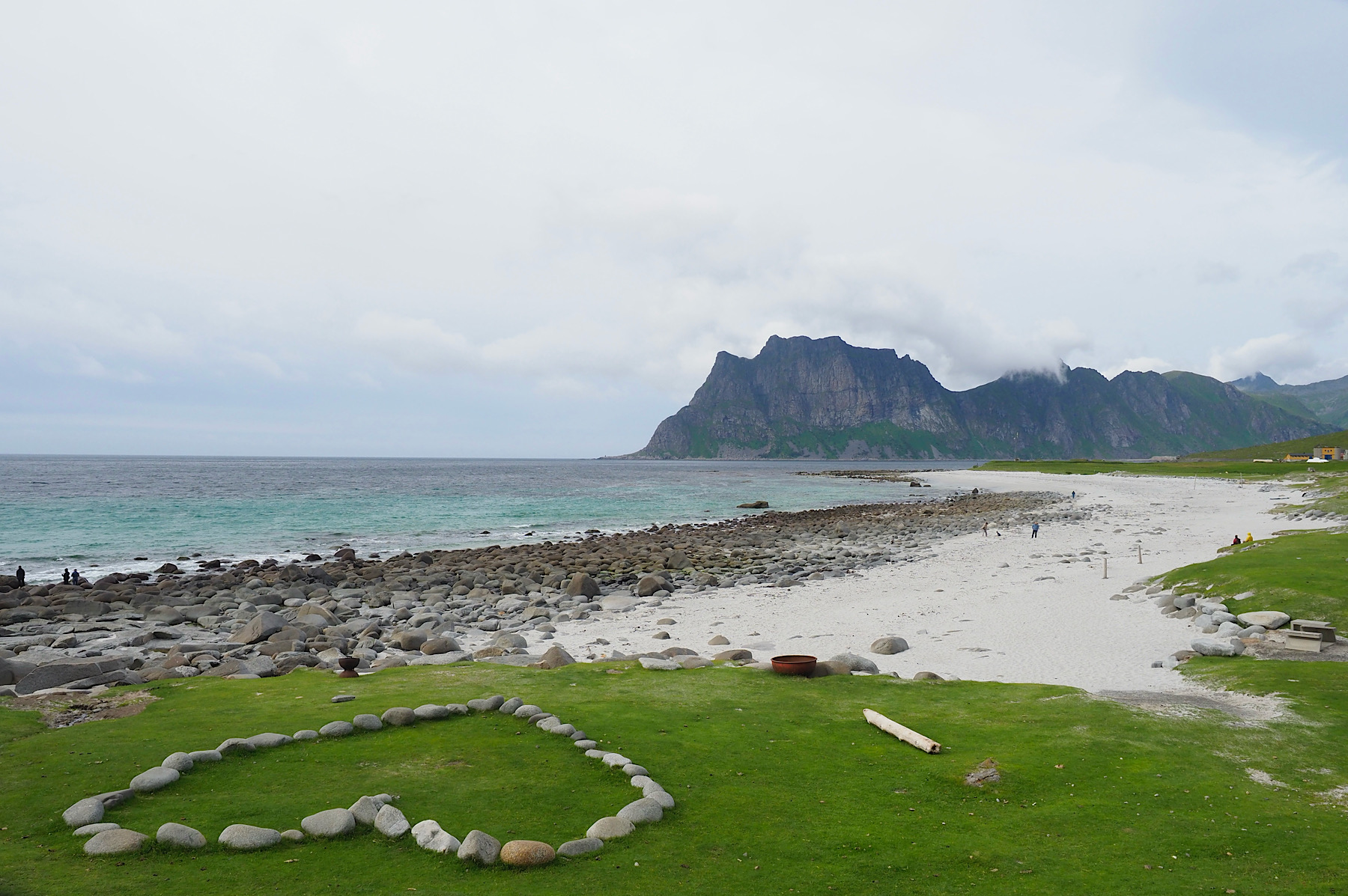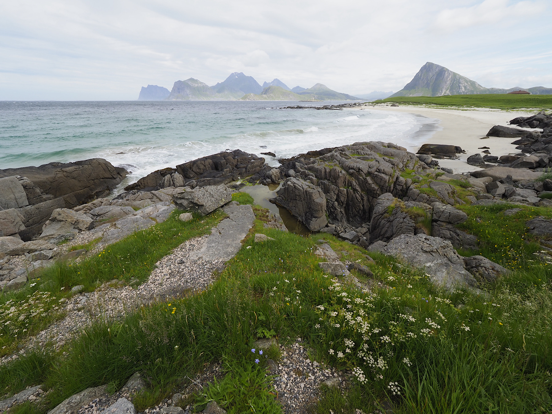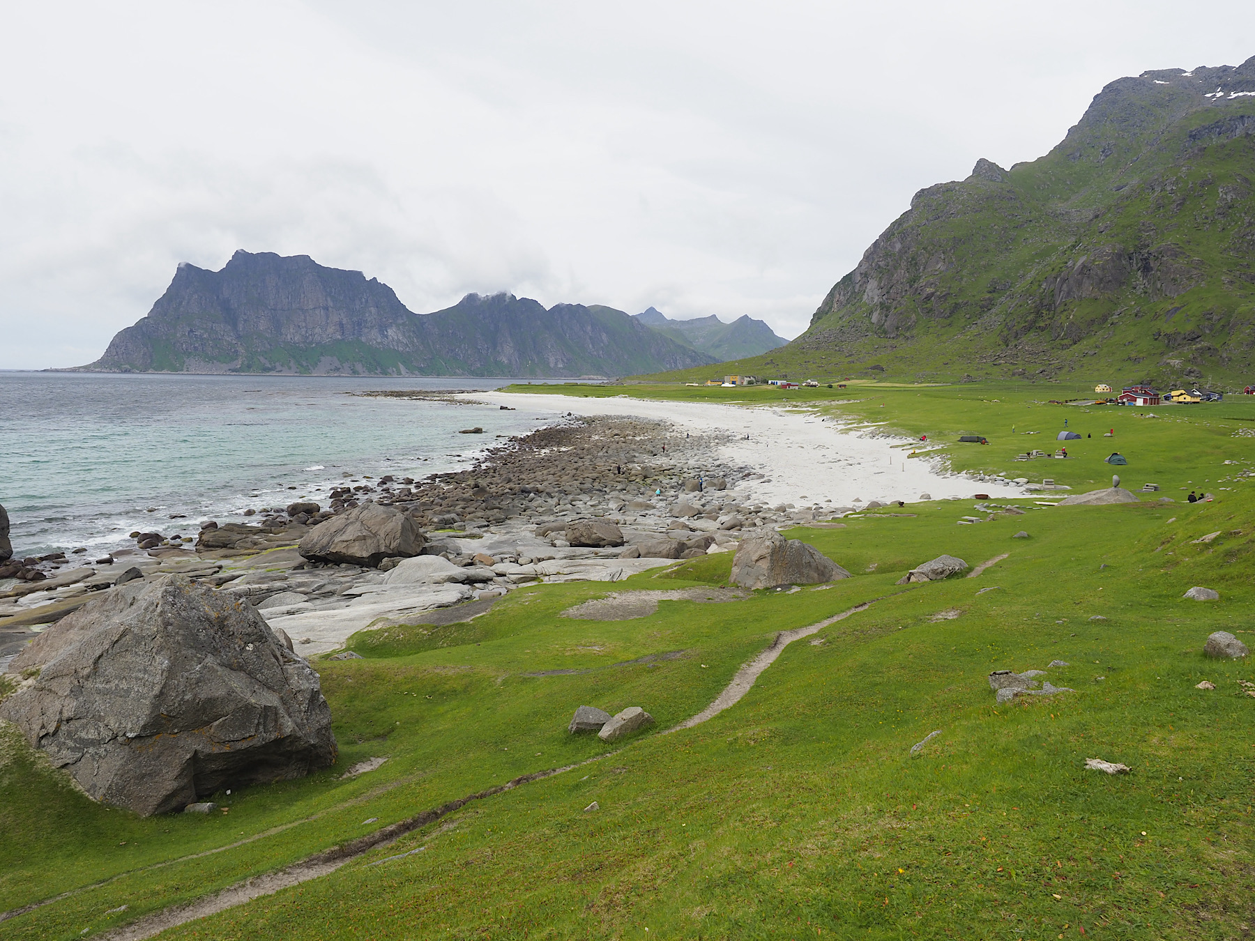 Wir quetschen uns am Haukland Parkplatz in eine gerade frei gewordene Lücke. Von hier wollen wir einen Spaziergang zum Uttakleiv Strand machen. Hin und zurück ca. 2 Stunden über flaches Terrain. Bergwanderungen sind aufgrund meiner schmerzenden Waden heute nicht machbar. Der Uttakleiv Strand ist ebenfalls ein absoluter Hammer. Er ist etwas abgelegener und der Parkplatz teuer, deswegen ist hier weniger los. Ein Traum. Mit ein bisschen Sonne würden auch die Bilder nach was aussehen.