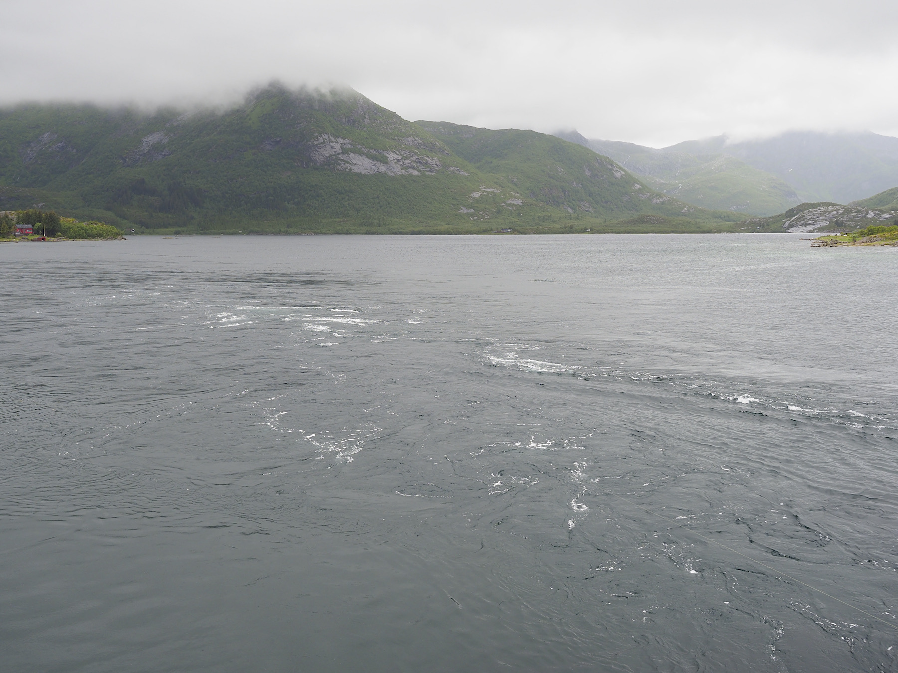 Aber zuerst fahren zurück nach Svolvær einkaufen. Es regnet nämlich. Und der soll den ganzen Tag anhalten. Wir haben also Zeit. Zuerst gehen wir in den Kiwi, dort haben wir einen Parkplatz gefunden. Danach stocken wir im Vignmonopolet unseren Weinvorrat ein wenig auf. Der von zu Hause mit gebrachte, reicht nicht. Auf der Fahrt fällt uns auf, wie stark die Flut in den Fjord drückt. Dies ist an den Brücken ist das gut zu sehen.
