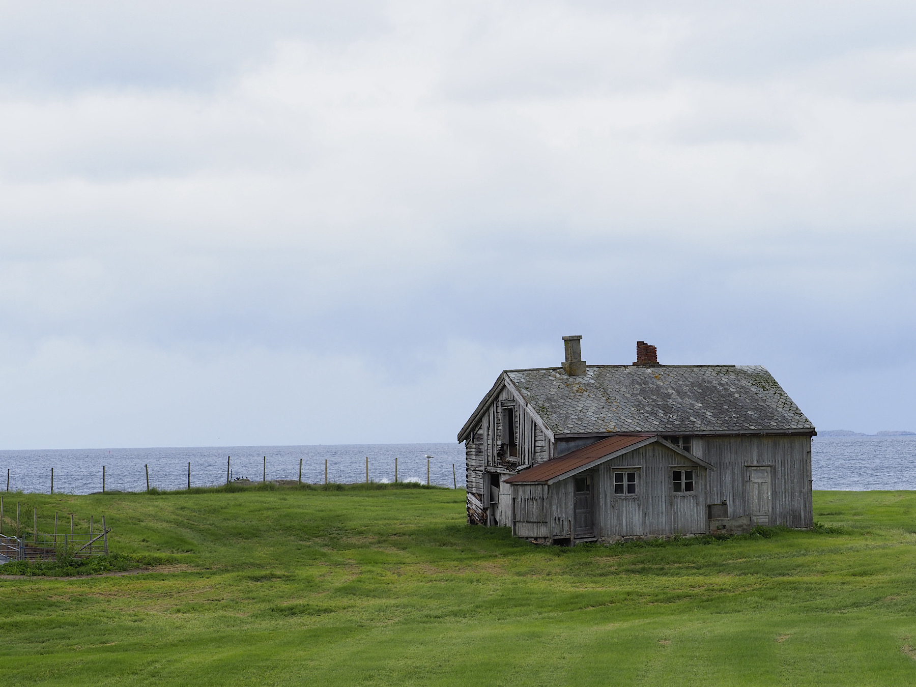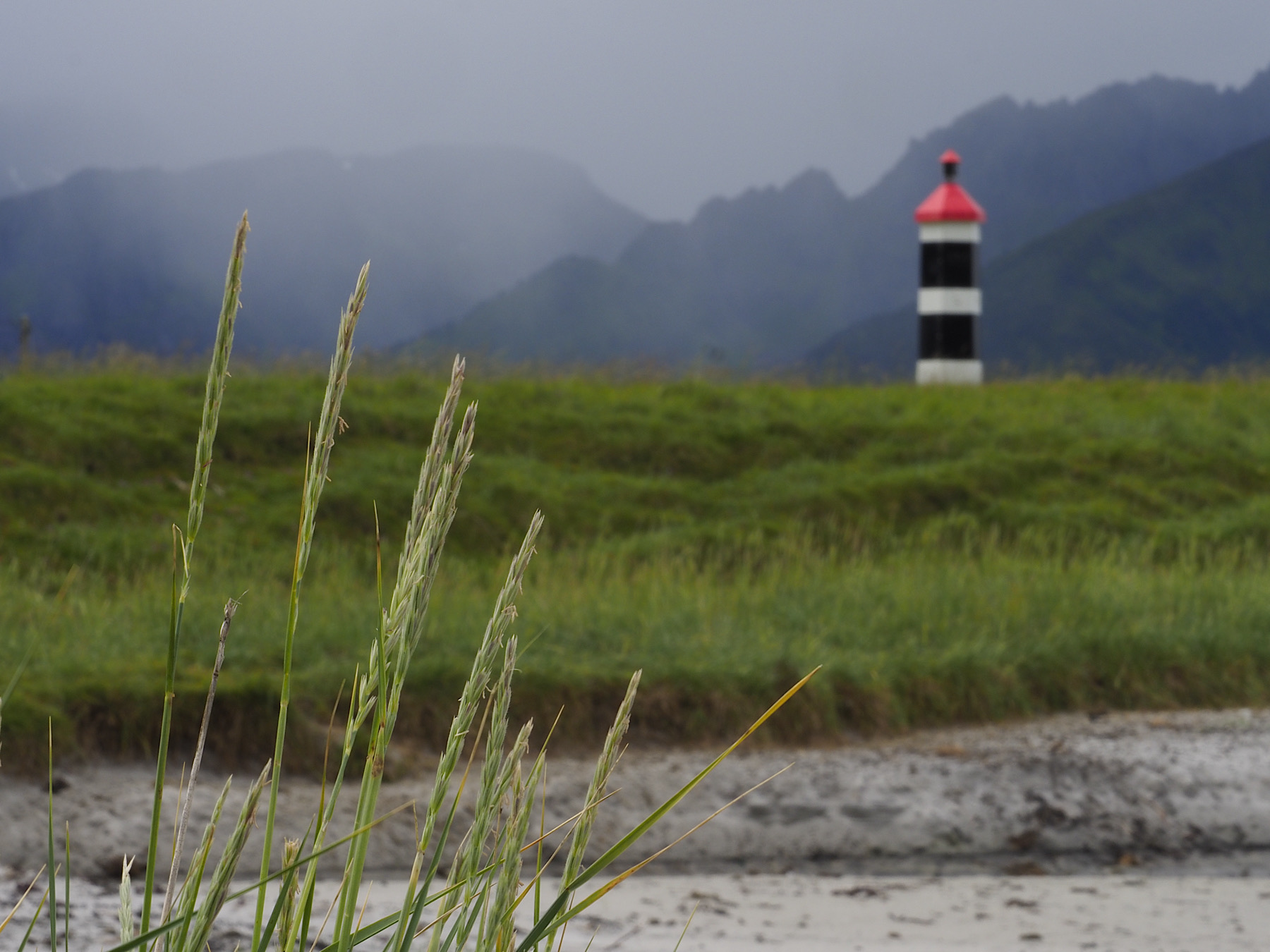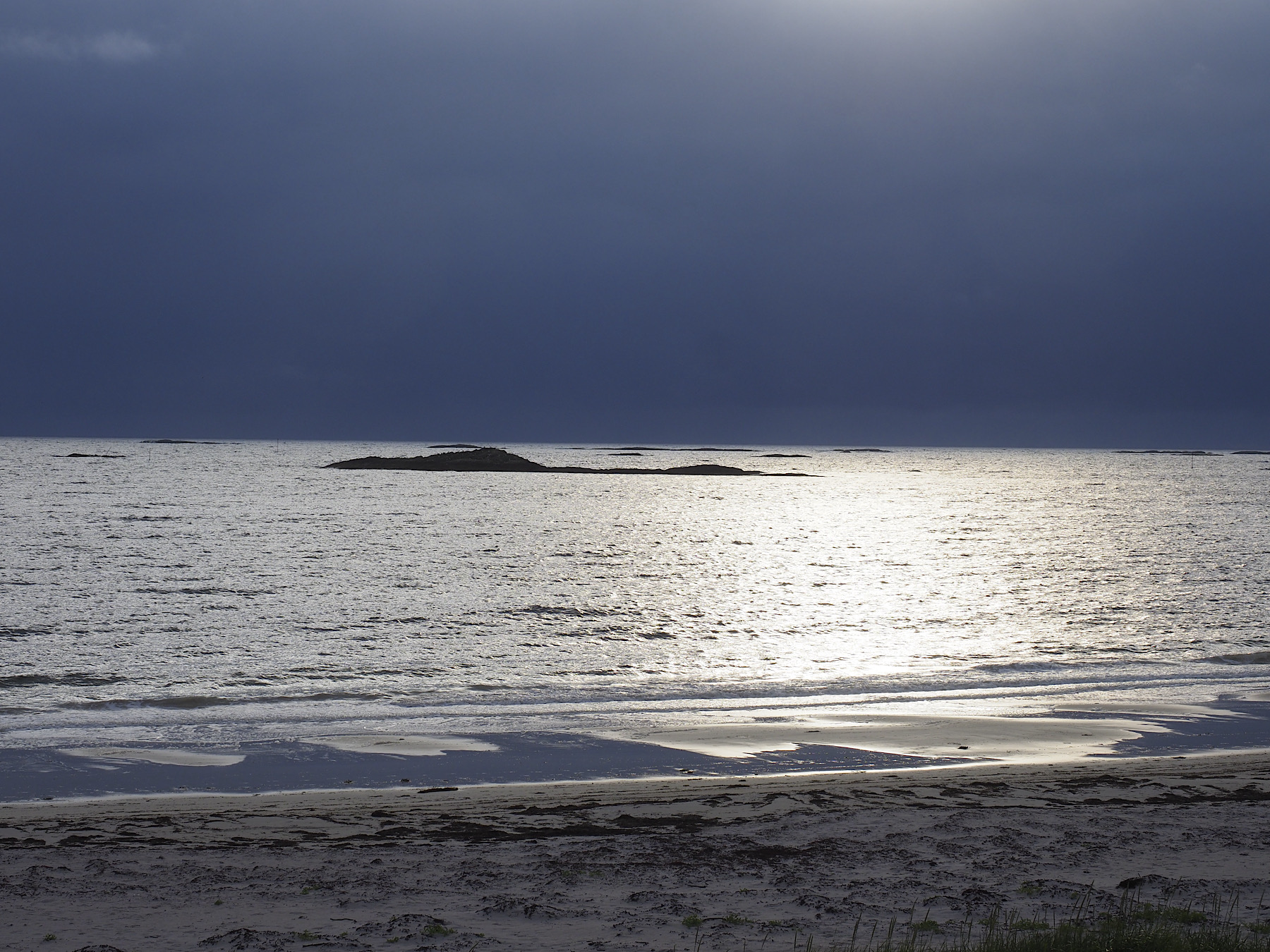 Als wir dann so gegen 12:00 Uhr los kommen, schickt uns die Sonne ein paar vereinzelte Strahlen durch die Wolken. Gerade so als wollte sie beweisen, dass sie noch existiert. Wir umrunden den südlichen Teil von Andøya und fahren zum Hvit Strand, den wir gestern nur aus einiger Entfernung gesehen haben. Der Strand liegt relativ einsam, lediglich eine Dauercamper “Siedlung”, und ausreichend Platz für 3 Camping Fahrzeuge, läßt erahnen, dass sich hier ab und an Menschen aufhalten. Die Brandung ist stark, es hat viel Seegras und der Wind pfeift wieder heftig. Nachdem wir den Strand einmal auf- und abgelaufen sind, schwingen wir uns wieder ins Auto.