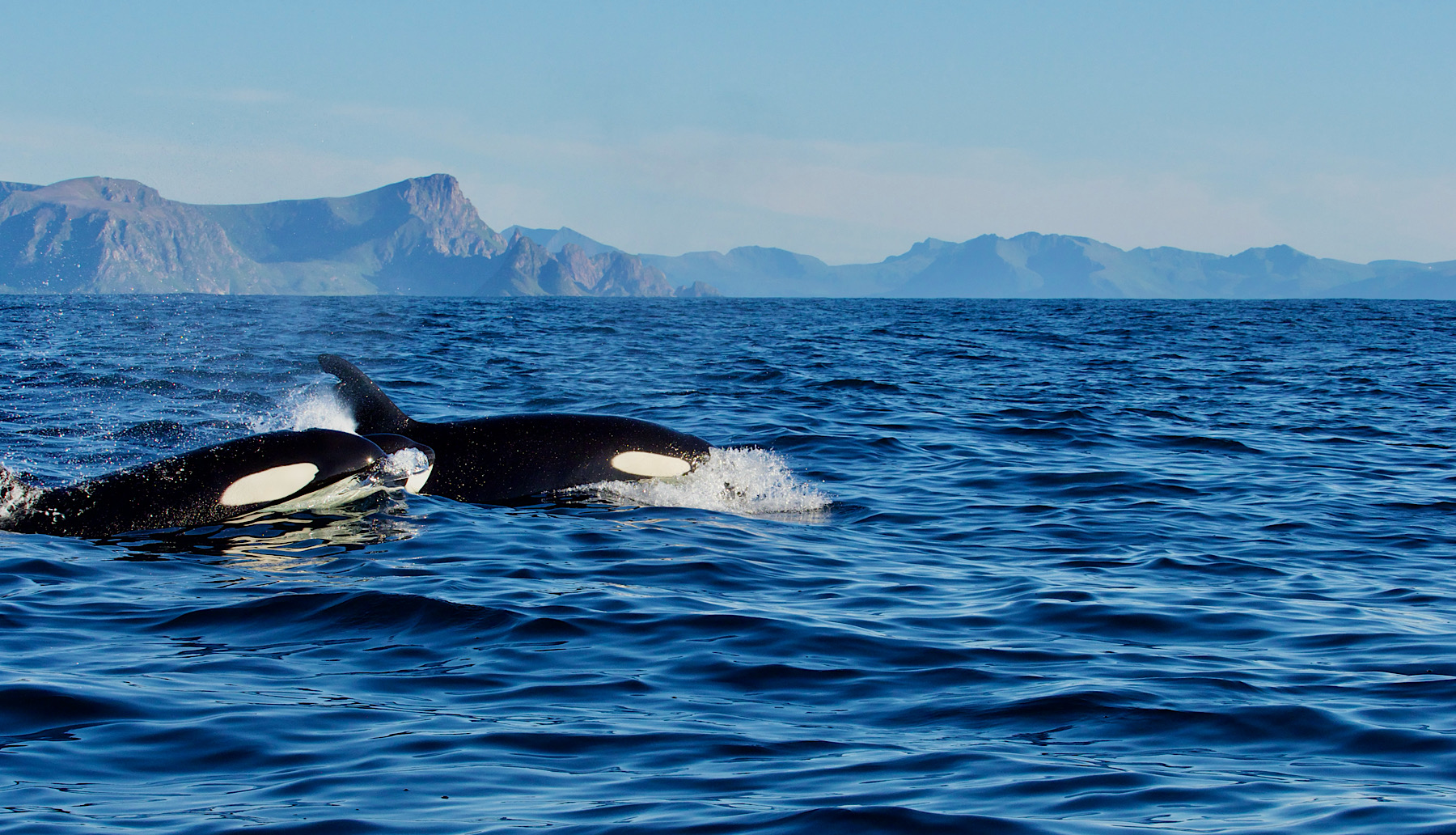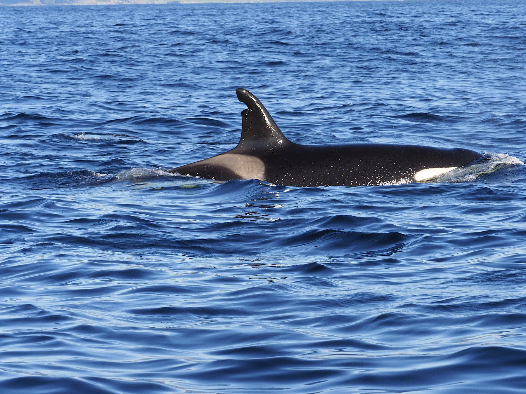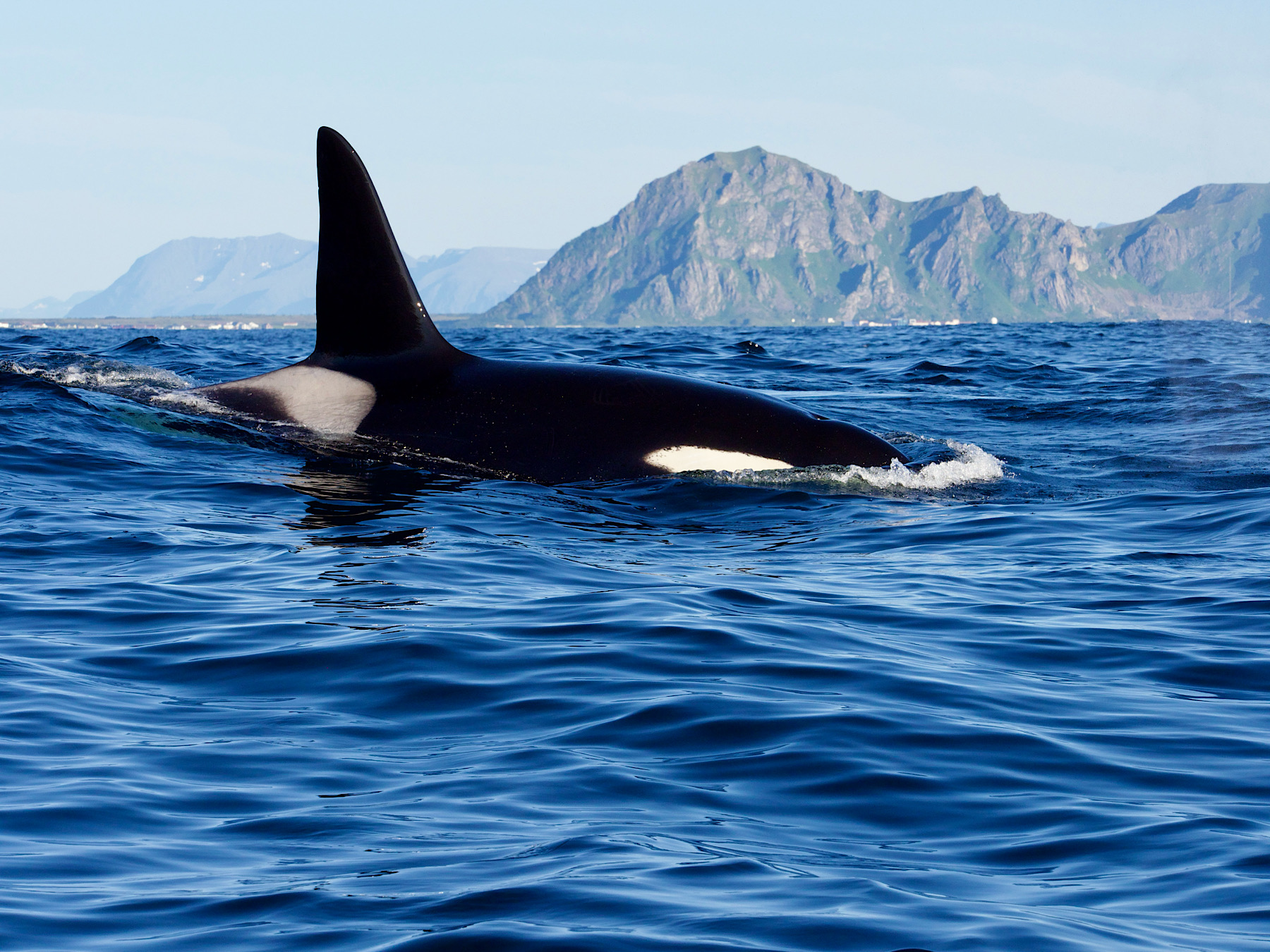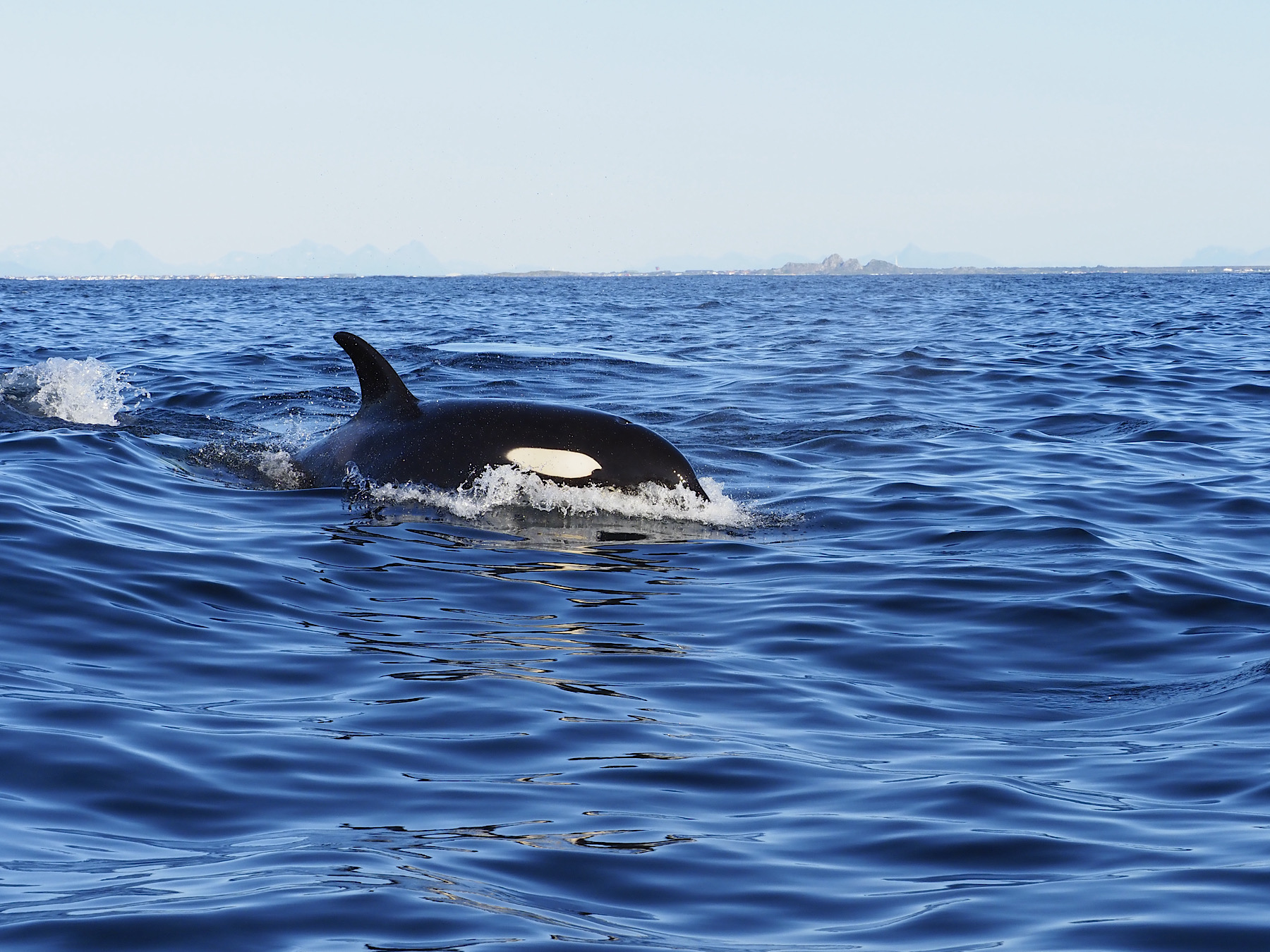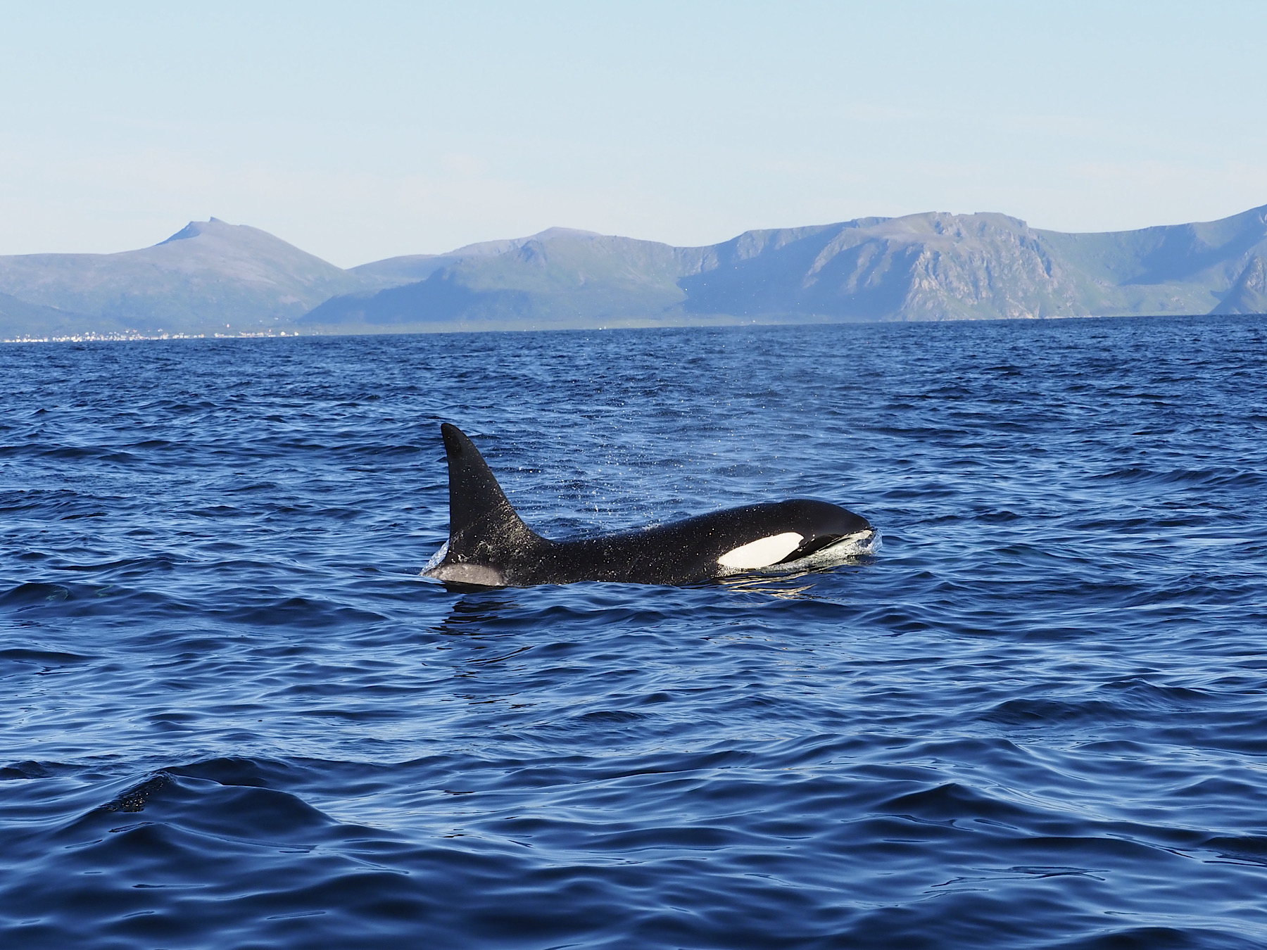 Recht schnell, sehen wir eine Gruppe Orcas, 10 Stück in etwa. Fantastisch diese Tiere so nah erleben zu können. Sie haben Jungtiere bei sich und sind schnell unterwegs. Wir begleiten sie. Etwas später teilt sich die Gruppe und sie schwimmen eher kreuz und quer. Wir begleiten sie bis wir dann nach 2 Stunden die Rückfahrt antreten. Auf dem Weg zurück sehen wir noch Puffins aus der Ferne, aber keine anderen Wale mehr. Wir kehren rundum zufrieden zurück. Fantastisches Wetter. Wir parken am Fähranleger, da wir morgen mit der ersten Fähre auf die Insel Senja wollen.