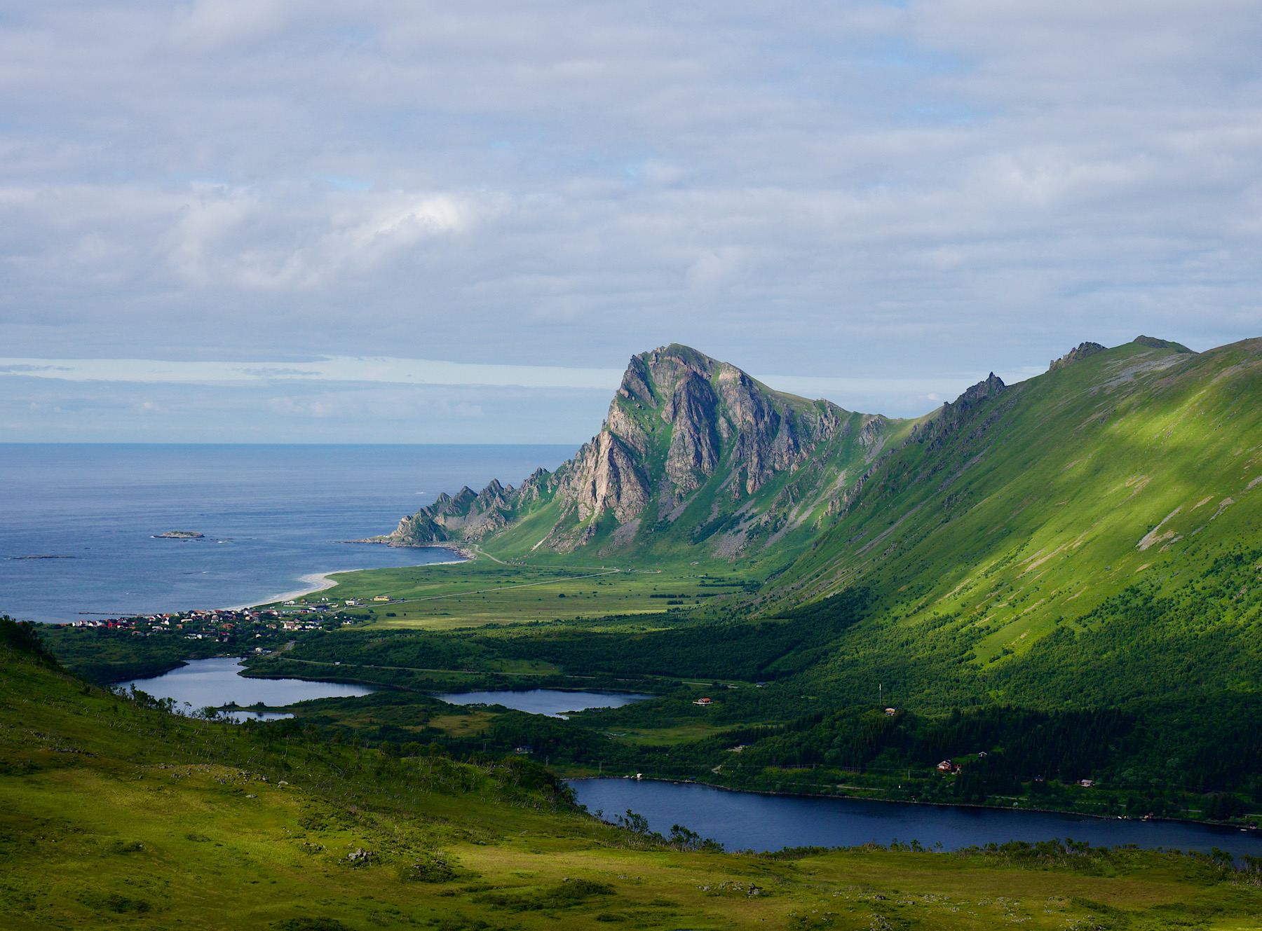 Wir schaffen es in der Tat, so gegen 15:30 zum Måtinden aufzubrechen. Die Wanderung ist im Nordlandblog ausführlich und gut beschrieben. Die ersten 300 Höhenmeter geht es wirklich steil bergauf. Zwischendrin müssen wir über ein Geröllfeld kraxeln. Ziemlich mühsam, aber machbar. Wir erreichen die Hochebene und haben einen schönen Blick auf Bleik. Klasse!