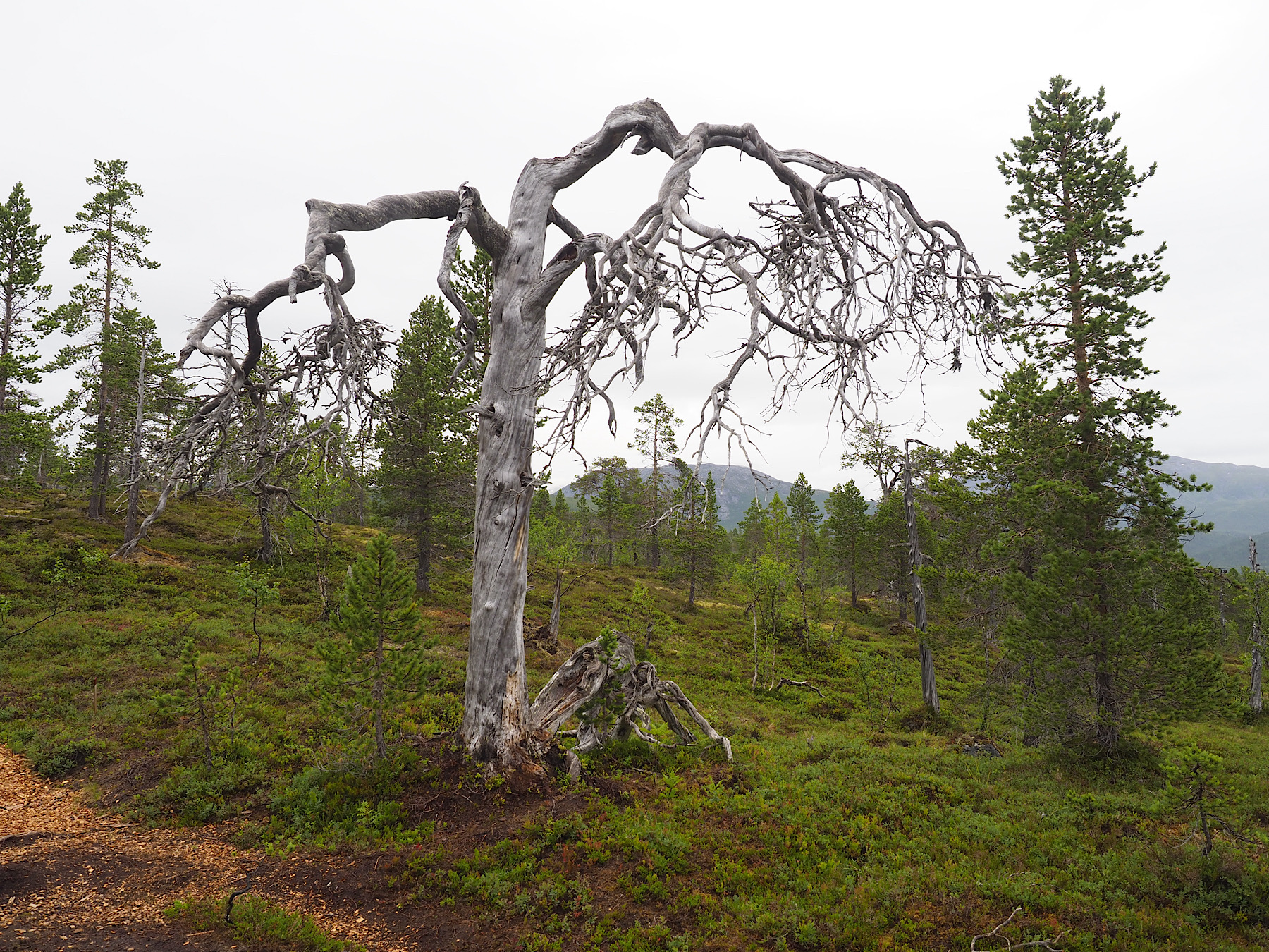 Bei leichten Nieselregen brechen wir in den Park auf. Ja, es regnet mal wieder, aber nur leicht. Über Schotter, Holzplanken und Wege führt der gut markierte Weg durch einen lockeren Mischwald, der primär von Birken und Kiefern bewachsen ist. Die Bäume weisen viel Totholz auf und mittendrin stehen immer wieder tote, verbleichte Bäume, wie Skulpturen in der Landschaft. Für mich als Bonsailiebhaber ein Traum. Ich liebe diesen Nationalpark, auch bei Regen.