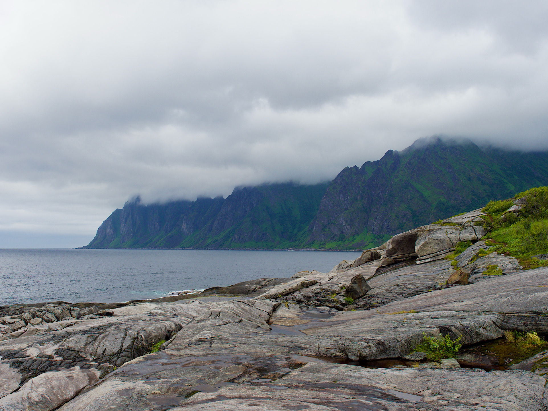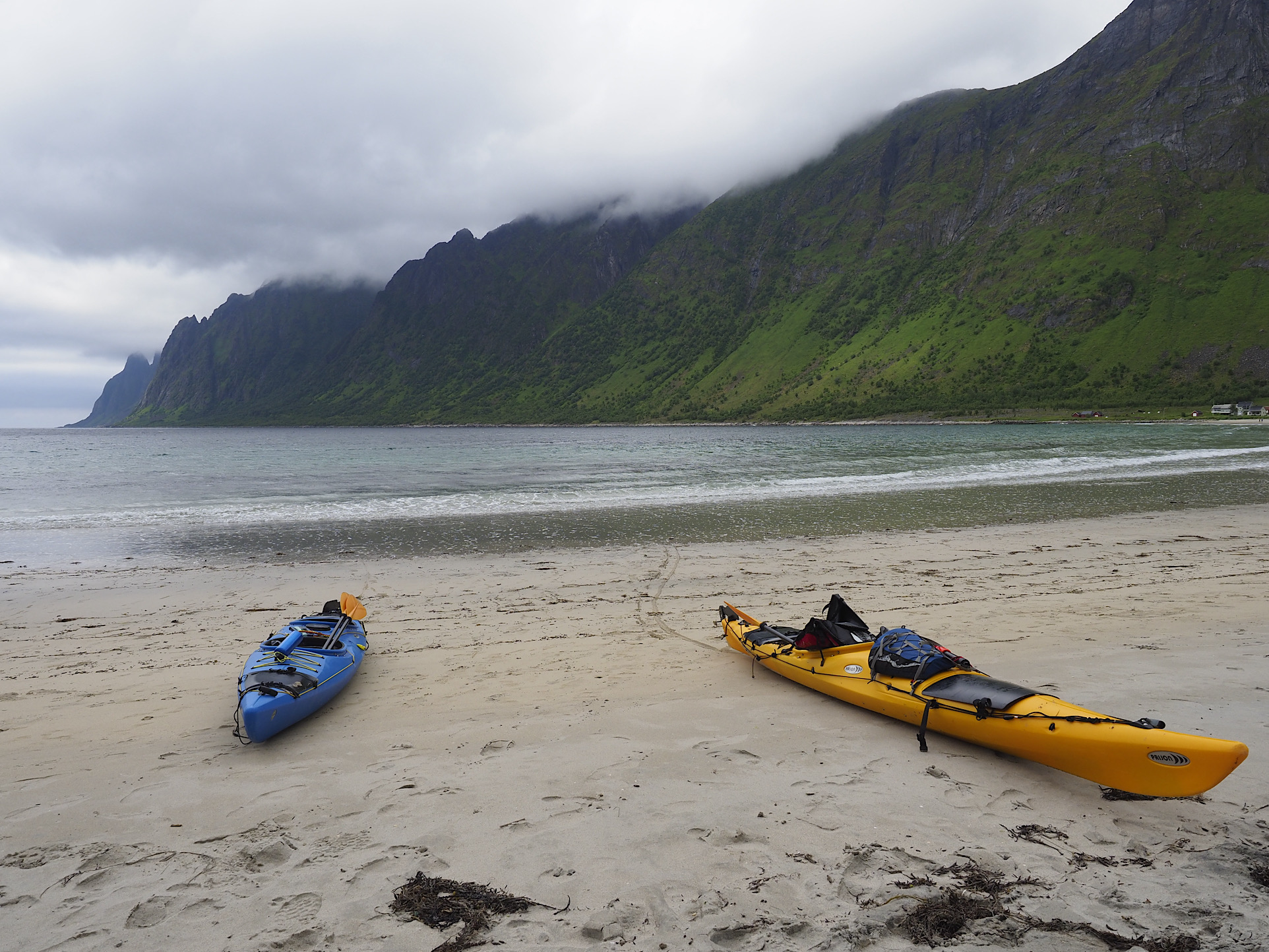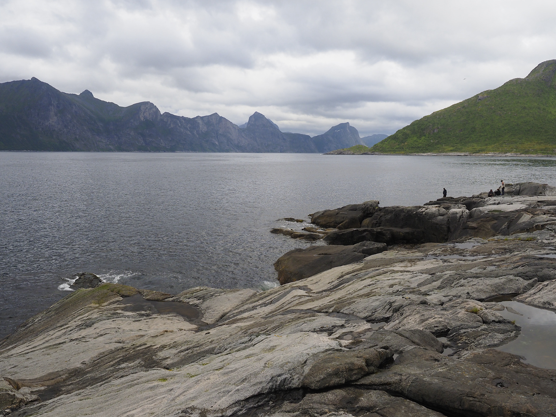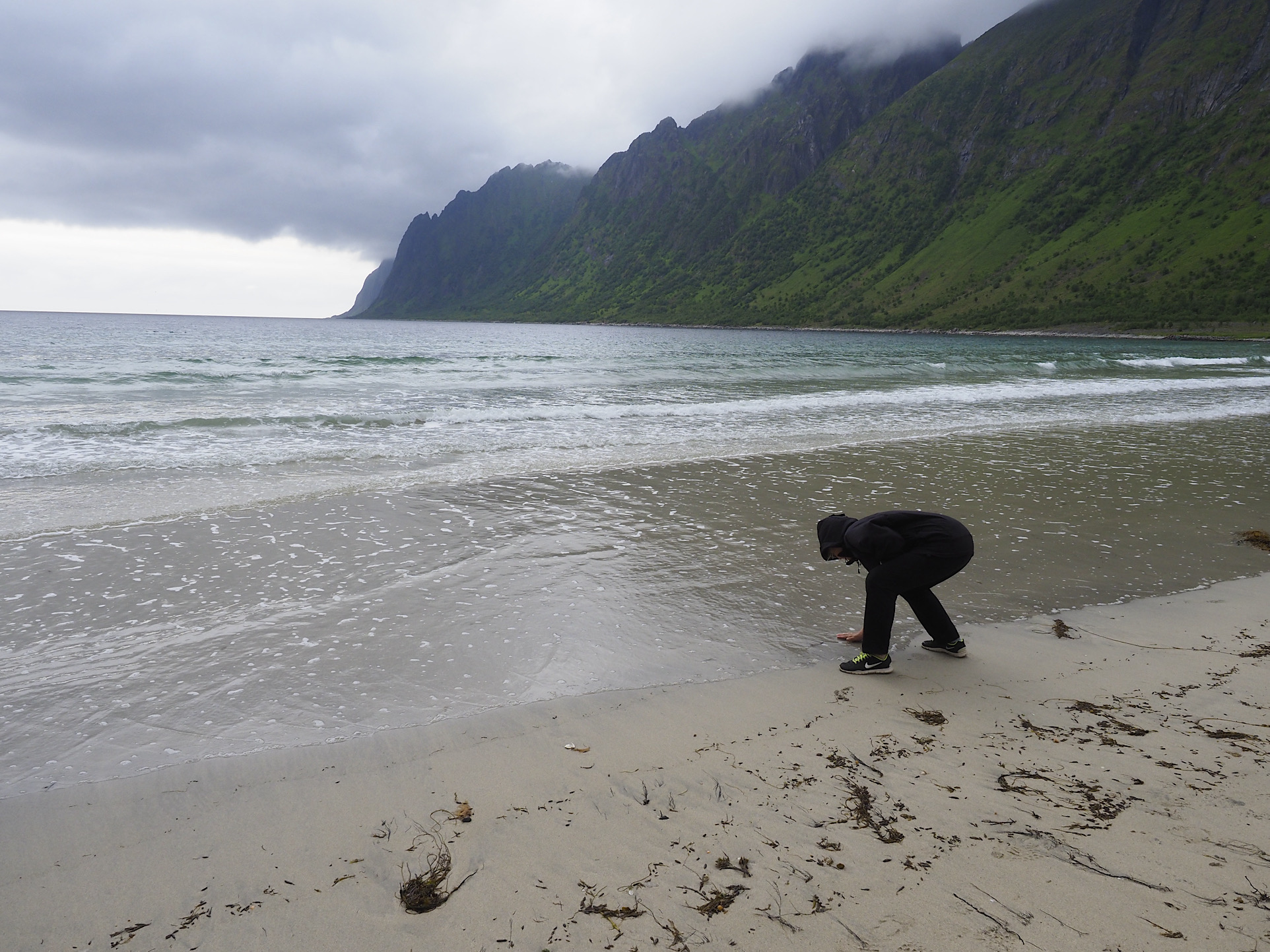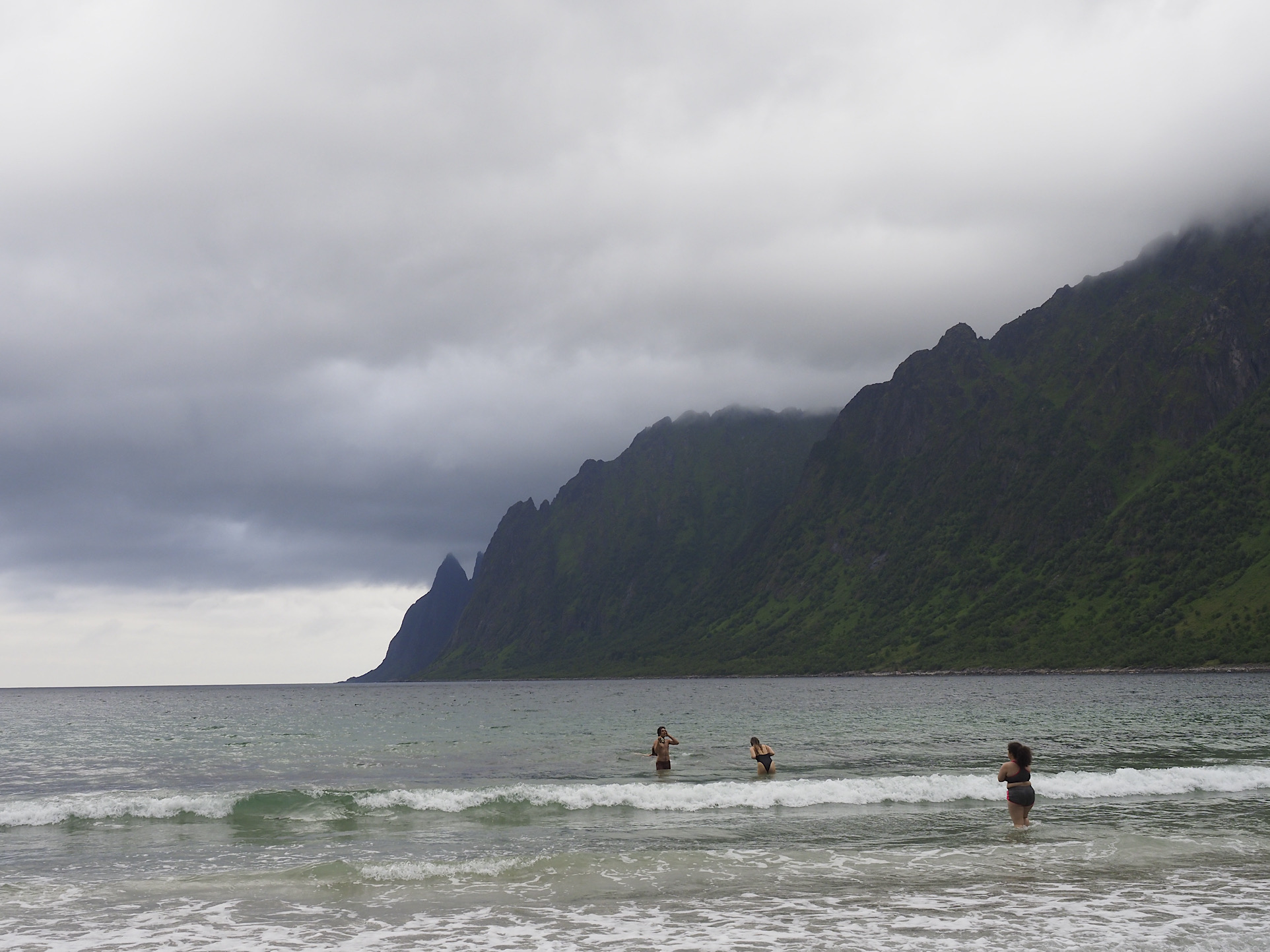 Danach geht es zum Strand Ersfjord. Wieder ein sehr schöner Strand, der durch massive, steile Felswände eingesäumt ist. Wir genießen diese fantastische Atmosphere und laufen am Strand zwei mal auf und ab. So langsam steigt das Stimmungsbarometer wieder etwas.