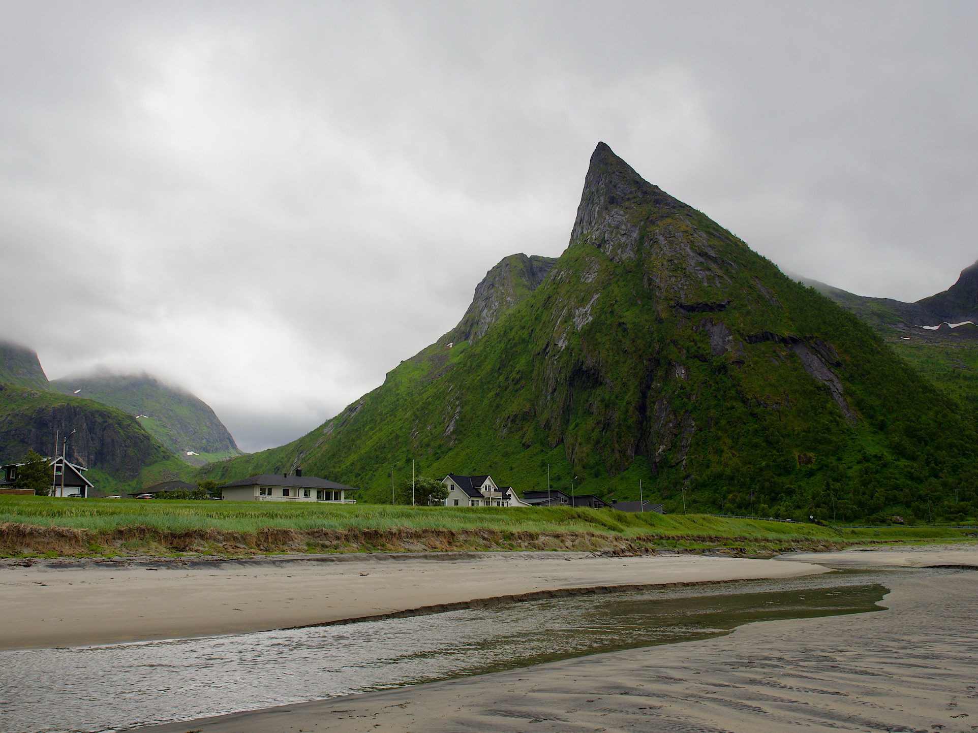 Nach einem Tee geht es dann weiter nach Mefjorden, eine kleine Ortschaft, die uns gut gefällt. Von hier kann man auf den Knuten wandern. 110 Höhenmeter sind hierfür zu überwinden. Oben wird man mit einem tollen Blick auf die Mitternachtssonne belohnt. Da weder die Sonne scheint, noch die Uhr Mitternacht anzeigt, steigen wir nicht hoch. Wir unternehmen zwar einen zaghaften Versuch, brechen aber ab, da der Weg sehr schlecht ist.