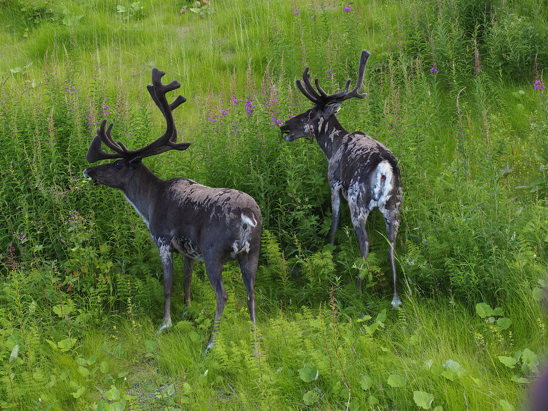 Um 18:00 Uhr kommen wir dann mit der Fähre mit. Die Fahrt nach Tromsø führt uns durch eine atemberaubende Landschaft. Ich lege allerdings keine Fotostopps mehr ein, um nicht zu spät in Tromsø anzukommen. Als dann rechter Hand, inmitten einer Ortschaft auf einem Grünstreifen, eine Gruppe Rentiere auftaucht und dort gemütlich grast, mache ich eine Ausnahme. Irgendwie surreal.
