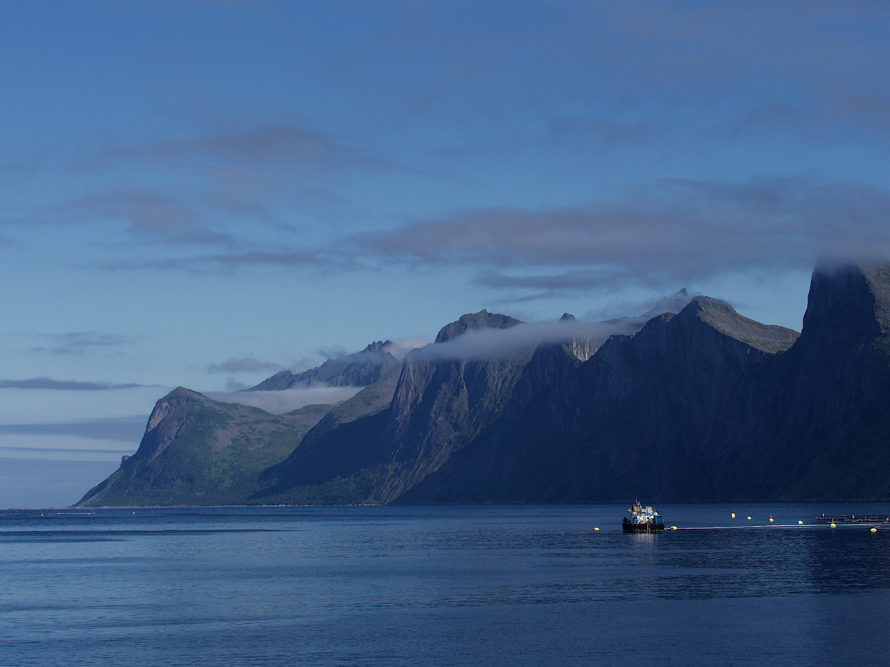 Der Forecast für heute prophezeit uns einen klaren, wolkenlosen Himmel. Unser erster Stop, den wir ansteuern ist der Aussichtspunkt Tungeneset, von dem die Teufelszähne gut zu sehen sind. Dies ist eine markante Bergformation. Bei unserem ersten Stop hatten diese sich hinter Wolken versteckt. Schon während der Fahrt dahin realisieren wir, das der wolkenlose Himmel irgendwo anders sein muss. Aber nicht hier. Als wir dann am Parkplatz Tungeneset ankommen, ist dieser brechend voll. Ich stelle mich in die Einfahrt und warte bestimmt 10 Minuten. Niemand fährt weg. Da aber auch heute die Teufelszähne von Wolken verhüllt sind, ist das nicht so tragisch und wir fahren einfach weiter.