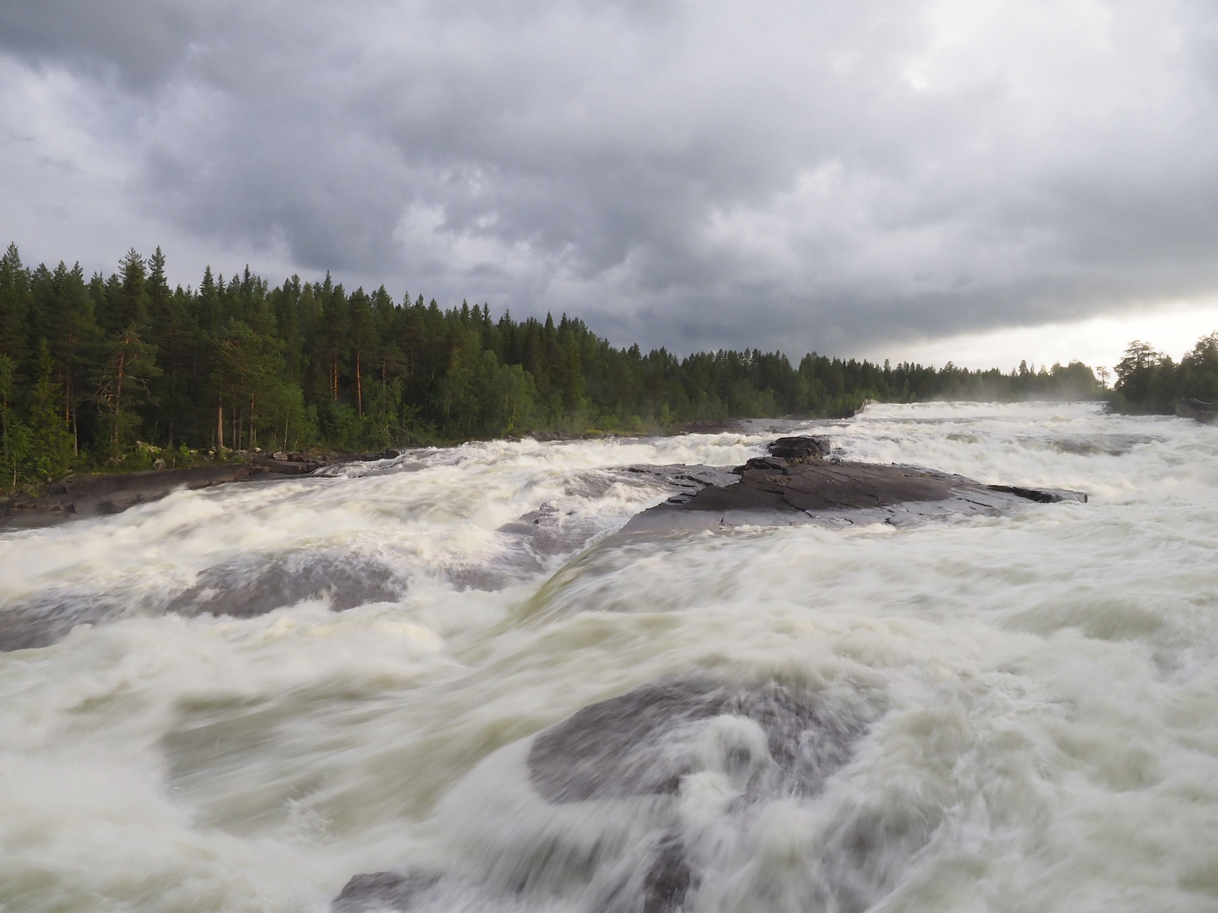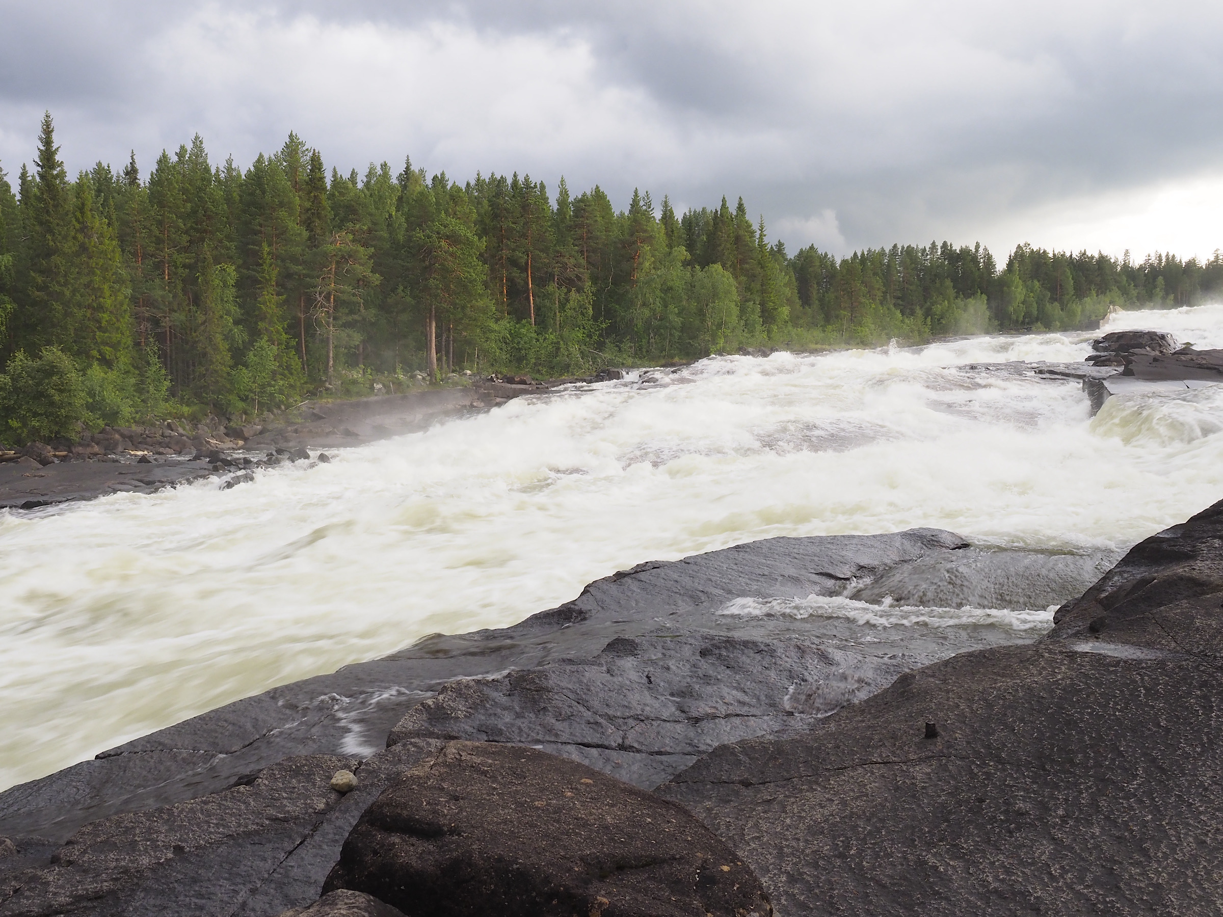 Unser nächstes Ziel ist der Storforsen. Eine gewaltige, beeindruckende Stromschnelle. Der erste kurze Spaziergang wird abrupt durch einen Regenschauer unterbrochen. Da wir im angrenzenden Campingplatz übernachten, verschieben wir eine ausführlichere Erkundung auf morgen.