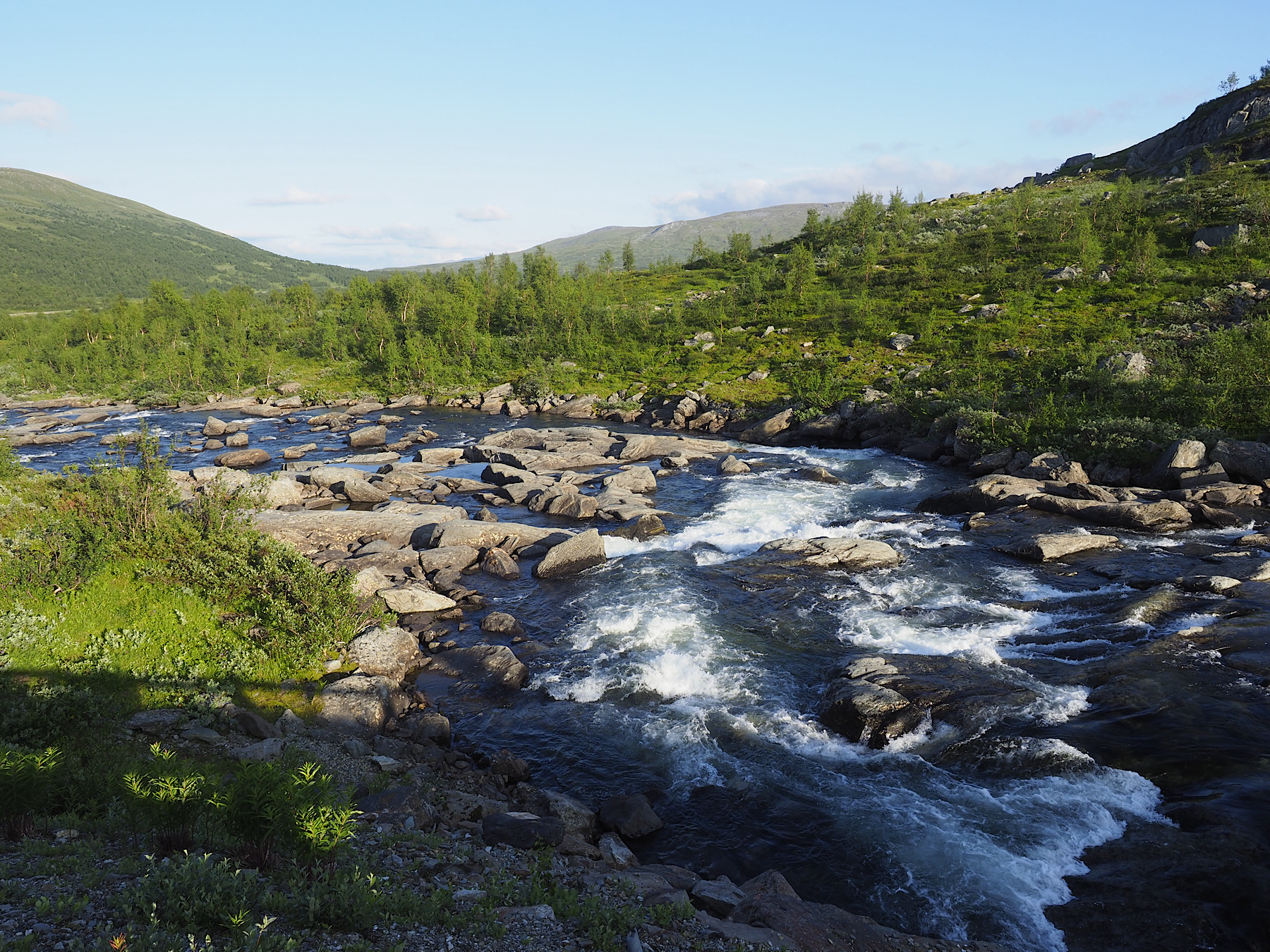 Bei Klimpfjäll wird das Wetter besser, die Sonne ist zu sehen und setzt die Landschaft in ein wunderschönes Licht. Wir können einen sagenhaften Blick über ein weiss, lila Blumenfeld auf den See Kultsjön mit fantastisch anzusehenden, grünen Inseln erhaschen. Wunderschön.