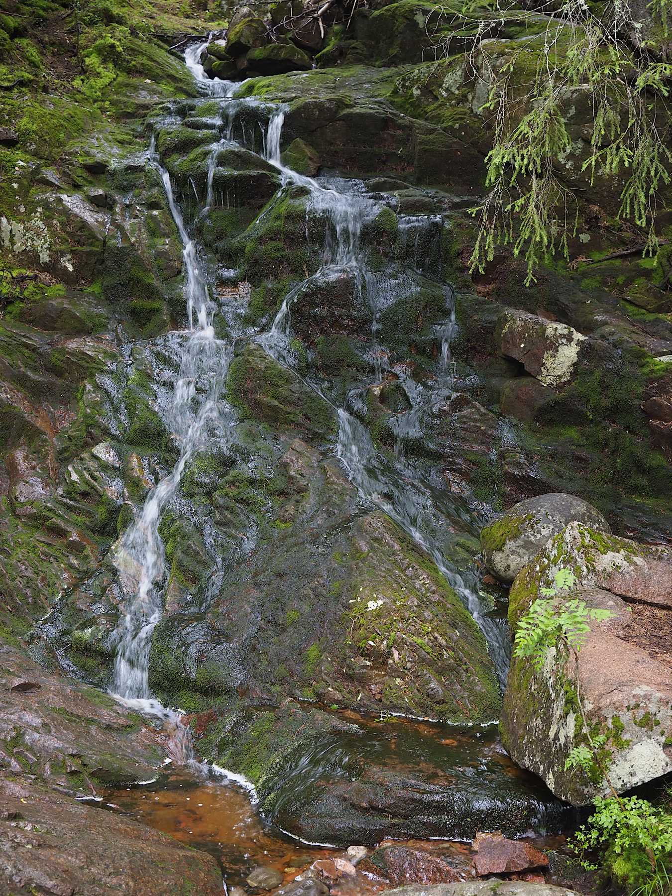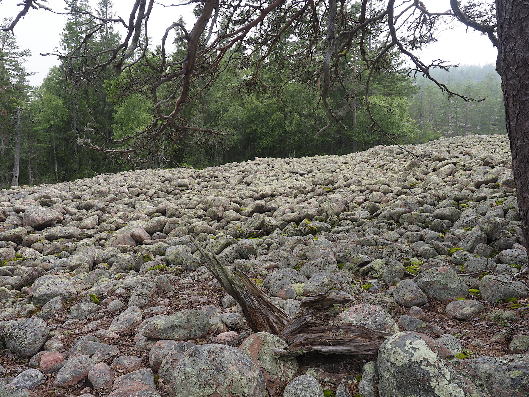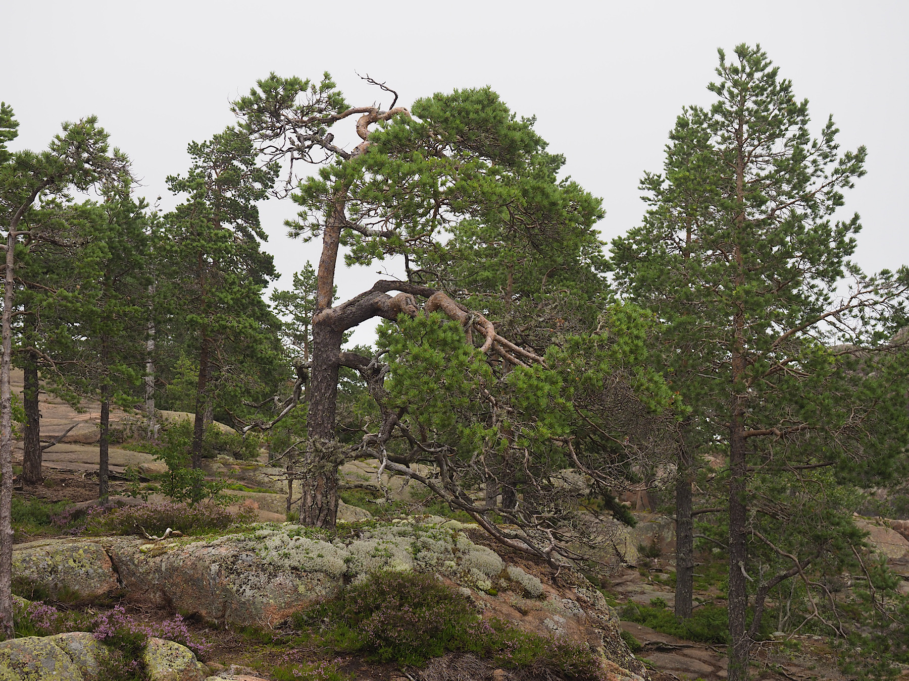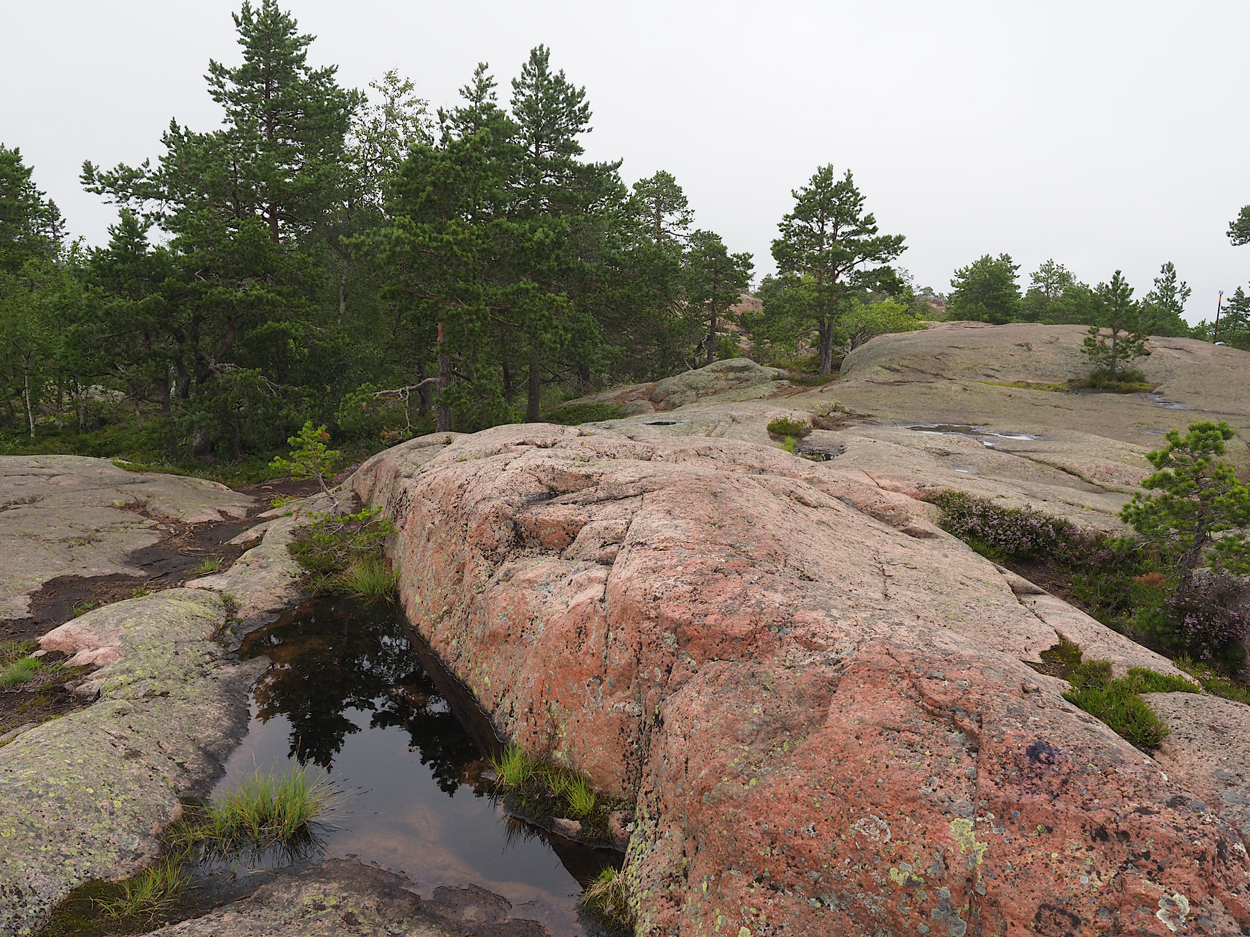 Der Weg führt zunächst über Bohlen durch einen Tannenwald. Später kraxeln wir über Steine und Wurzeln. Und am Ende artet es wirklich in Kraxelei aus. Da es geregnet hat, sind die Wurzeln nass und sauglatt, was mir auch beim Abstieg zum Verhängnis. Mich haut es hin. Glücklicherweise passiert nichts. Interessant ist, das mein, mittlerweile betagtes iPhone XR, das wohl mitbekommt und Emergency Anrufe an Renate startet. Das geht locker über eine halbe Stunde lang, keine Ahnung wie ich das stoppen kann. Oben auf dem Slattsalskrevan hat man theoretisch einen tollen Ausblick auf die Höga Kusten. Leider versteckt sich dieser heute unter Wolken.