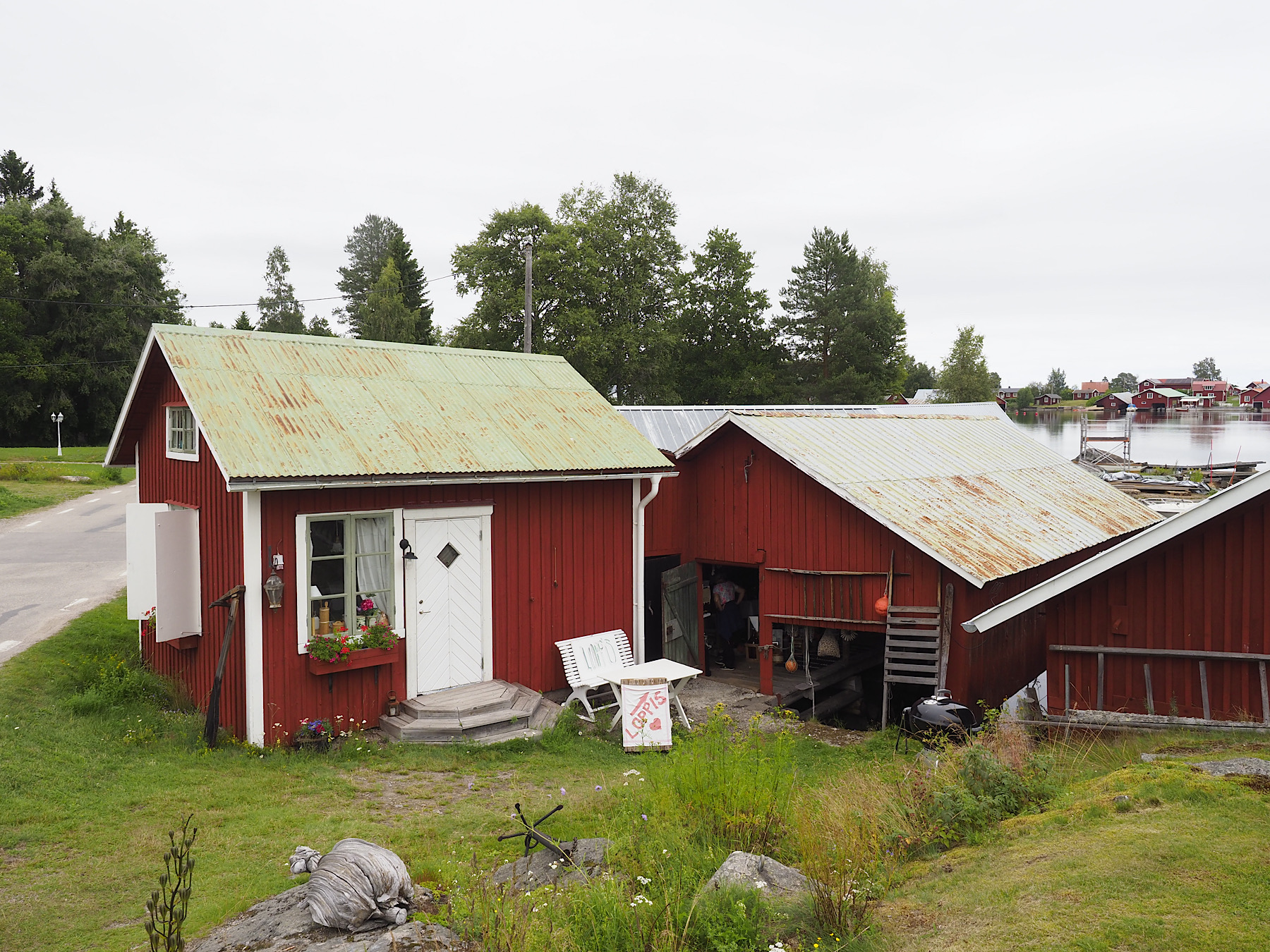 Wir schlendern also weiter durch den Ort. Renate verschwindet in den kleinen Häusern, in denen gebrauchte Artikel (Loppis) zum Verkauf angeboten werden. Am Ende des Dorfes staunen wir nicht schlecht, als wir auf einen großen Parkplatz stoßen, der voller Autos steht. Wow! Was machen die Leute hier. Die Antwort auf diese Frage bekommen wir als wir am Restaurant Albertina vorbeilaufen. Das ist wieder gestopft voll.