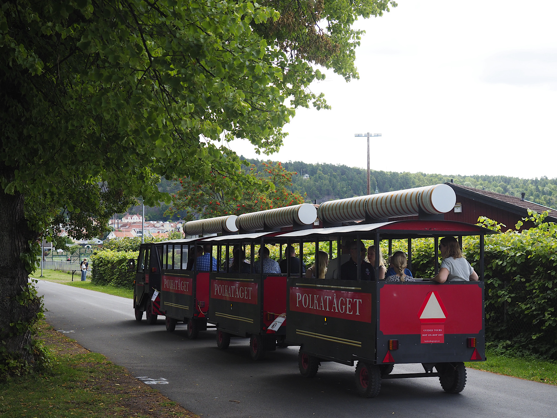 Als wir Gränna erreichen, frage ich Renate, wie wir das Zentrum finden. Die Antwort: Gränna ist so klein, dass wir das gar nicht verfehlen können. Am Ende, nehmen wir dann doch das Navi zu Hilfe und parken in der Nähe des Fährhafens an einem Feldrand. Von wegen klein: Hier ist die Hölle los. Das Dorf, die Stadt, quillt über vor Touristen. Am Fährhafen drängen sich die “Fresstände” und Touristen. Viele wollen mit der Fähre nach Visingsö übersetzen. Die Sprache verschlägt es mir entgültig, als uns eine Hop-On-Hop-Off Bahn passiert. Was ist denn hier los?