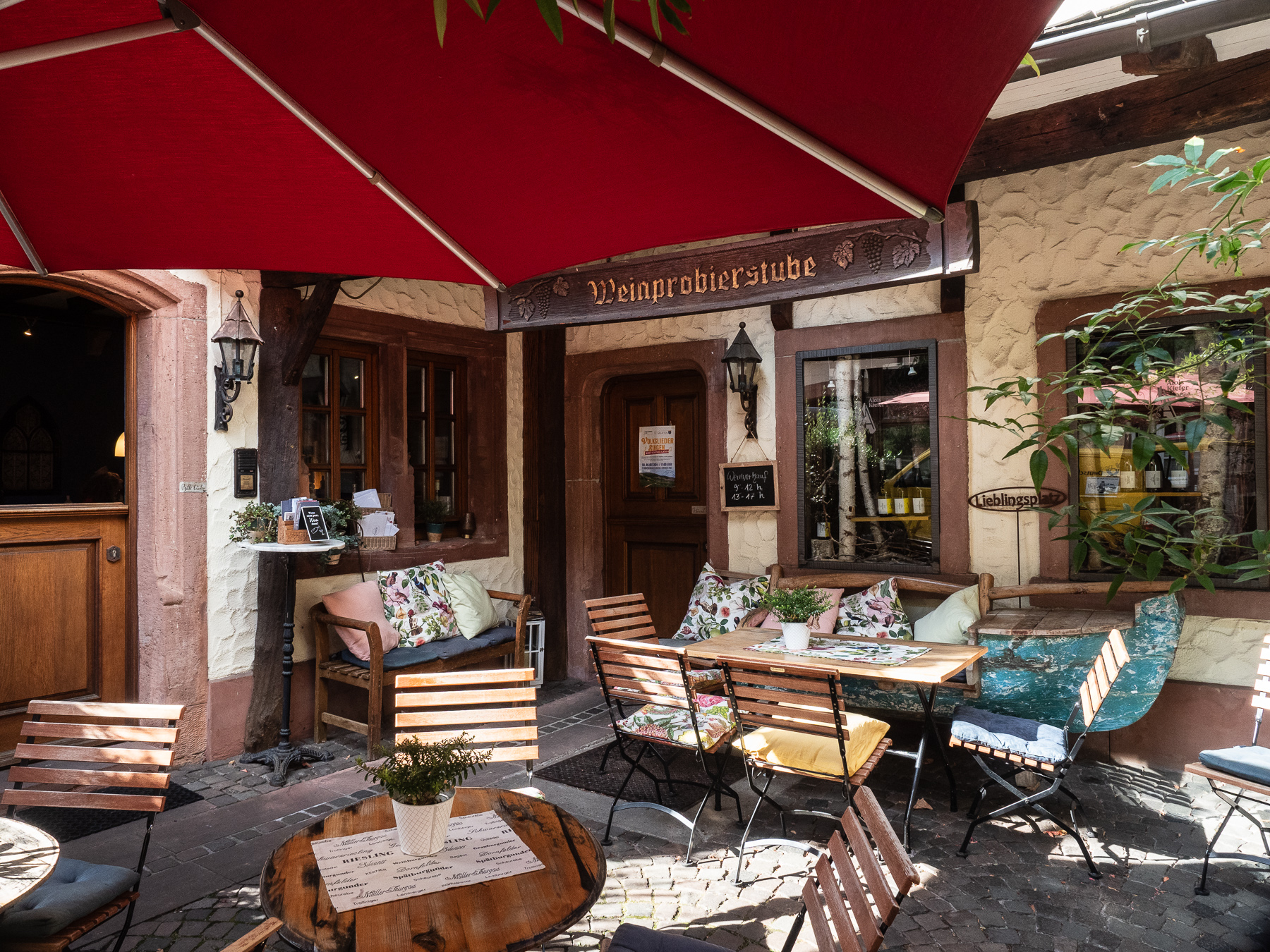 Wir verlassen Nierstein mit Ziel Rhodt unter Rietberg. Hier sind wir erneut mit anderen Freunden verabredet. Aber zunächst schauen wir uns Sankt Martin an. Von verschiedenen Seiten wurde uns diese kleine Ortschaft in der Pfalz empfohlen. Am Rand des Friedhofs gibt es einen Parkplatz für Wohnmobile. Das Dorf ist von hier fußläufig zu erreichen. Auf der Webseite der Touristen Information kann man lesen, dass dies eines der schönsten Dörfer der Weinstraße ist. In der Tat macht es Freude durch die Gassen mit den schönen Häusern, Hofwirtschaften und Geschäften zu schlendern. Natürlich landen wir recht schnell in einer Straußwirtschaft. Bei Alois Kiefer nehmen wir im schönen Innenhof Platz. Ich gönne mir einen Pfälzer Saumagen. Da uns der Wein schmeckt, suchen wir noch die Weinprobierstube auf. Hier ist es urgemütlich. Es geht sehr locker zu. An den Tischen sitzen Gäste, die Weine verkosten oder einfach nur ein Weinchen geniessen.