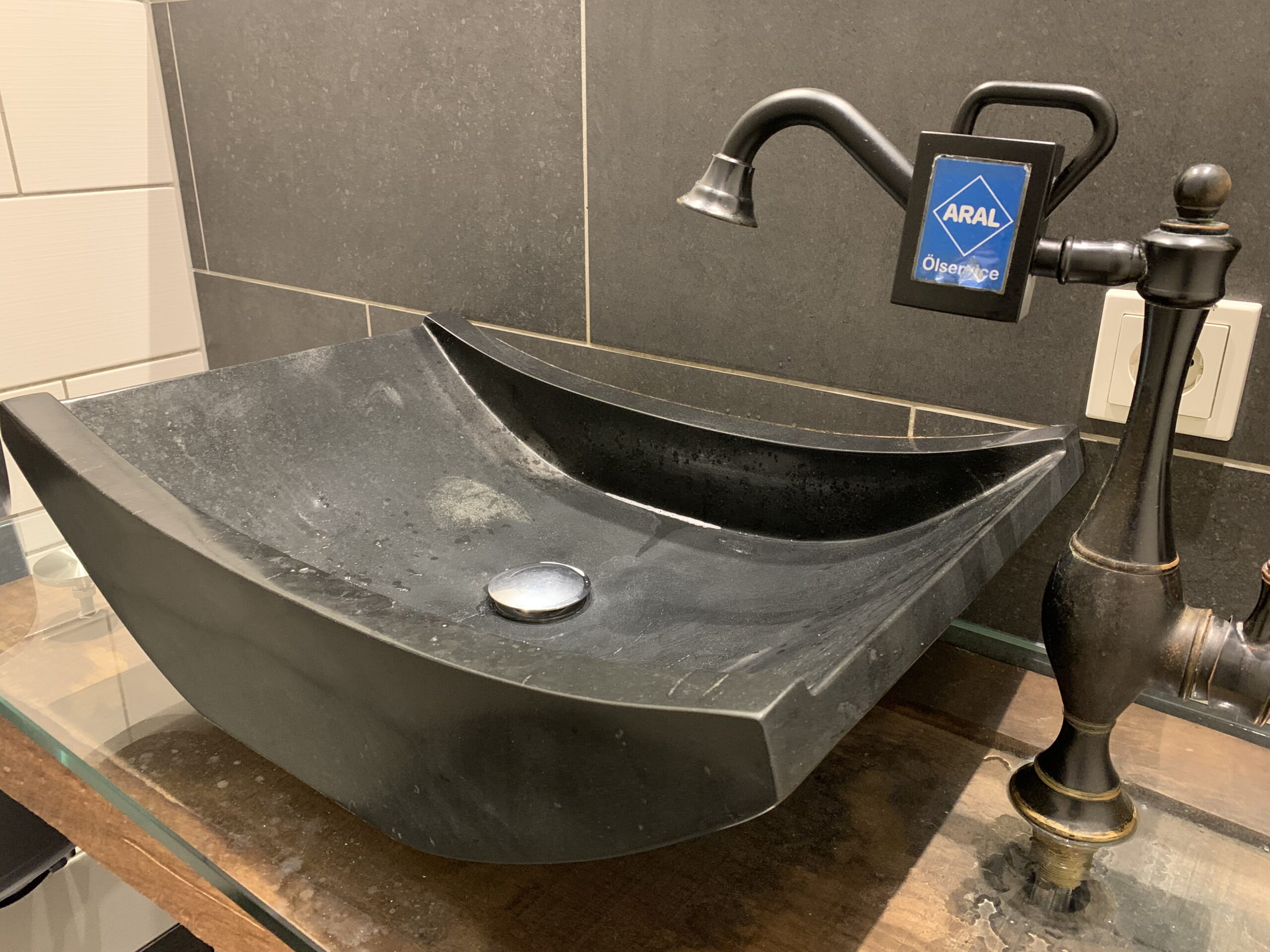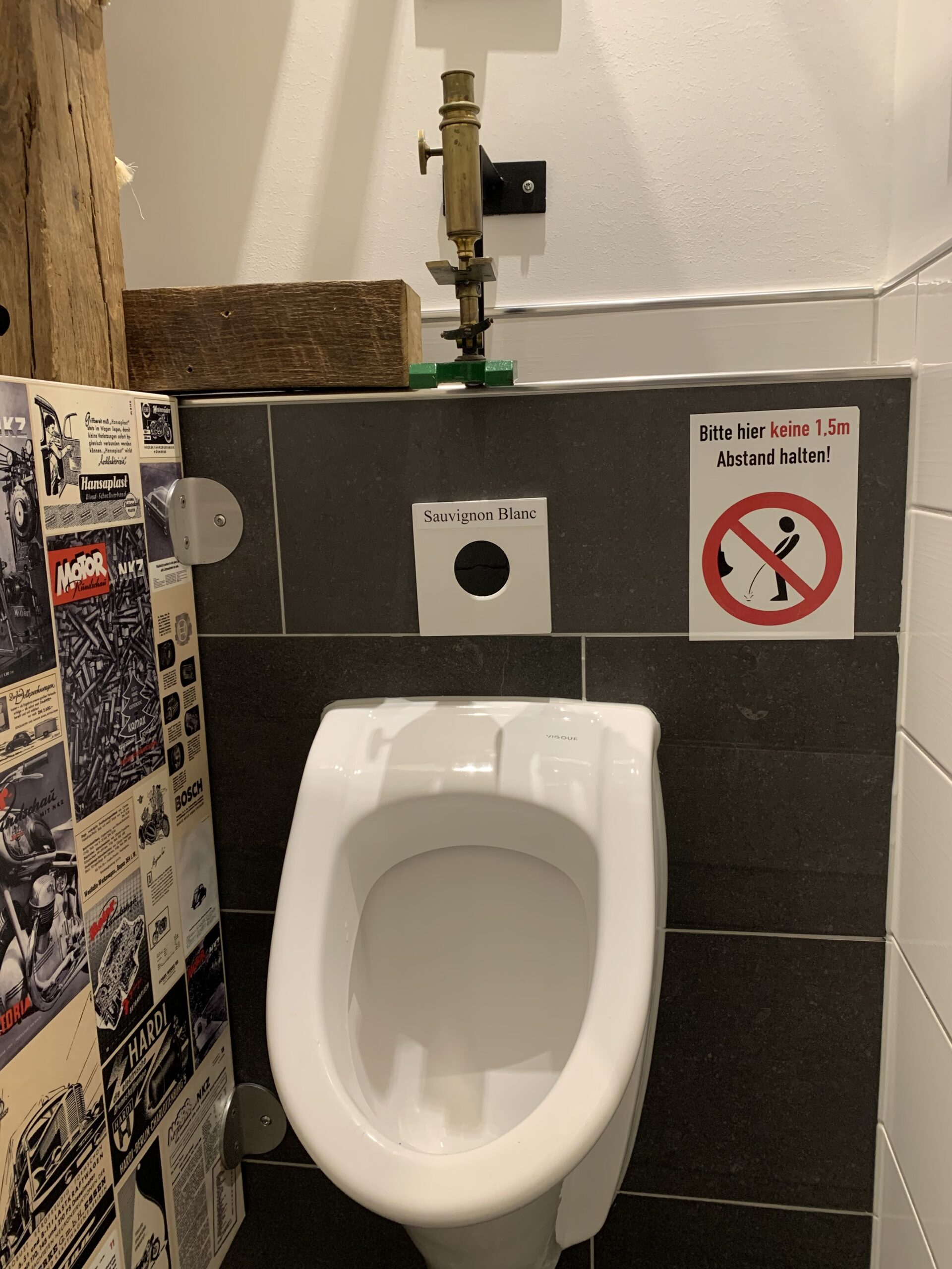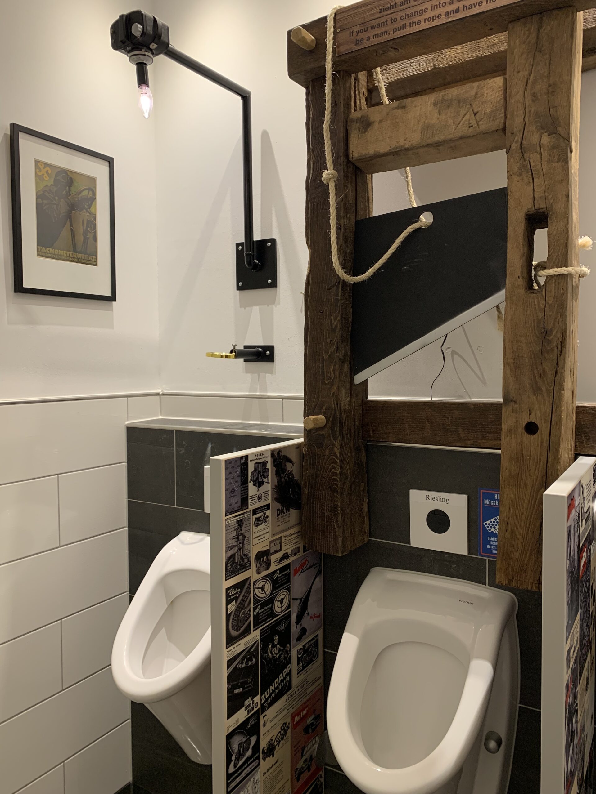 Der Ersatzplan ist jetzt in das Restaurant direkt oberhalb des Stellplatzes zu gehen. Als wir dort ankommen, hat dies zwar geöffnet, ist aber hoffnungslos überfüllt. Ein neuer Plan muss her. Nach Bernkastel wollen wir nicht mehr zurück fahren. Also entschliessen wir uns, in das nahe gelegene Zylinderhaus Restaurant zu fahren. Dort finden wir in der Tat ein Plätzchen. Die Preise auf der Speisen sind auf Norwegen Niveau. Für einen Burger mit Pommes zwischen 18 und 22€. Das Restaurant ist originell eingerichtet, man merkt das sich hier auch ein Automuseum befindet. Viele alte Autoplakate an den Wänden. Aber der Kracher ist das WC.