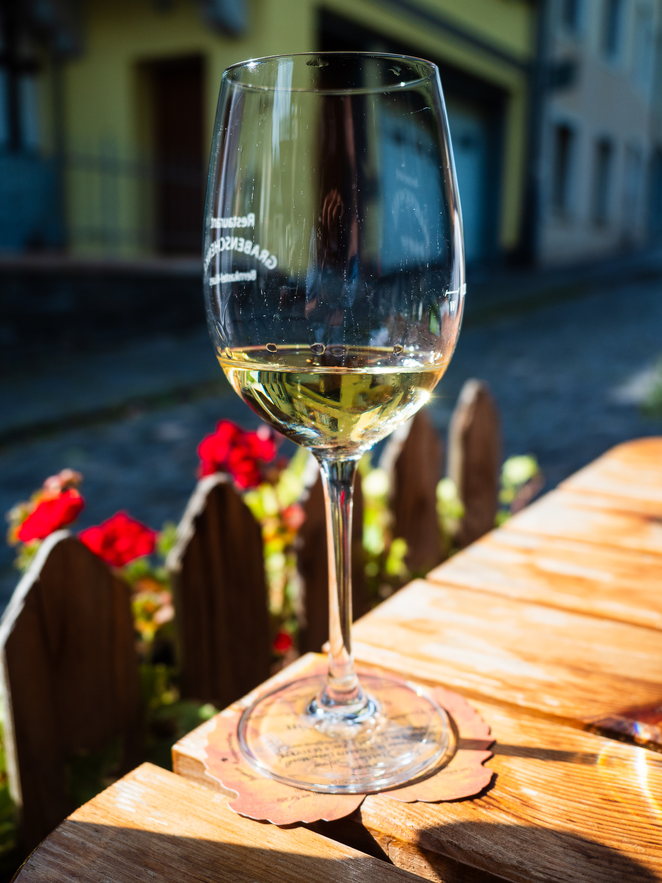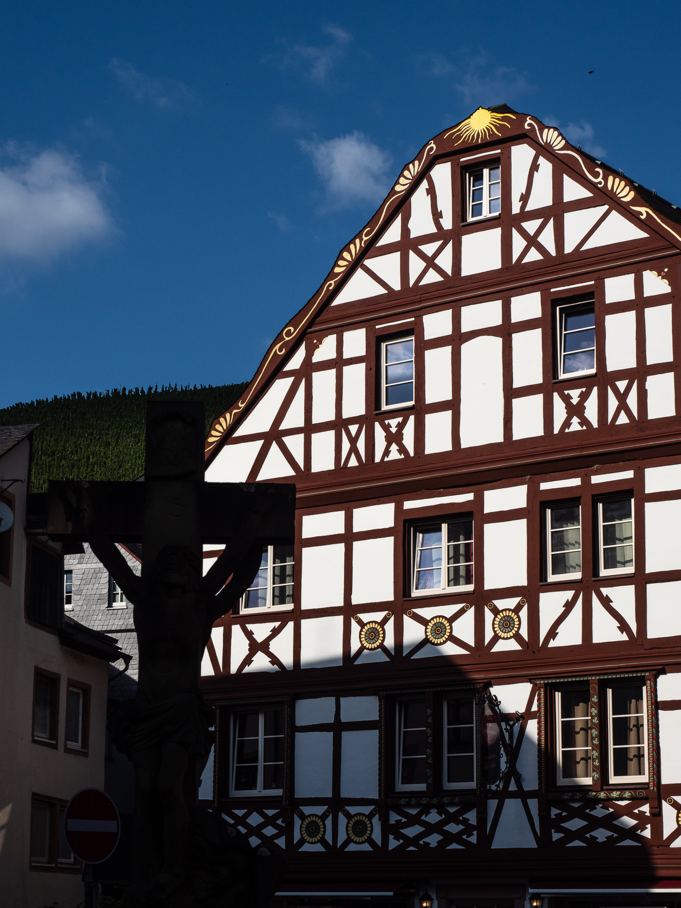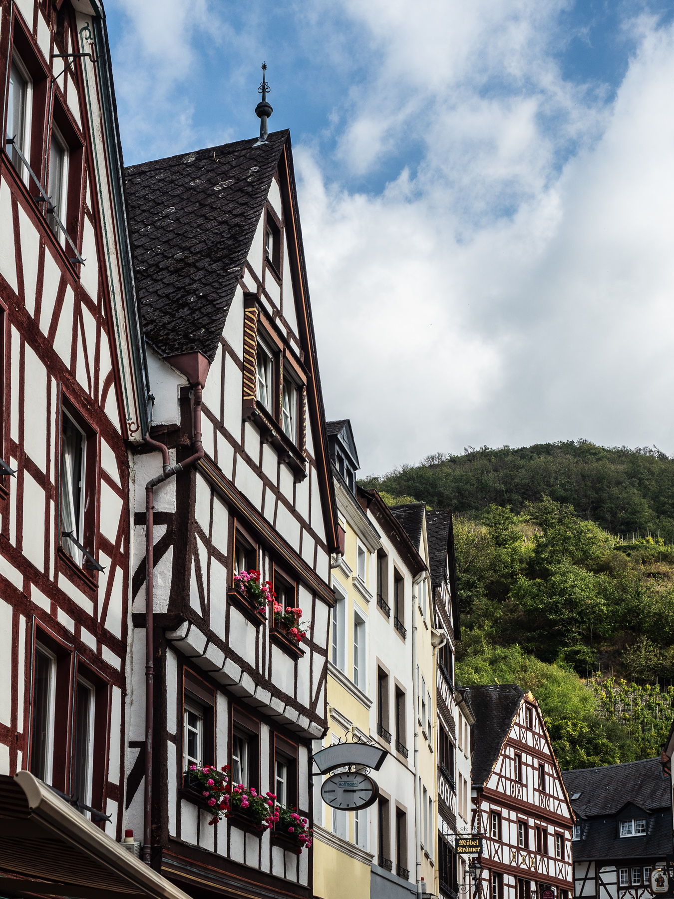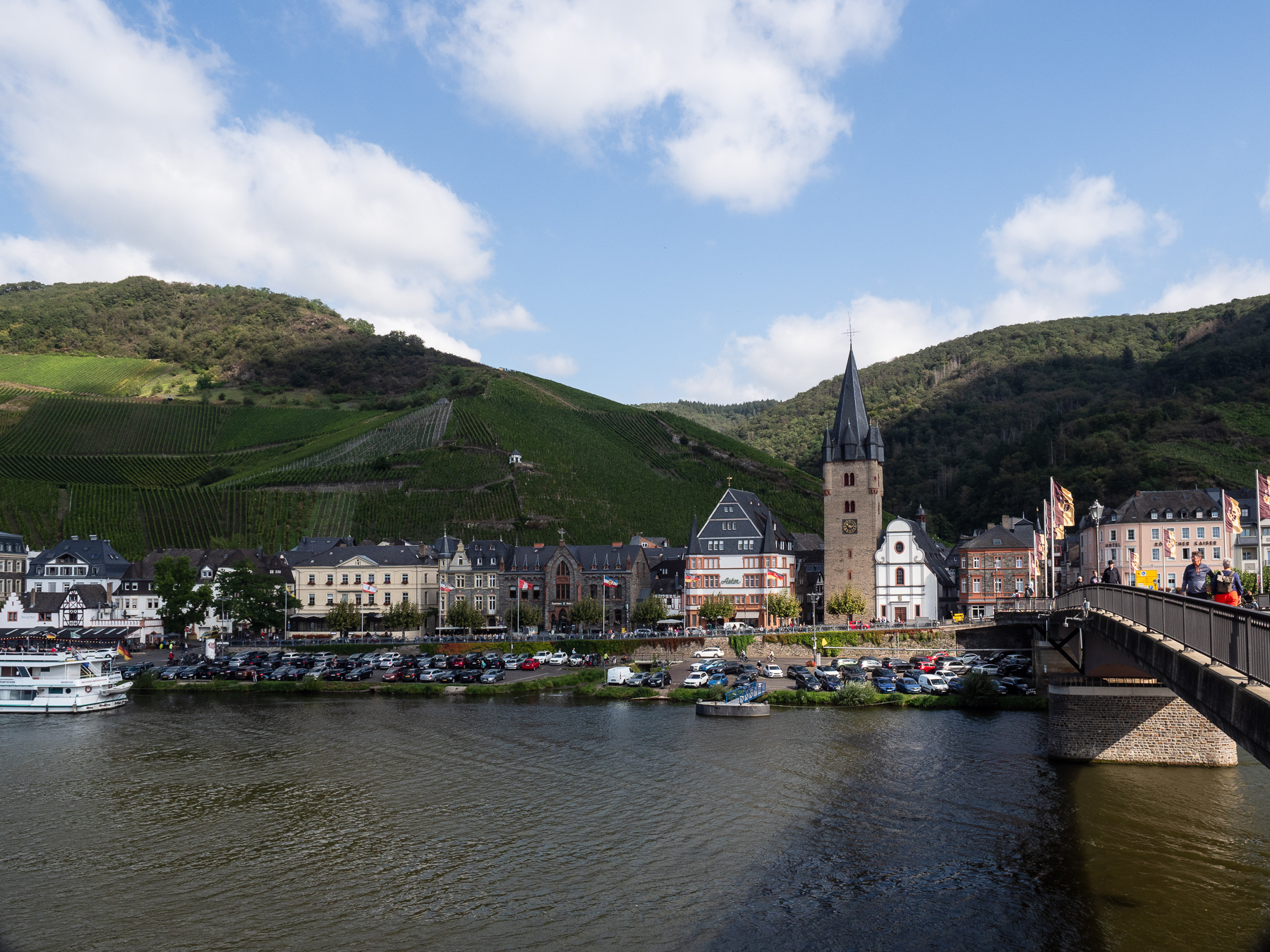Durch die Altstadt schieben sich Menschenmassen. Wo kommen die denn alle her? Bernkastel-Kues scheint das Rüdesheim der Mosel zu sein. Die Altstadt mit seinen Fachwerkhaus Fassaden ist schön anzuschauen. Insbesondere die schmalen, winzigen Häuser haben es uns angetan. Am Rande der Altstadt mit Blick auf den “legendären” Weinhang Bernkastel Doctor nehmen wir in einer Weinstube Platz und gönnen uns einen Weisswein, was auch sonst