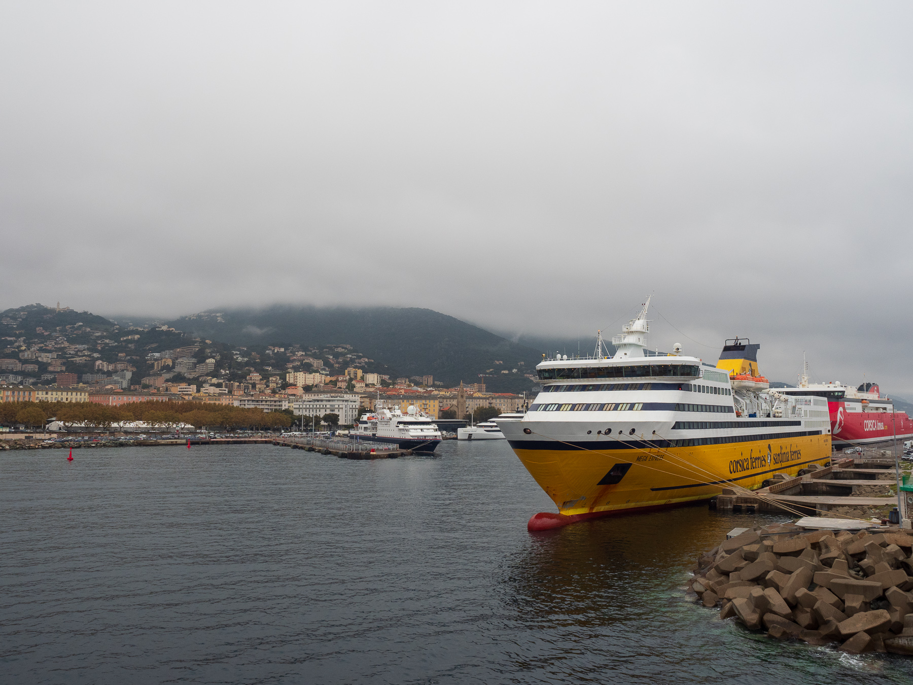 Nach einer kurzen Nacht, die immer wieder durch vorbeifahrende LKWs gestört wurde, checken wir um 6:30 in die Mobylines Fähre ein. Die Fähre ist ziemlich leer. Im Sitzbereich können wir uns lang legen und den verpassten Schlaf nachholen. Kurz nach acht, also halbwegs pünktlich, legen wir ab. Gegen 13:30 Uhr kommen wir mit ca. einer Stunde Verspätung in Bastia an.