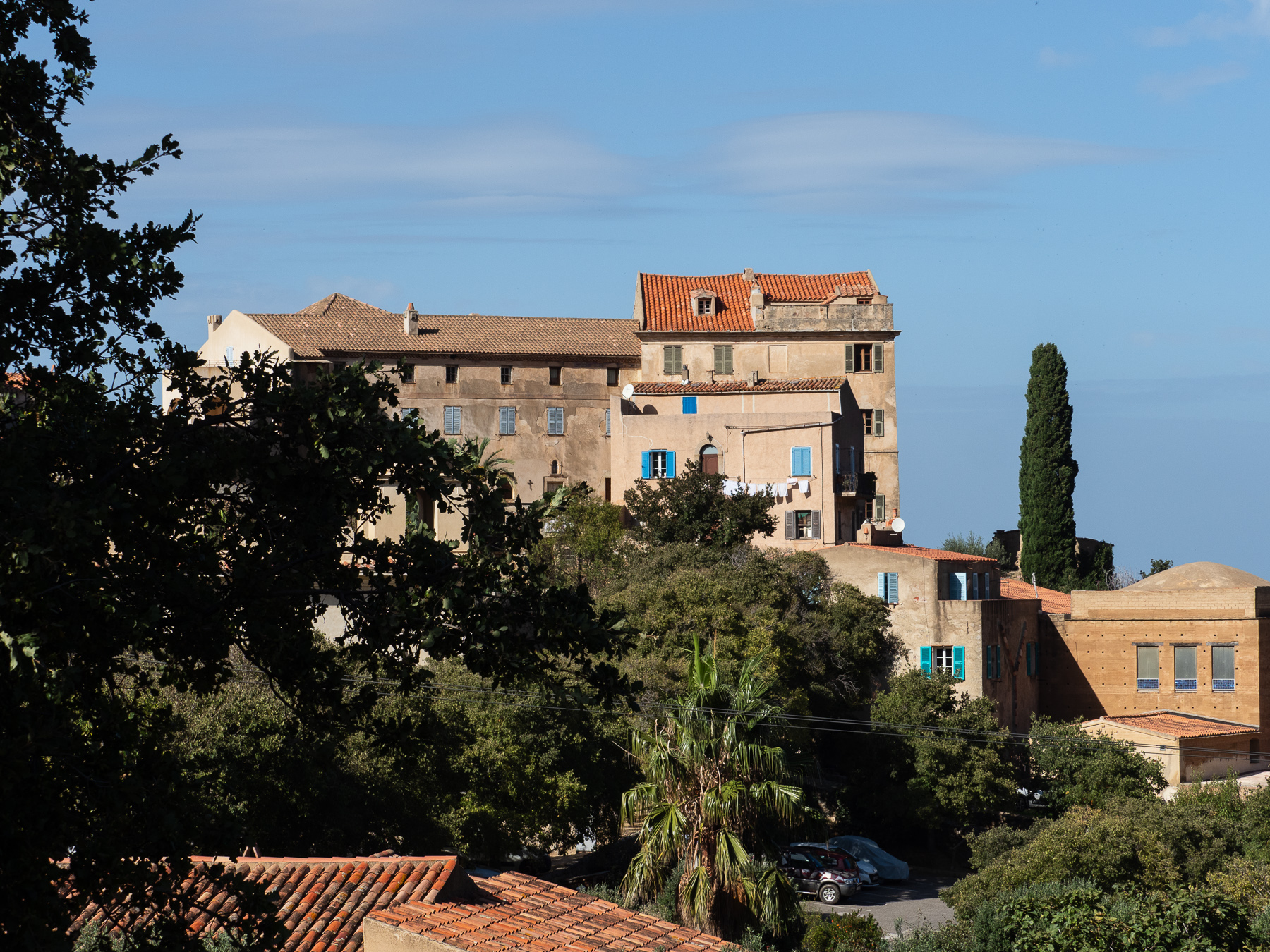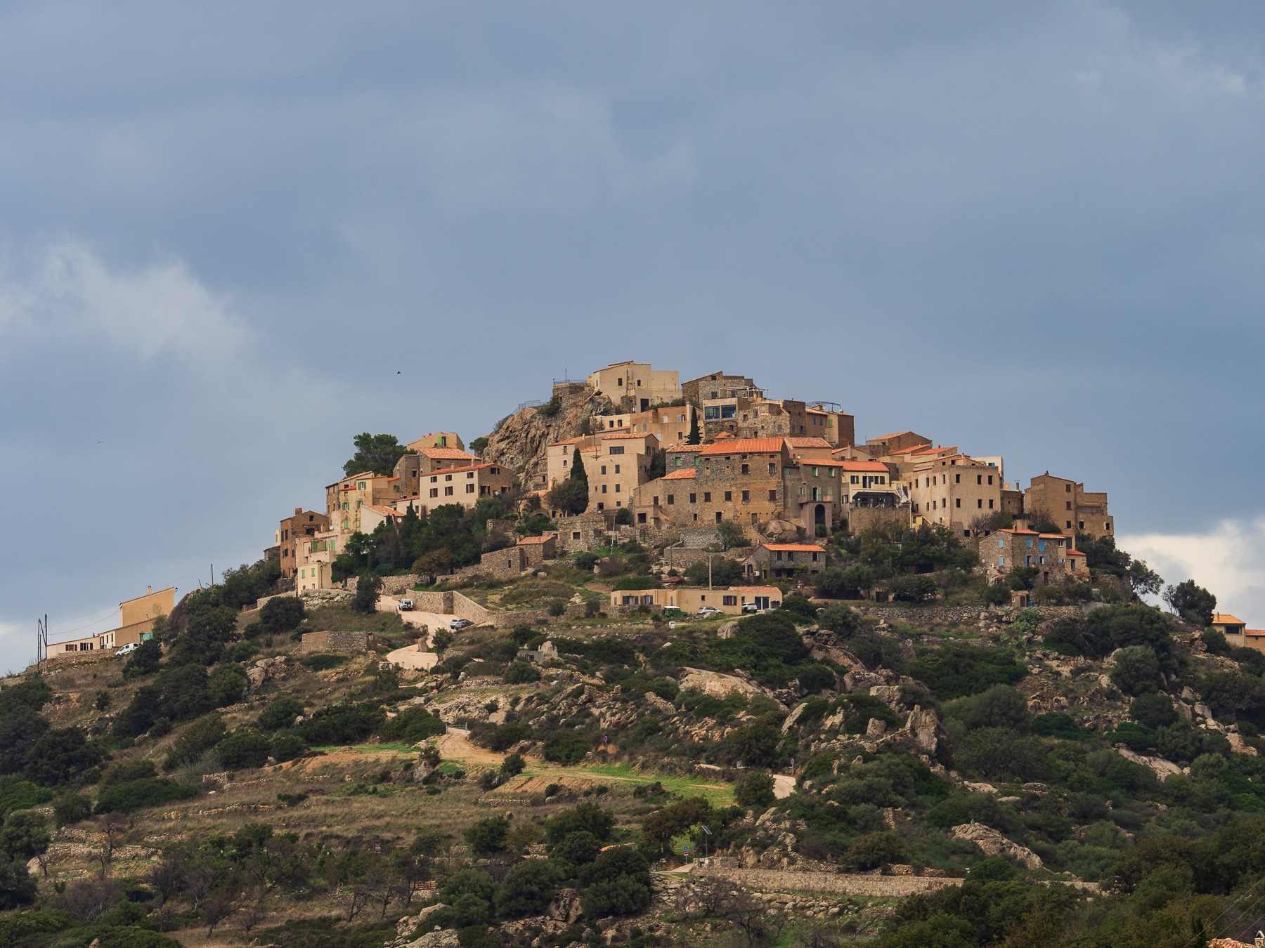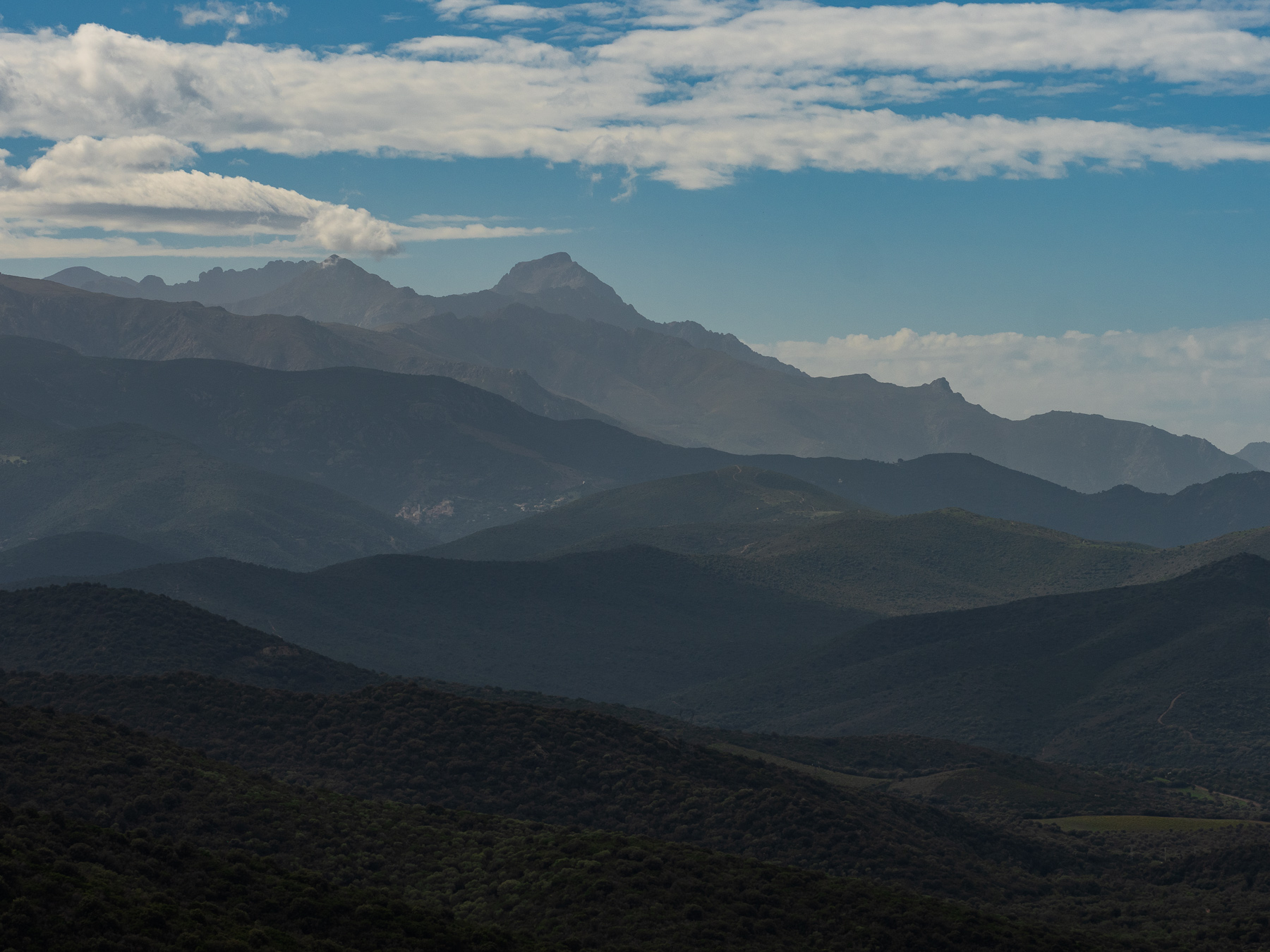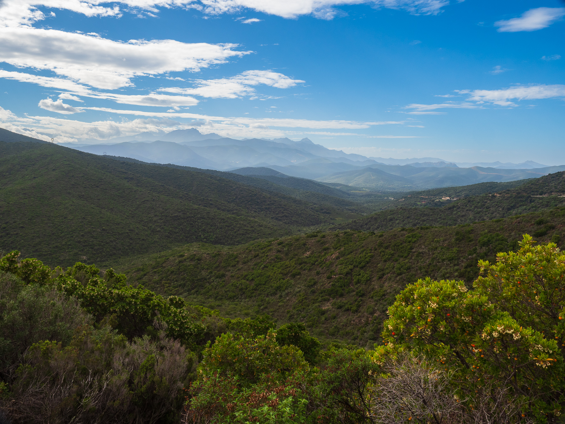 Stattdessen biegen wir Richtung Saint-Florent ab. Auf der Strecke halten wir an einem Aussichtspunkt und geniessen das gigantische Bergpanorama, das sich vor uns entfaltet.