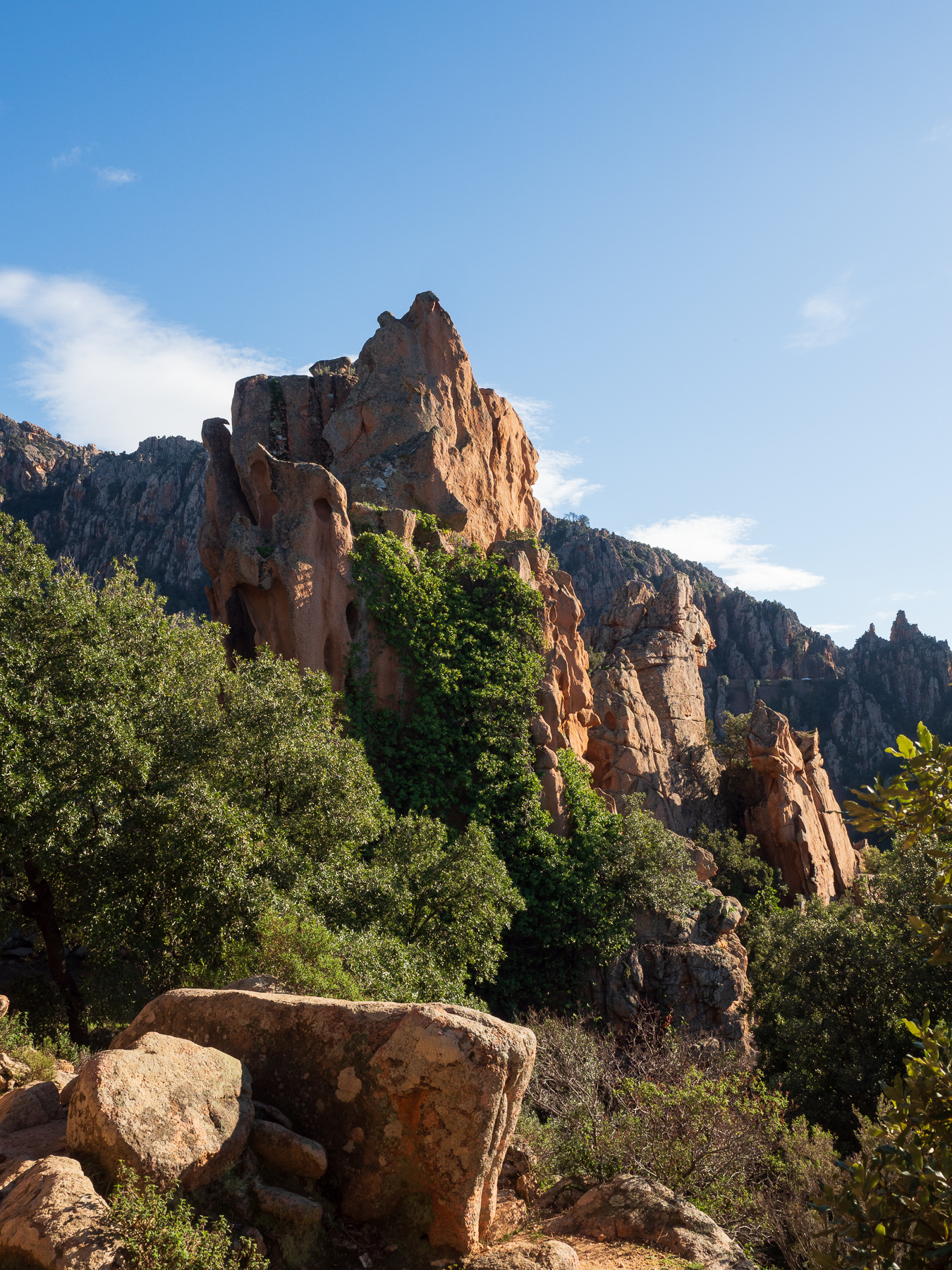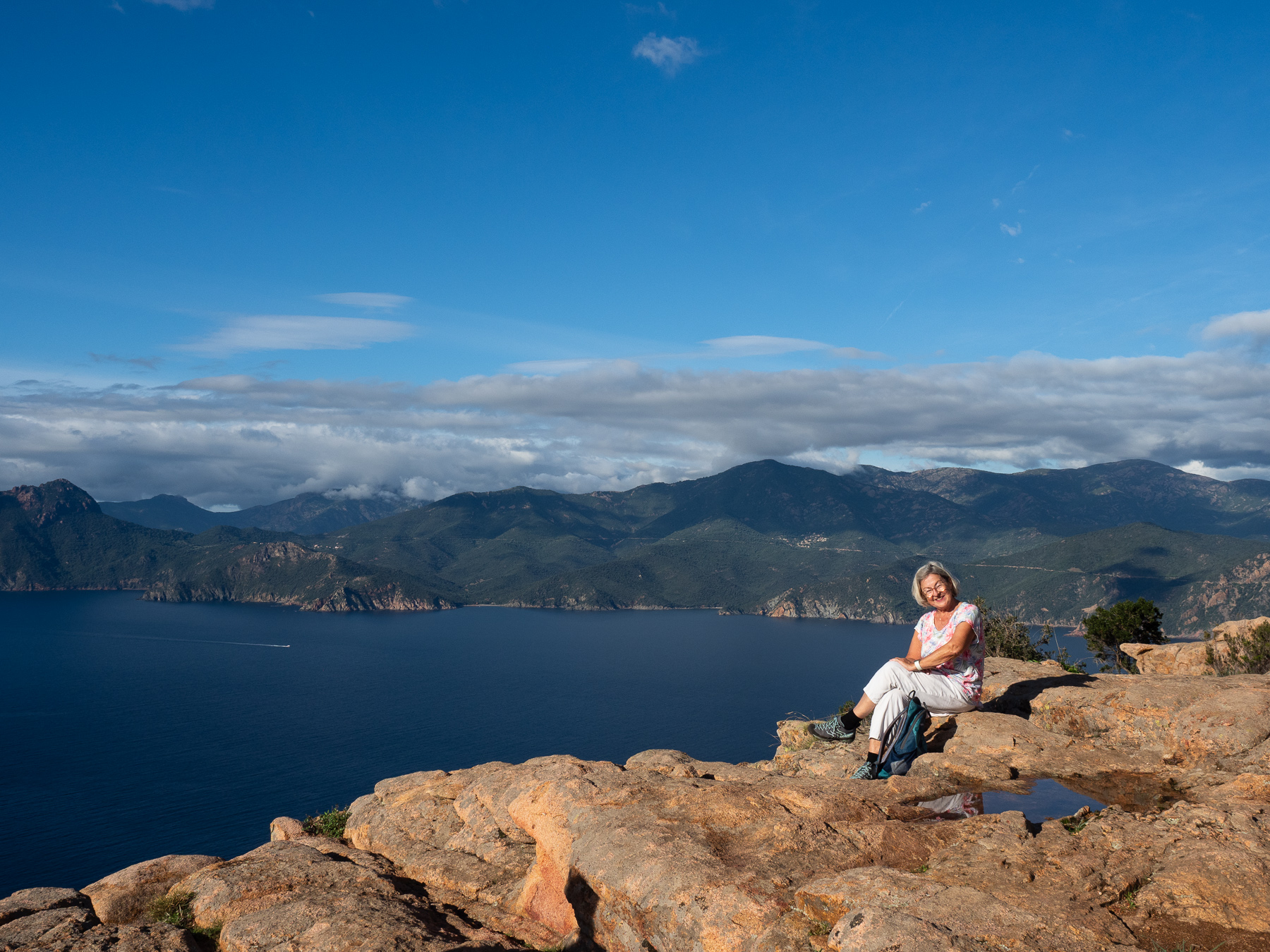In Porto checken wir auf unserem Campingplatz ein und fahren noch ein Stück Richtung Piana. Hier wollen wir noch eine kleine Wanderung in die Calanche machen. Kurz vor dem Tête de Chien ist ein Parkplatz. Von dem wir in einer guten halben Stunde zum „Château Fort“ wandern. Der Weg führt über Steine und Felsen, auf und ab, bis wir ein Plateau erreichen, von dem wir einen sagenhaften Blick auf die Bucht von Porto und die Berge haben. Dieser Weg hat sich gelohnt.
