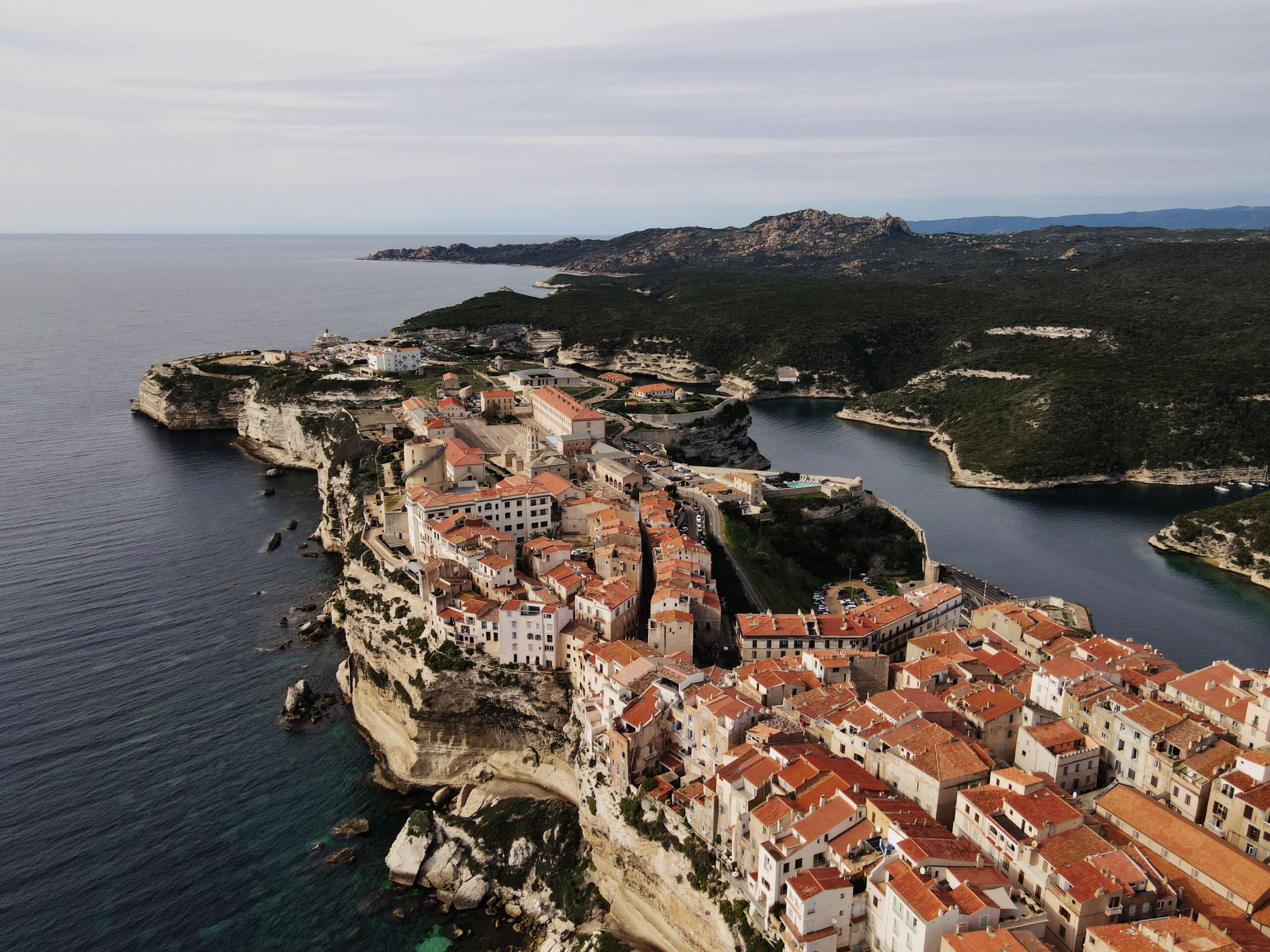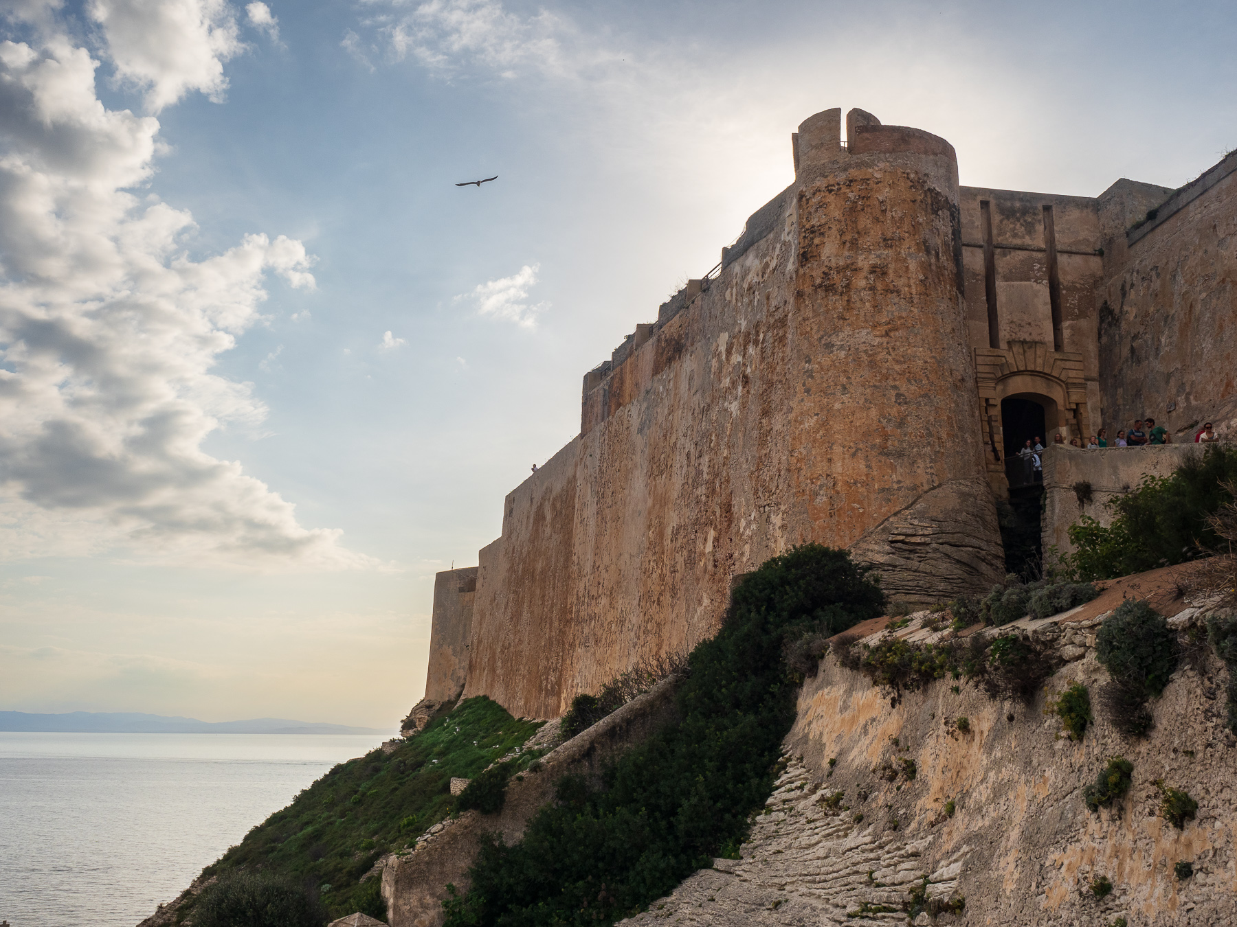 Die Nacht hat es sehr stark geregnet. Auch am Morgen fängt es – nachdem wir die Stühle rausgeholt haben, wieder zu regnen an. Eigentlich wollten wir noch eine Nacht bleiben, aber die Wetteraussicht für den heutigen Tag, läßt nichts Gutes erwarten. Was sagt der Regenradar? Es besteht die Chance, dass das Wetter in Bonifacio besser ist. Wir überlegen nicht lange, rüsten das Auto für die Weiterfahrt und checken aus. Wir haben tatsächlich Glück. Je näher wir Bonifacio kommen, desto heller wird der Himmel. Wir haben den Campingplatz L’Araguina ausgesucht, da wir von hier zu Fuß in die Stadt kommen. Als wir ankommen sind gerade noch 2 Plätze frei. Die Dame an der Rezeption erklärt uns auch, dass der Platz morgen schliesst. Egal, morgen fahren wir weiter. Wir halten uns nicht lange am Stellplatz auf und ziehen los in die Stadt. Vom Hafen hat man einen wunderbaren Blick auf die Oberstadt, die haarscharf am Rand der überhängenden Klippen errichtet ist. Die Stadt ist zum Land hin, von einer meterhohen, massiven Mauer geschützt. Wir steigen nach oben. Bevor man die Stadt betritt eröffnet sich uns ein atemberaubender Blick auf die Landznge mit der steilen, weißen Abbruchkante, die einen imposanten Kontrast zum tiefblauen Meer bietet.