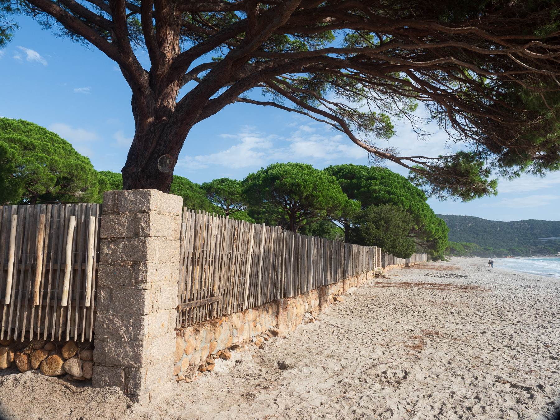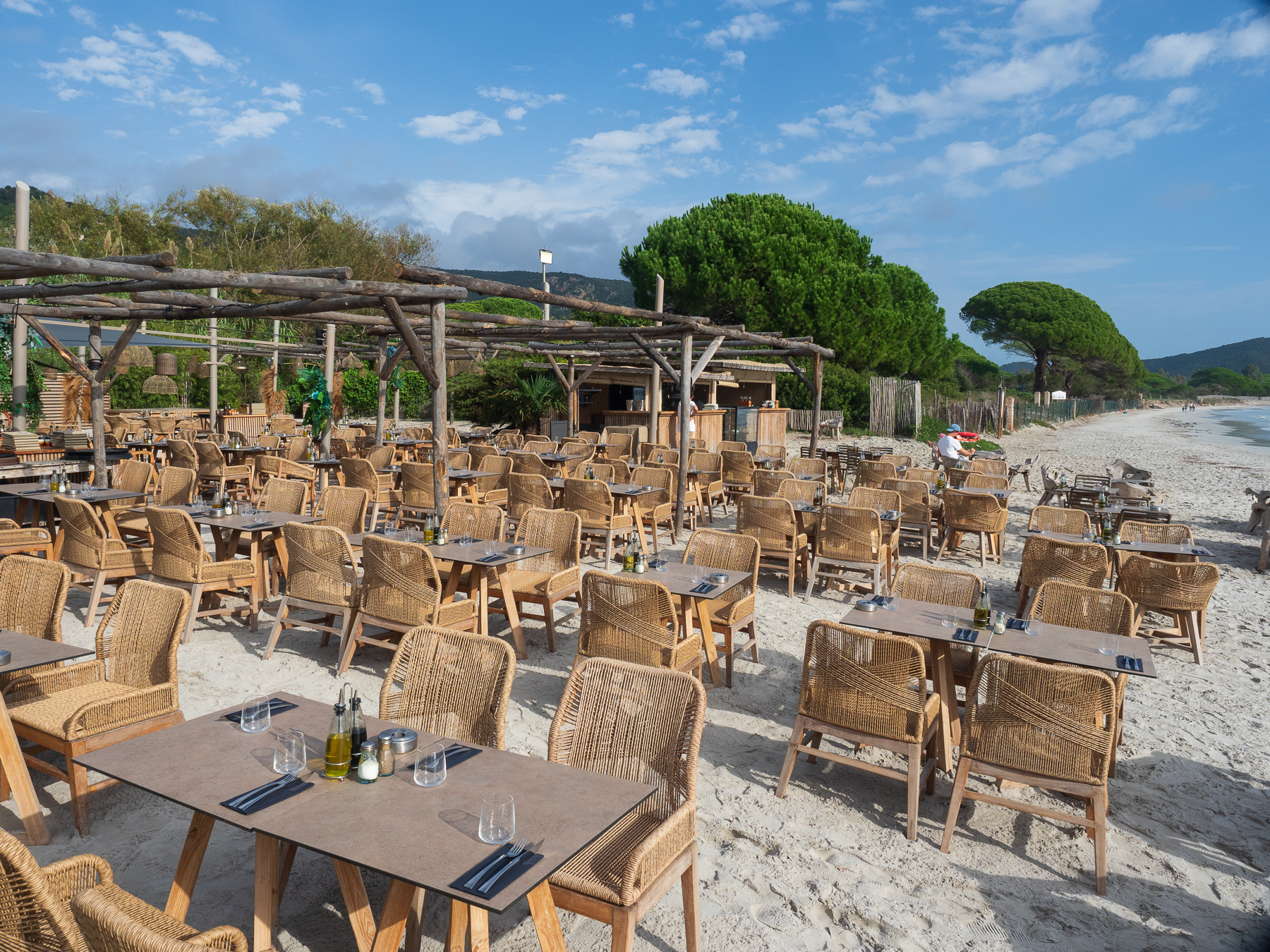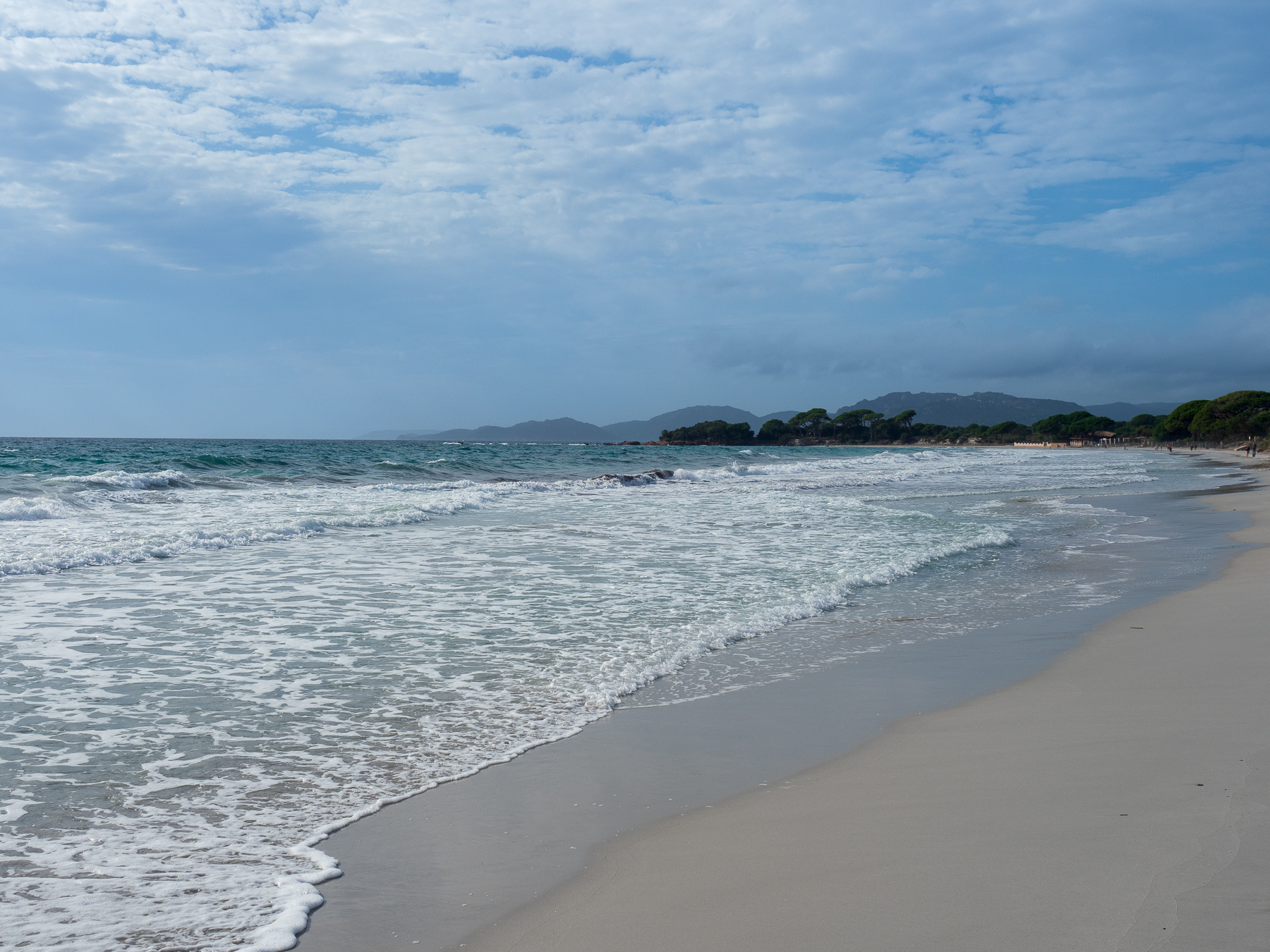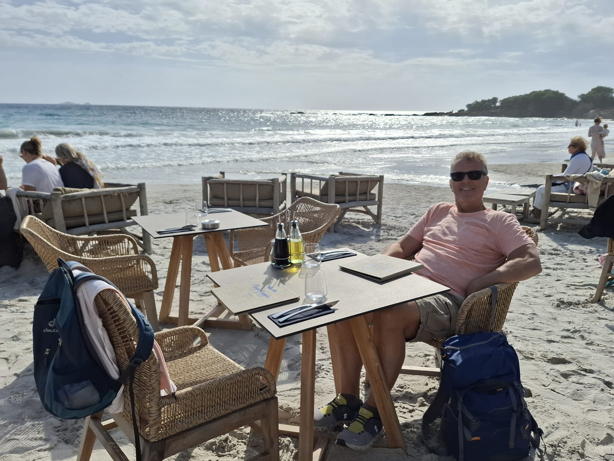 Der Campingplatz in Bonifacio schliesst heute um 11:00 Uhr. Für uns ist das ein Frühstart. Nach Porto-Vecchio, unser Ziel, sind es nur knapp 30 Minuten Fahrzeit. Doch vorher machen wir noch einen Abstecher zum Strand Palombaggia. Eigentlich sollte es der Strand Santa Giulia werden, aber die Zufahrt, die wir genommen haben,  ist für Camper gesperrt und Parkmöglichkeiten gibt es auch nicht. Bevor wir jetzt lange versuchen, herauszufinden, wie wir uns alternativ dem Strand nähern, entscheiden wir uns für den Strand Palombaggia. Soll auch schön sein. Der Strand ist sehr lang und es führt eine Straße parallel am zum Strand entlang mit kostenpflichtigen Parkplätzen am Strassenrand. In der Höhe von Playa Baggia parken wir am Strassenrand für 2€ (2 Stunden). Als wir unten am Strand ankommen, sehen wir das das Strandrestaurant Playa Baggia über einen großen Kundenparkplatz verfügt. Hier hätten wir auch parken können. Das Strandrestaurant hat chillige Korbsessel bis an den Strand gestellt. Überhaupt ist die Atmosphäre super relaxed. Die Sonne scheint, der Sand ist pudrig weiß und das türkis, blaue Meer rollt Welle für Welle an den Strand. Hat einen Hauch von Karibik. Nach einem ausgiebigen Strandspaziergang, lassen wir uns im Playa Baggia für einen Drink nieder und entscheiden uns anschliessend auch noch hier zu lunchen. Renate ist einen Cäsar Salat mir Krabben und ich einen Saint Petersfisch. Den wollte ich die ganze Zeit schon mal probieren. Leider ist das Essen eher mittelmäßig.