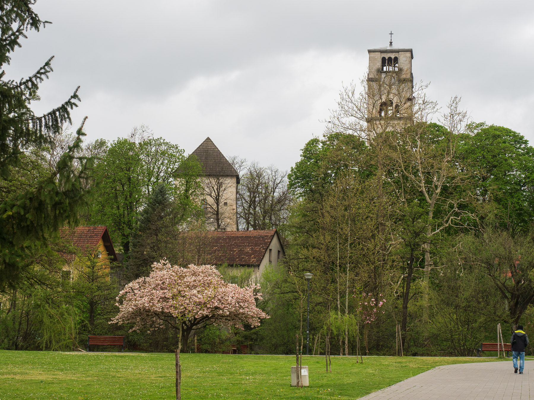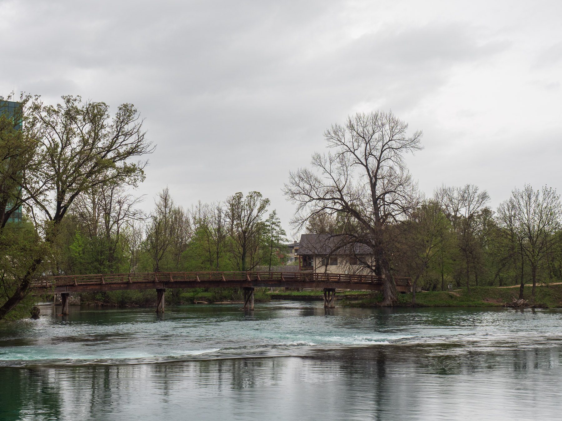 Leider setzt mit unserer Ankunft Regen ein. Sehr schade! Wir tappen nur sehr ungerne bei Regen in Städten oder in der Landschaft herum. Trotzdem packen wir unsere Sachen und spazieren zum Park Gradska Otoka, der wie eine Insel in der Una liegt und über Holzbrücken mit dem Ufer verbunden ist. Von hier ist auch der historische Turm zu sehen, der heute ein Museum beherbergt. Da der Regen stärker wird und auch nicht mehr nachläßt, kehren wir für einen Drink ein und suchen danach ein Restaurant, wo wir unser Abendessen einnehmen.