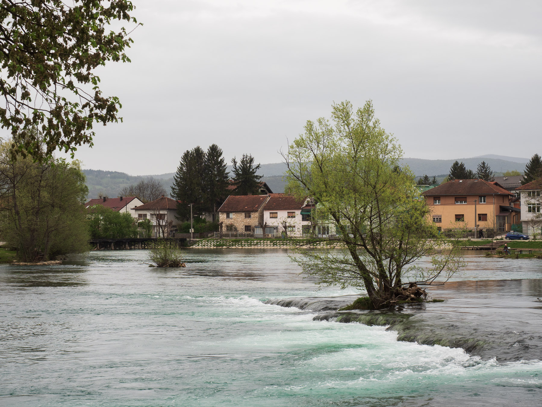 Unsere Fahrt verläuft problemlos, auch für den Grenzübertritt nach Bosnien-Herzegowina reicht der Reisepass. In Bihac steuern wir einen Parkplatz neben einem Cafe an. Der Parkplatz liegt direkt am Fluss Una und ermöglicht uns einen tollen Blick auf den Fluss. Renate fragt im Cafe, ob wir über Nacht bleiben können. „No problem“.