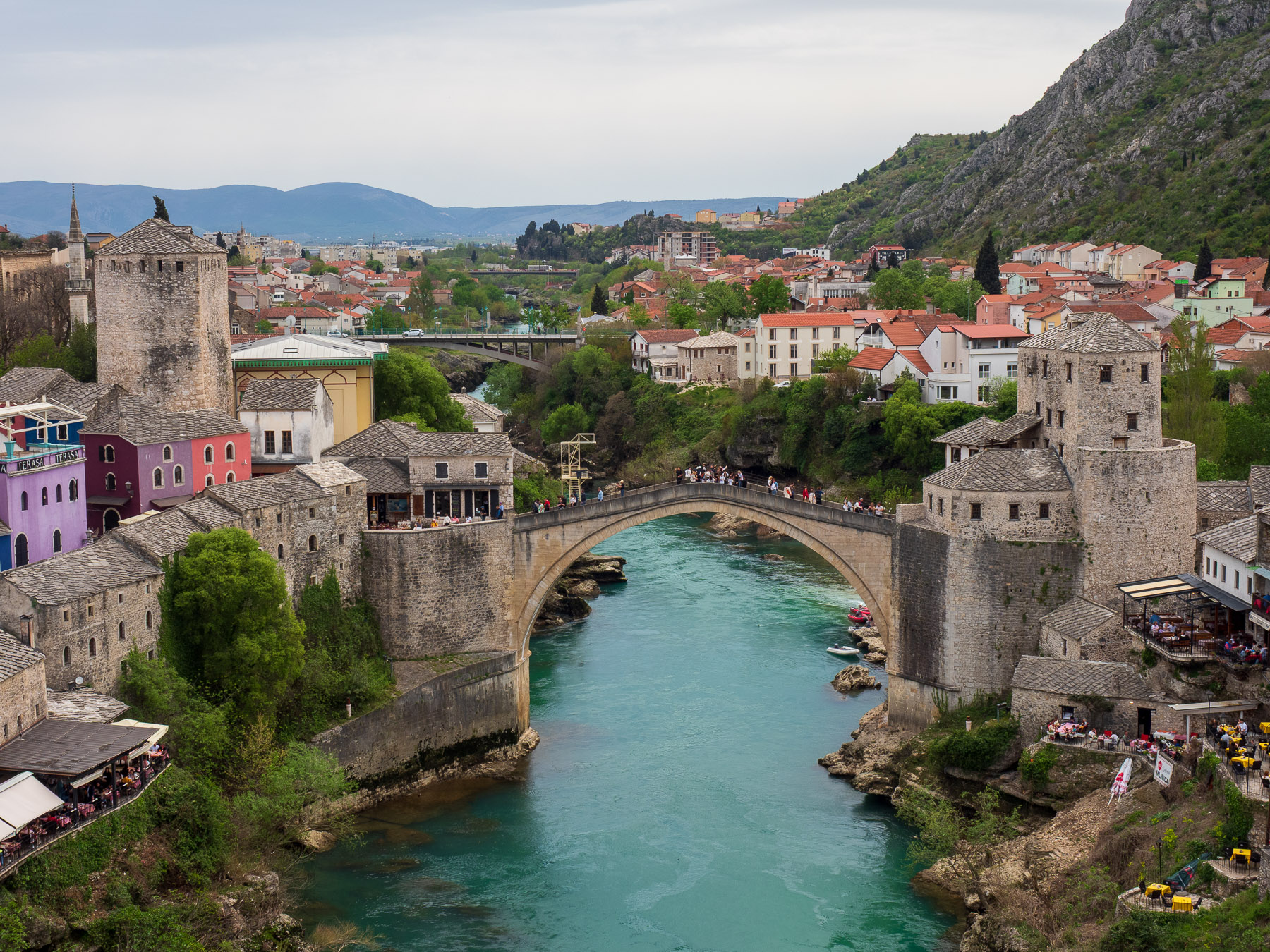 So nachdem ich mir nun Luft gemacht habe, zu unserem sonstigen Tag. Nach einem gemütlichen Frühstück mit Rühreiern, frische Eier haben wir von unserem Campingplatz Betreiber gekauft, fahren wir nach Mostar. Wir parken auf einem großen, kostenpflichtigen Parkplatz am Campanile . Der Platzplatz ist ideal, um die Altstadt von Mostar zu erkunden. In wenigen Gehminuten kommen wir an der Alten Brücke von Mostar an. Auch wenn noch Nebensaison ist, hier merkt man, dass Mostar zu den touristischen Highlights Bosnien-Herzogowinas gehört. Die Stadt ist proppenvoll. Wir schlendern über die Brücke und erkunden ein wenig die Altstadt. Ich schaue mir die Ibrahim-Efendi Roznamedži Moschee an und ersteige auch das Minarett, von dem man einen tollen Blick auf die Brücke und Mostar hat. Danach besuchen wir noch das Museums des Krieges und Opfer des Genozides, über das ich ja schon eingangs berichtete.