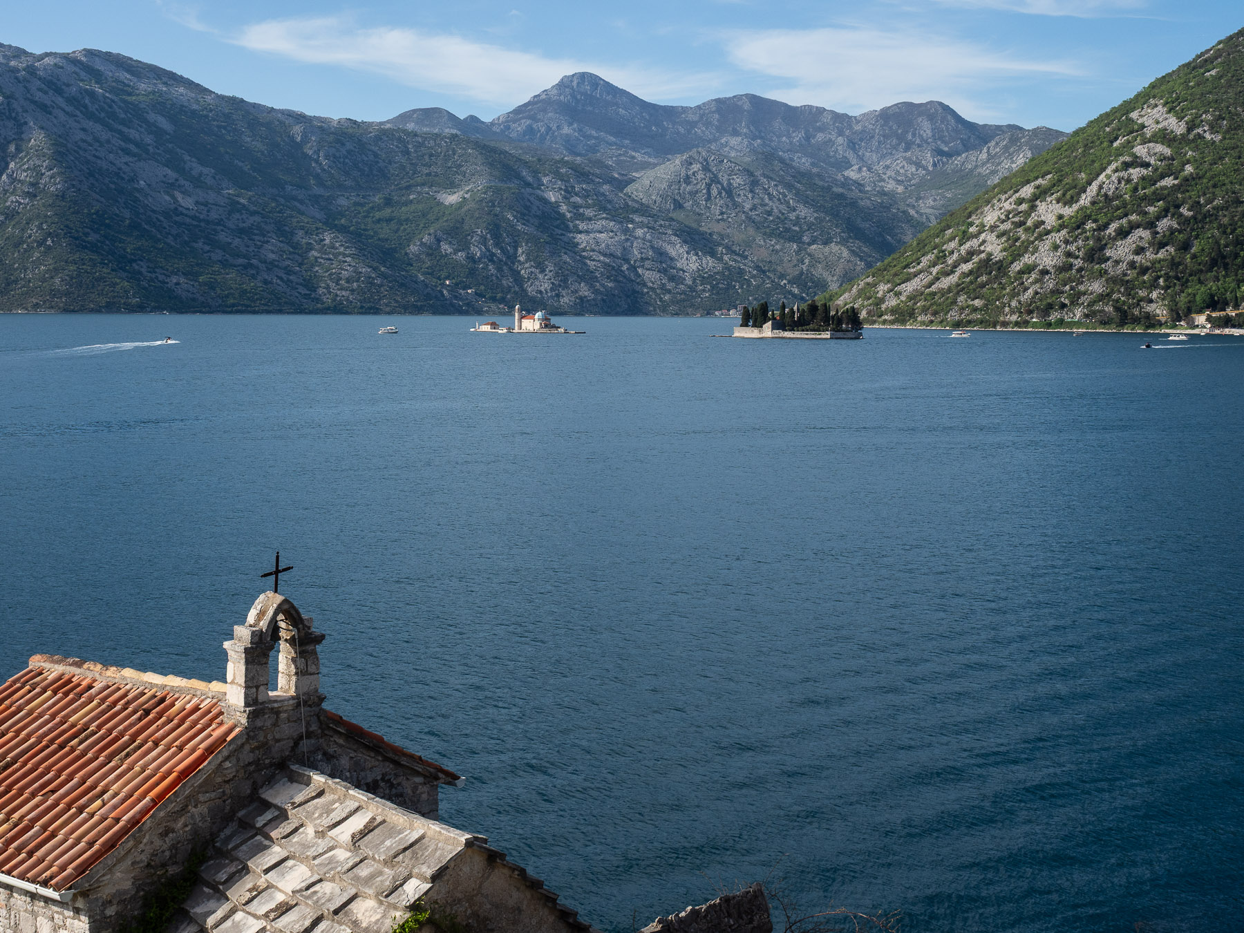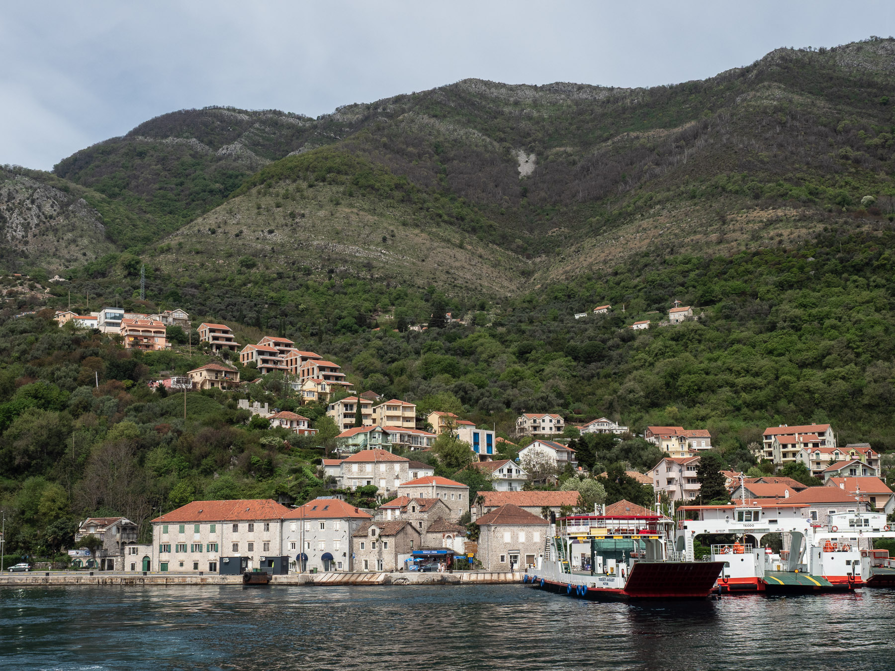 Als wir heute mit den Fahrrädern auf die Fähre fahren, kommt doch tatsächlich so etwas wie Norwegen Feeling auf. Die Bucht von Kotor mutet in der Tat wie ein norwegisches Fjord an.  Ziel unserer heutigen Radtour ist die Stadt Kotor. Nach der kostenlosen Fährüberfahrt fahren wir mit unseren Fahrrädern auf einer von Autos wenig frequentierten Küstenstrasse. Die Strecke ist wirklich schön, deutlich schöner als die Gestrige nach Herceg Novi. Wir passieren kleine Dörfer, die Berge ragen zu beiden Uferseiten steil auf. Wie ein norwegisches Fjord. Nach 15 Kilometern kommen wir in Kotor an.