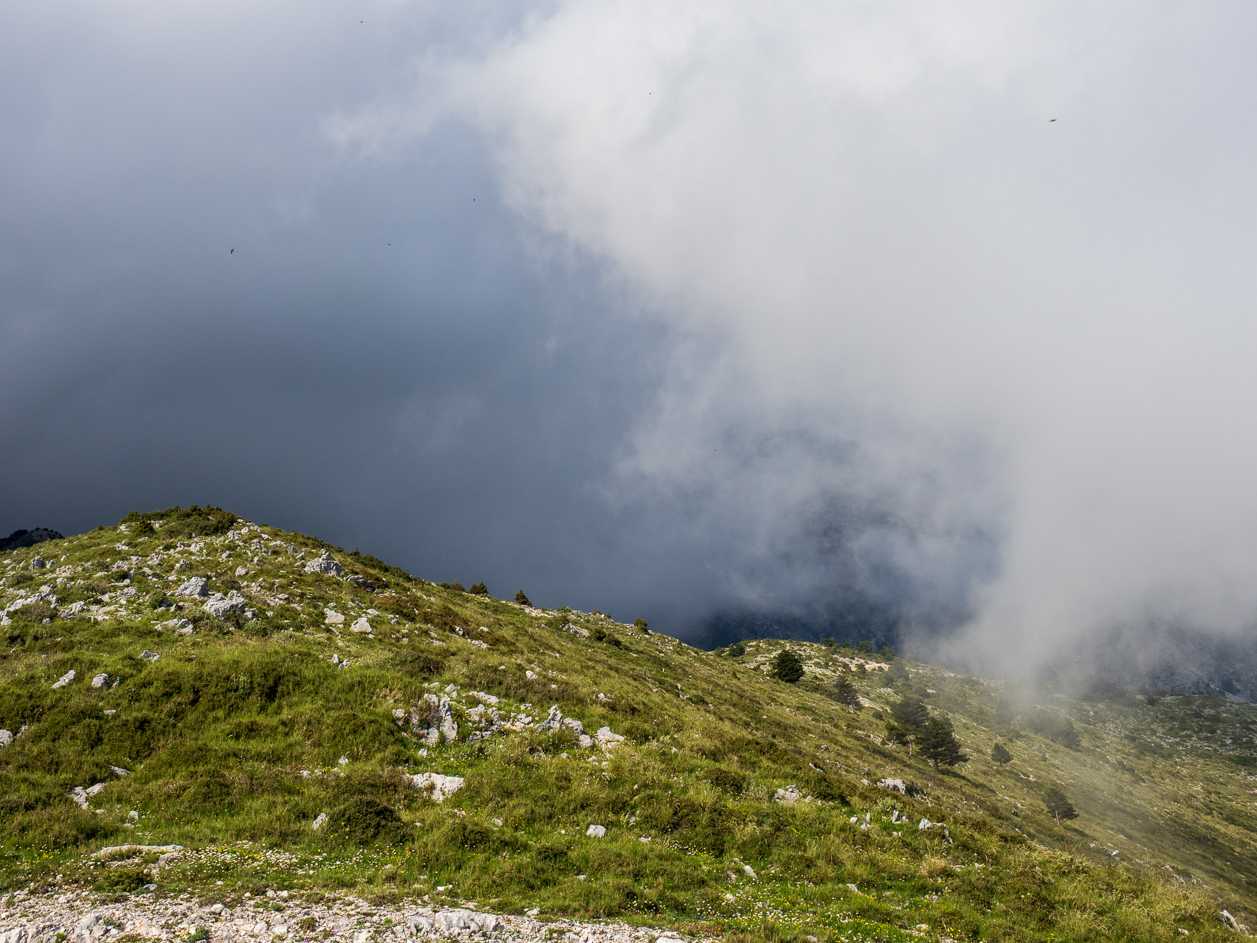Nach vielen Serpentinen kommen wir oben auf den Pass an. Die Sicht hinunter ans Meer ist gut. Traumhaft!