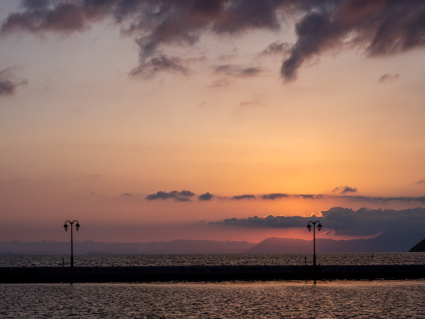 Gegen 17:00 Uhr übertreten wir die Grenze nach Griechenland. Wir fahren nur noch bis nach Sagiada, wo wir in der unmittelbaren Nähe des Hafens, einen schönen Übernachtungsplatz finden. Am Hafen gibt es mehrere Restaurants und Cafés. Wir speisen lecker in der Fisch Taverne Skalermo, Tzatziki, Scampis und Fisch. Zum Abschluss des Tages versinkt die Sonne rotglühend im Meer. Ein gebührender Abschluss des Tages.
