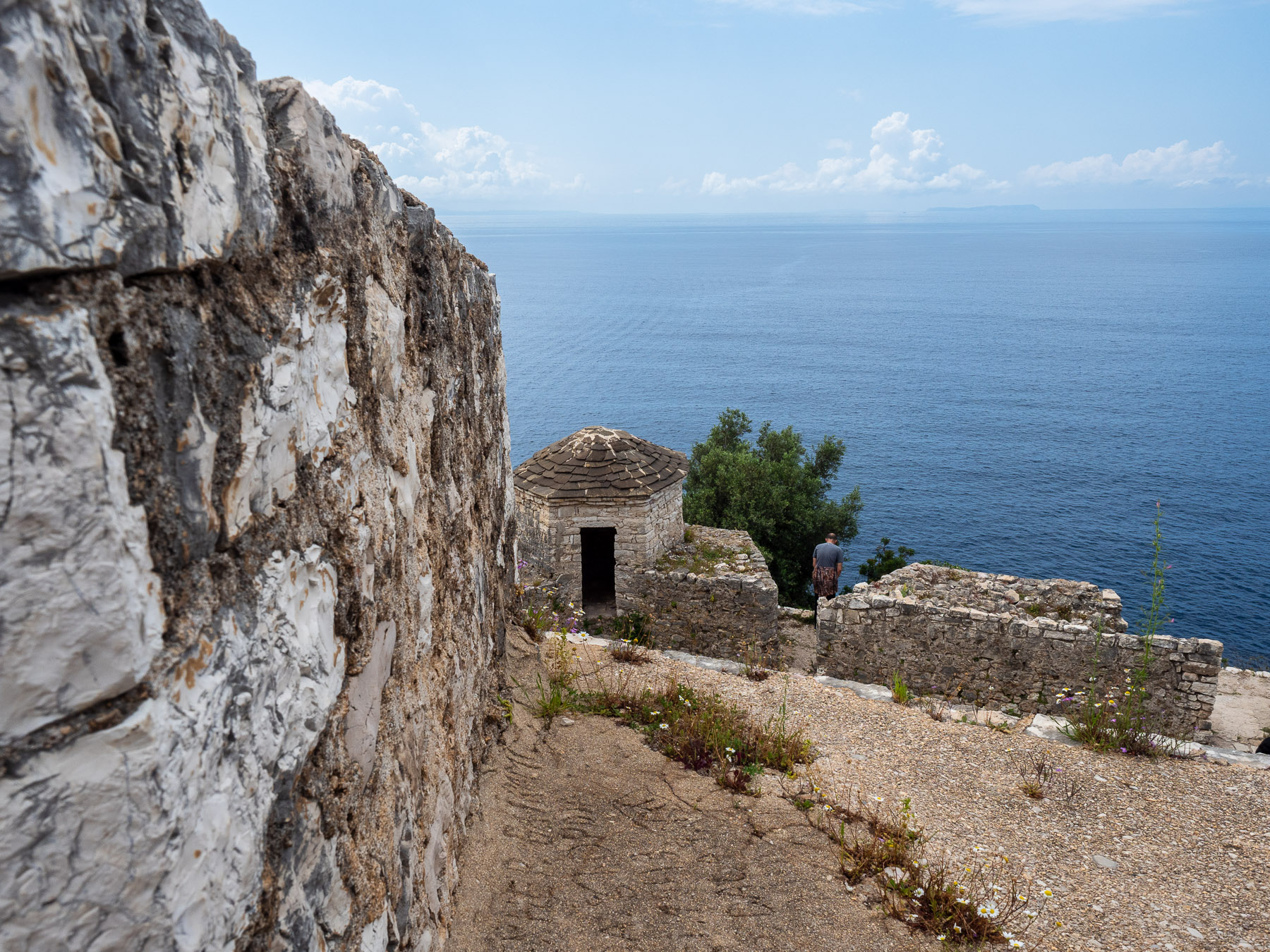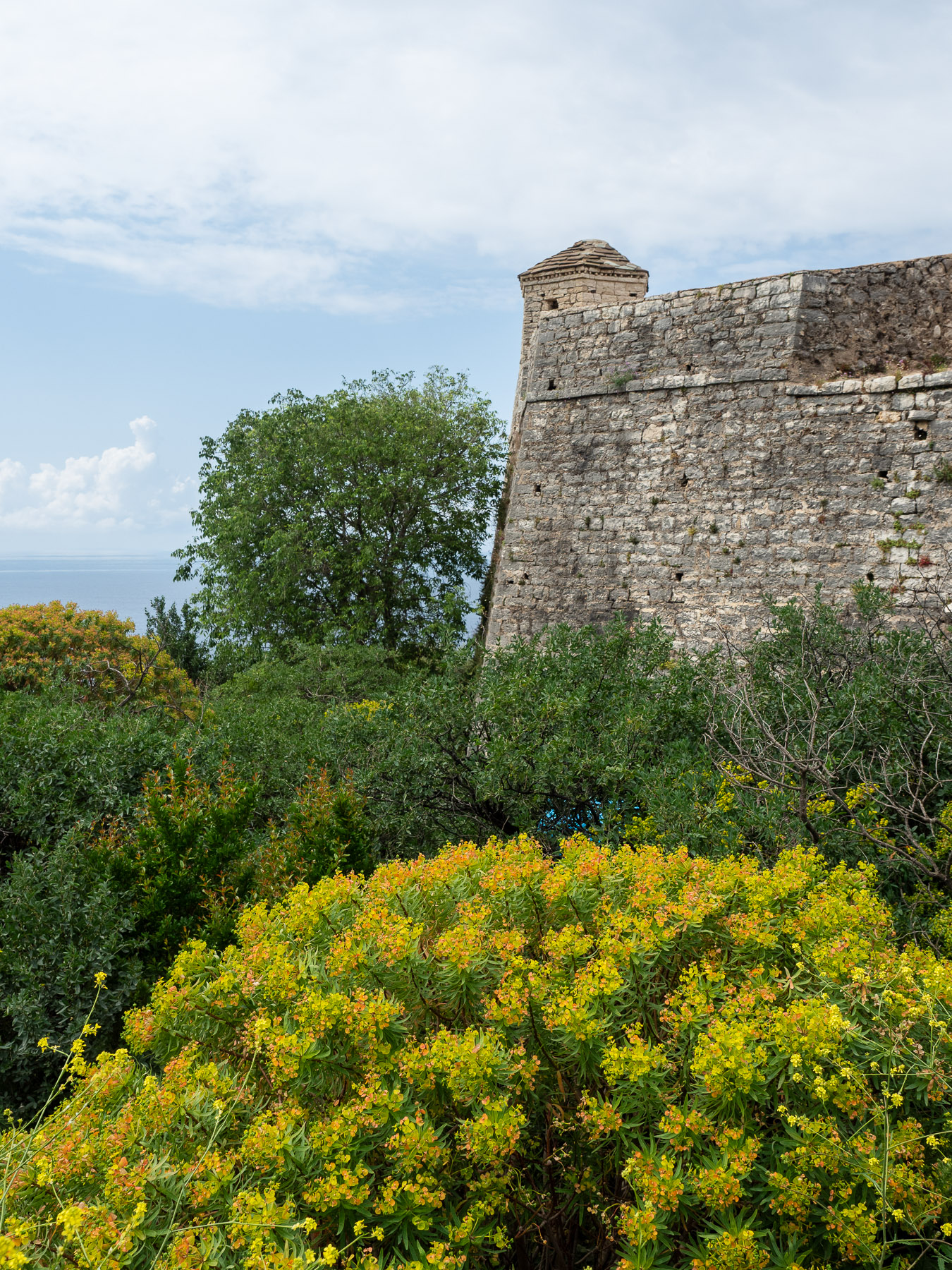 Nicht weit nach Himare biegen wir ab zur kleinen Bucht Porto Palermo. Diese wurde bereits in der Antike als Hafen und Handelsplatz genutzt. Während der kommunistischen Herrschaft von Enver Hoxhas war hier militärisches Sperrgebiet und die Küstenstraße um die Bucht gesperrt. Am Ende der Bucht, die wir allerdings vom Parkplatz nicht erreichen, befindet sich ein U-Boot Bunker, der heute immer noch Sperrgebiet ist. Wir besuchen hier die Festungsanlage Kalaja e Porto Palermos. Sie hat einen dreieckigen Grundriss. Vorbild war angeblich die im 15 Jahrhundert in Butrint erbaute venezianische Festungsanlage. Von der Festung hat man einen schönen Überblick über die gesamte Bucht.