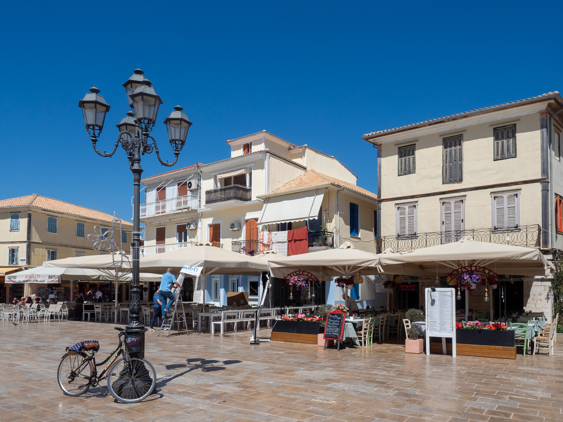 Nach ca. 1,5 Stunden brechen wir Richtung Insel Lefkada auf. Auch in Lefkada Stadt machen wir einen kurzen Stadtbummel. Natürlich laufen wir zur Holzbrücke und biegen nach in den Stadtkern ab. Hier wirkt alles irgendwie verschlafen. Die Atmosphäre ist sehr entspannt. Am Marktplatz bekommt Renate Gelüste auf einen griechischen Salat. Ich probiere ein Pastitsio, das mir allerdings nur mäßig schmeckt.