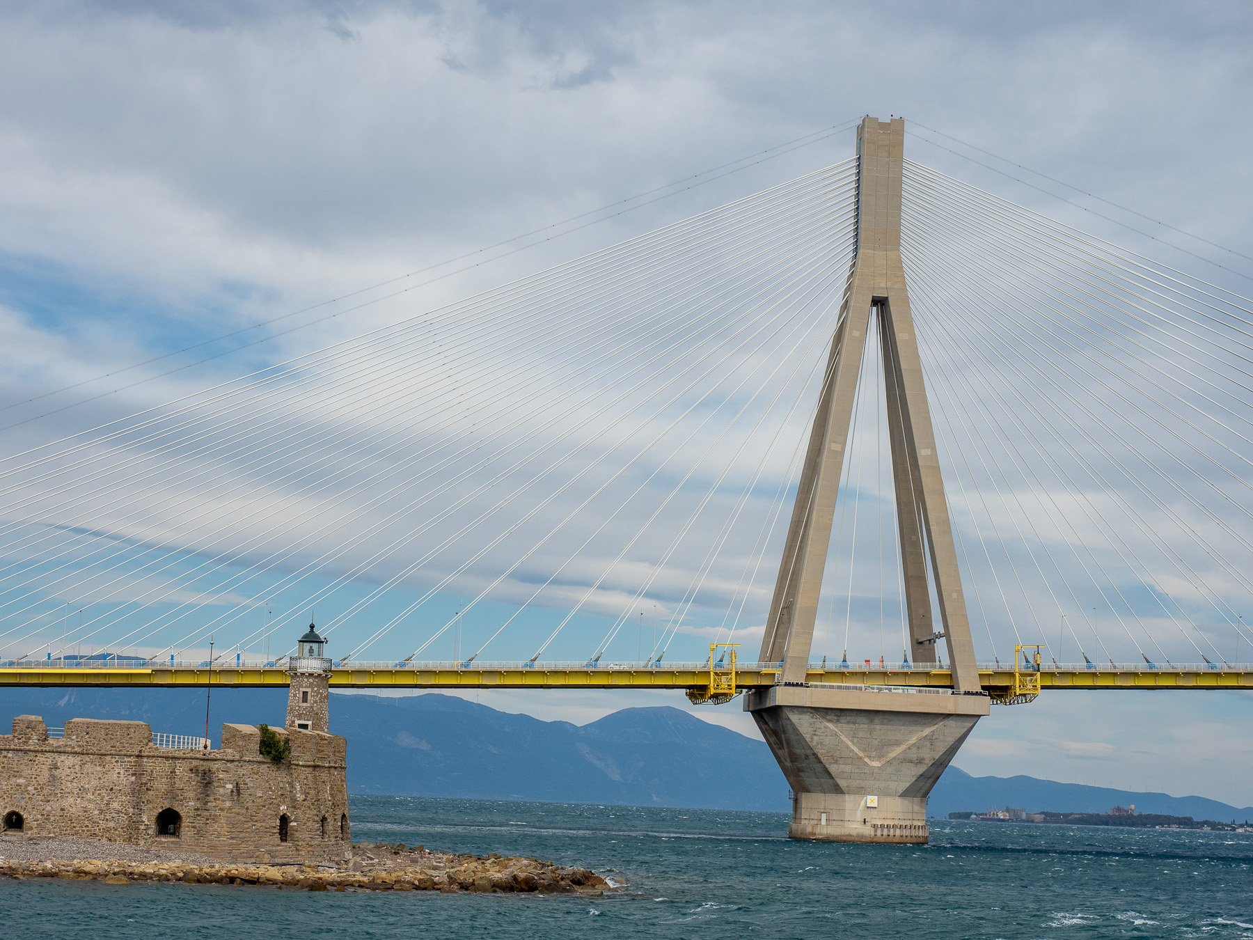In Patras wollen aufgrund des starken Windes und des eher bescheidenen Lichtes direkt über die Rio-Andirrio-Brücke fahren. Sie überspannt mit 2880m den Eingang zum Golf Korinth und verbindet das Festland mit dem Peloponnes. Um dennoch ein Foto der Brücke zu bekommen, biege ich von der Route ab und plötzlich stehen wir vor dem Fähranleger. Da wir jetzt schon mal hier sind, setzen wir jetzt doch für 10€ mit der Fähre über. So bekommen wir auch noch ein ordentliches Bild der Brücke.