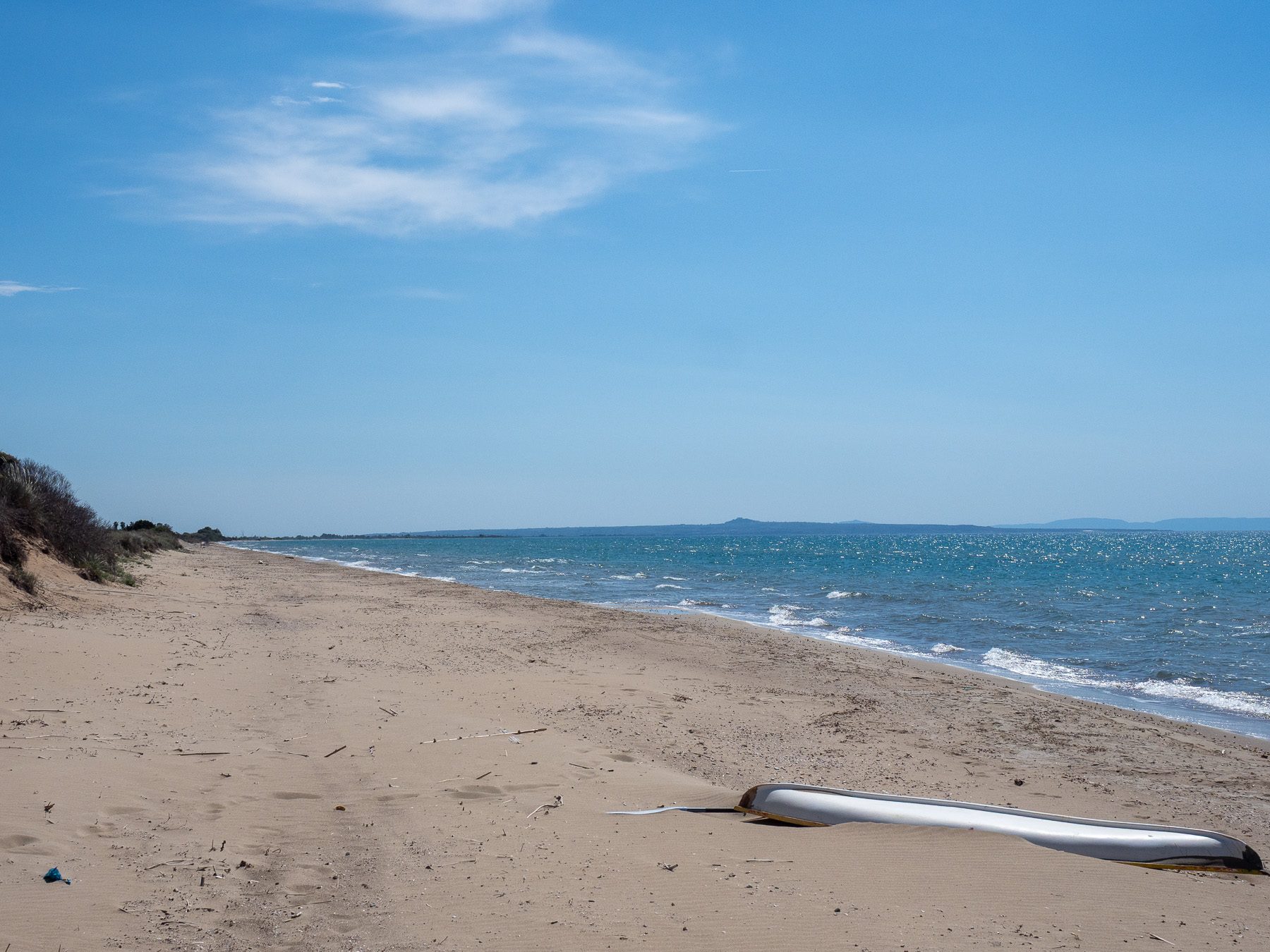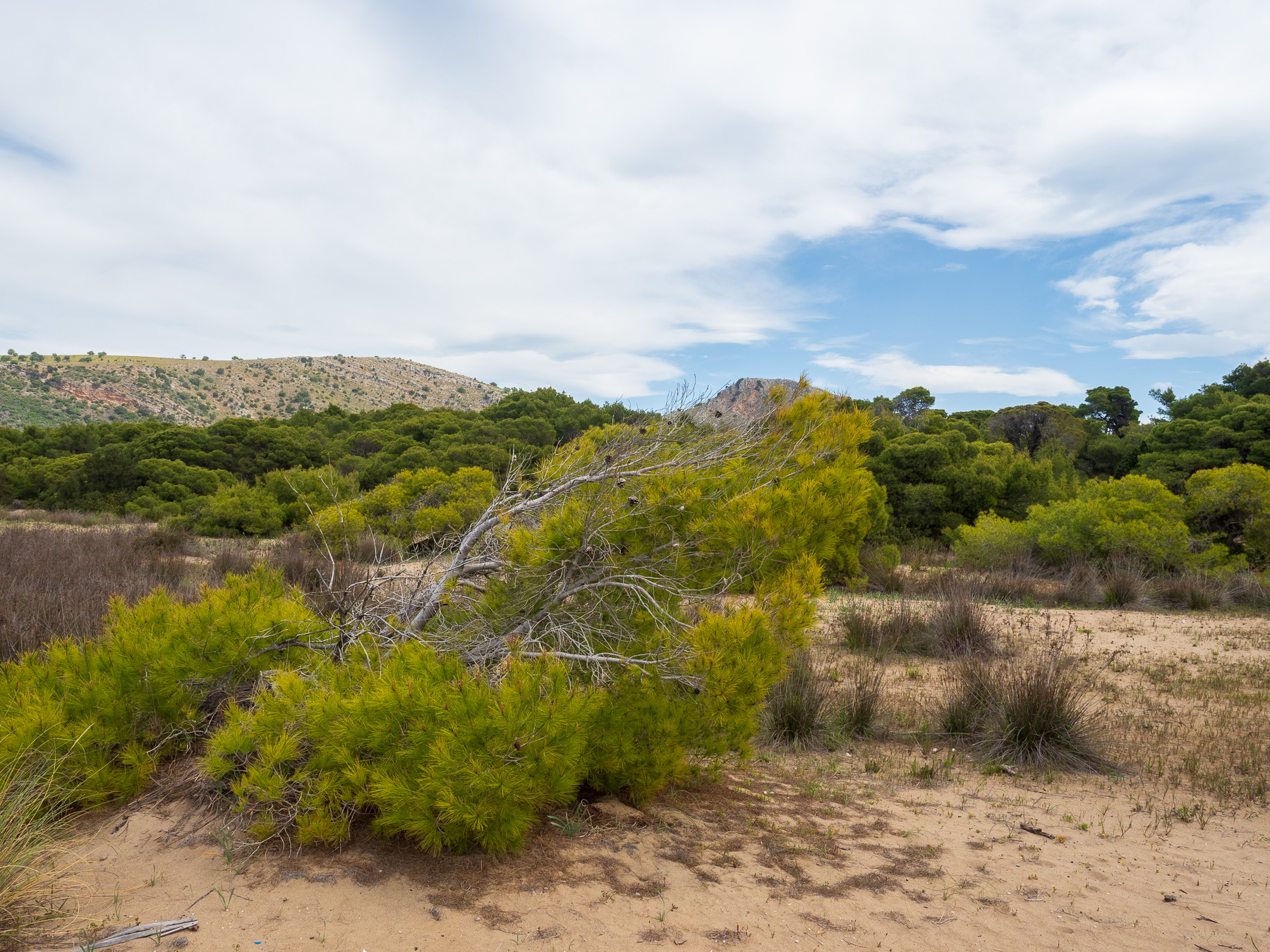 Der Park ist geprägt von Pinien, Sanddünen und sanften Kalksteinhügeln. Er liegt an der Nordwestspitze des Peloponnes und erstreckt sich über eine Fläche von 160.000 Quadratmetern. Hier befindet sich der größte Kiefernwald Griechenlands – ein wichtiger Rastplatz für Zugvögel, darunter auch bedrohte Arten. Wir parken an einer Beach Bar und spazieren den scheinbar endlosen Sandstrand entlang. Schließlich überqueren wir Sanddünen und flache Vegetation und tauchen ein in den wunderschönen Pinienwald.