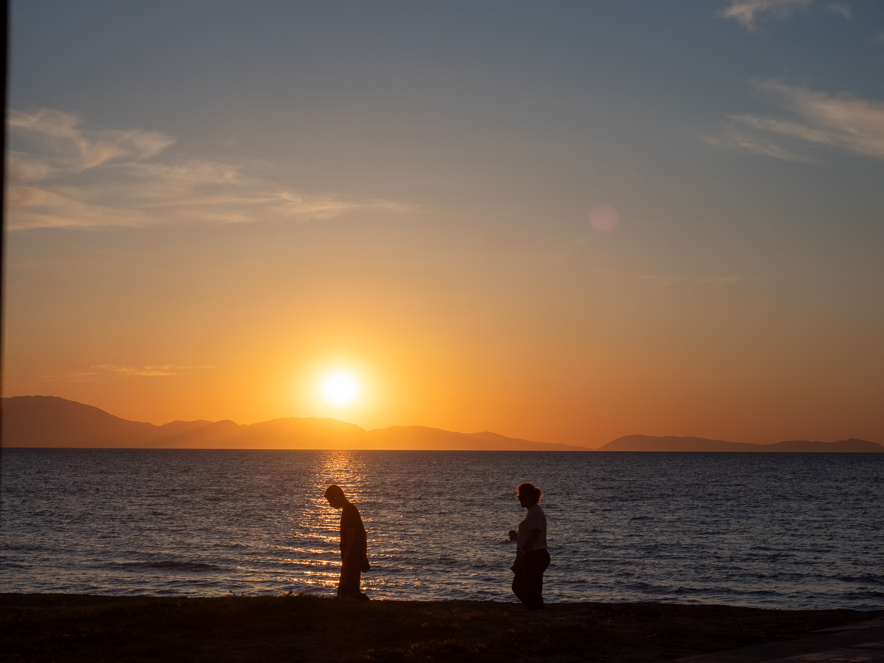 Zurück am Ausgangspunkt gönnen wir uns einen Freddo Cappuccino, bevor wir zu unserem heutigen Stellplatz aufbrechen. Eigentlich hatten wir einen Platz bei einer Taverne im Sinn, doch während der Fahrt entdeckt Renate eine interessante Alternative: das Ionio Restaurant. Neben dem Restaurant, direkt am schönen Sandstrand, gibt es eine große Wiese mit Stellplätzen für mindestens 15 Wohnmobile. Wir genießen einen entspannten Nachmittag und lassen den Tag bei einem leckeren Abendessen ausklingen.