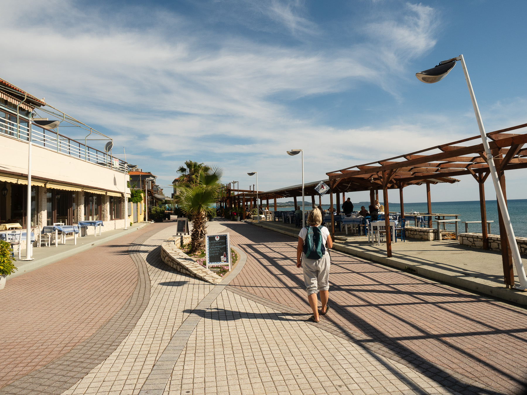 Am späten Nachmittag machen wir einen Spaziergang am Strand entlang nach Kourouta. Dort gibt es ein paar gemütliche Lokale, und wir setzen uns auf einen freien Platz und bestellen einen Drink. Kaum stehen die Gläser auf dem Tisch, strömt eine große Gruppe Griechen in das Lokal. In wenigen Minuten sind alle Tische belegt. Die Bedienung, sichtlich überfordert, sagt lachend zu Renate: “Es ist, als ob ein Kreuzfahrtschiff angelegt hätte.“