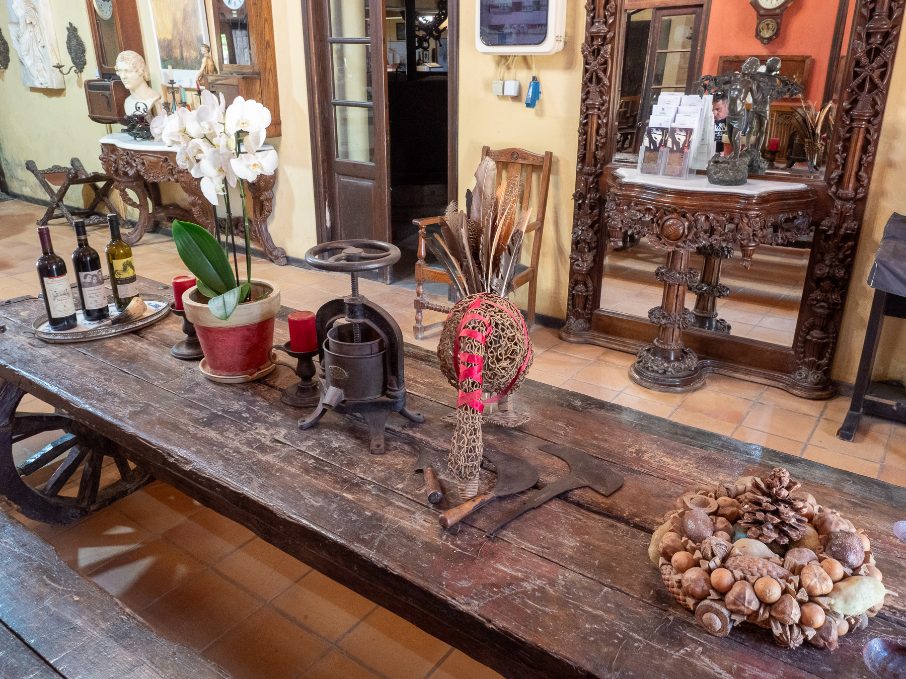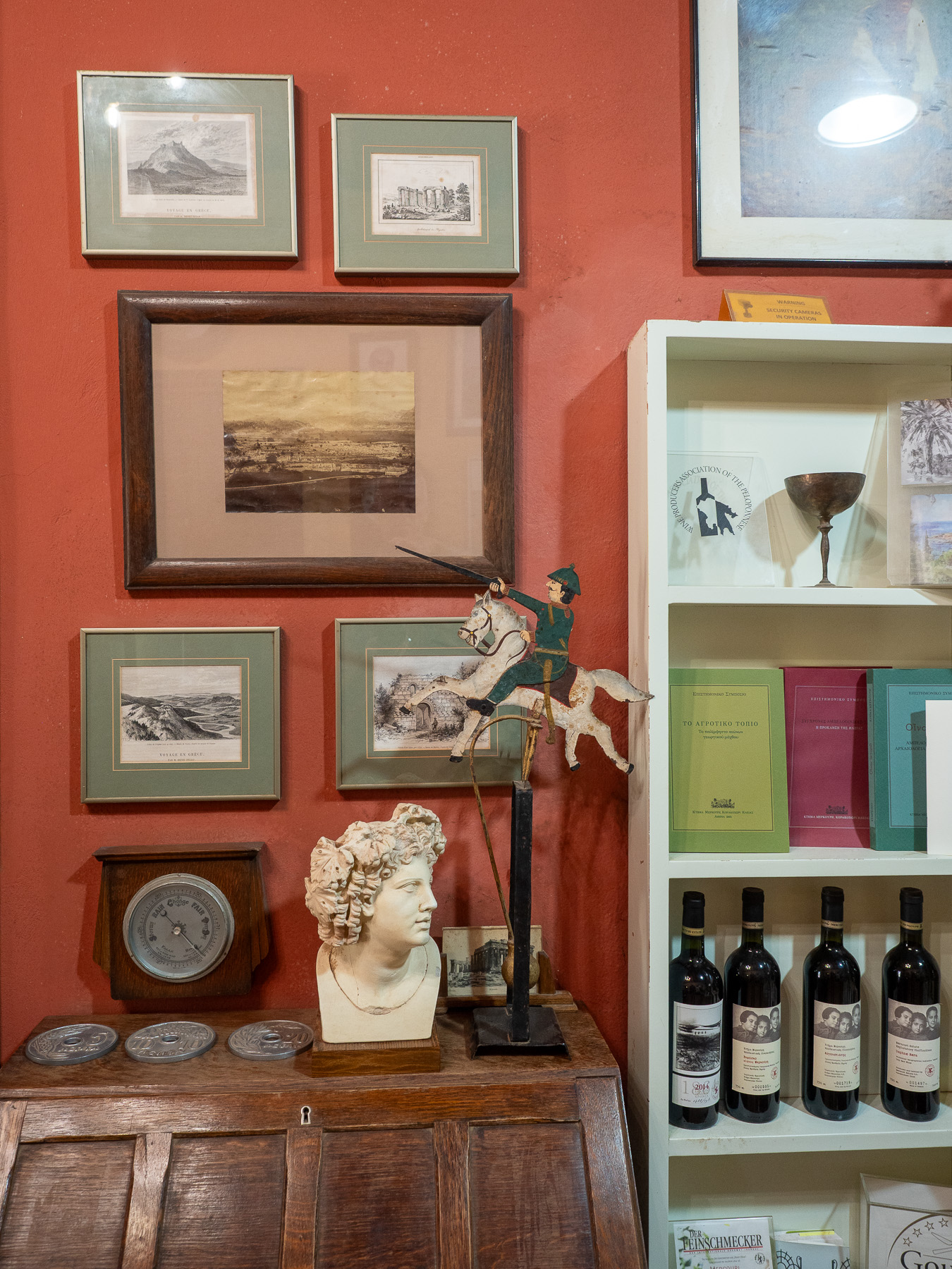 Unser Ziel ist das Weingut Mercouri. Der Verkaufs- und Verkostungsraum mutet wie ein Antiquitätengeschäft an. An der Wand hängt sogar eine alte Stechuhr. Büsten, Sekretäre und alte Bilder säumen den Raum. Alleine deswegen hat sich der Ausflug schon gelohnt. Auch der Weisswein mundet mir und so wandern drei Flaschen in meinen Rucksack.