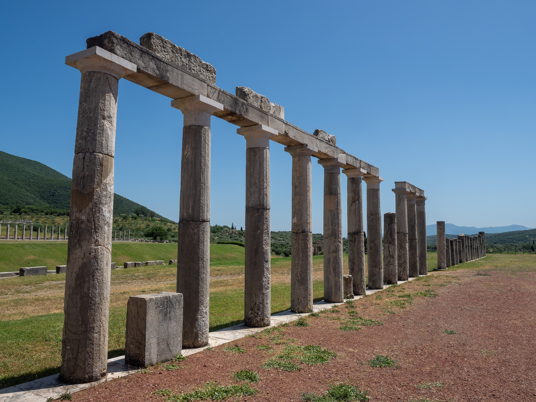 Bevor wir den Rückweg in Richtung Kalamata antreten, machen wir noch einen kurzen Abstecher etwa zwei Kilometer weiter nach Norden. Dort durchqueren wir das imposante Arkadische Tor, das einst Zugang zur neun Kilometer langen Stadtmauer bot.