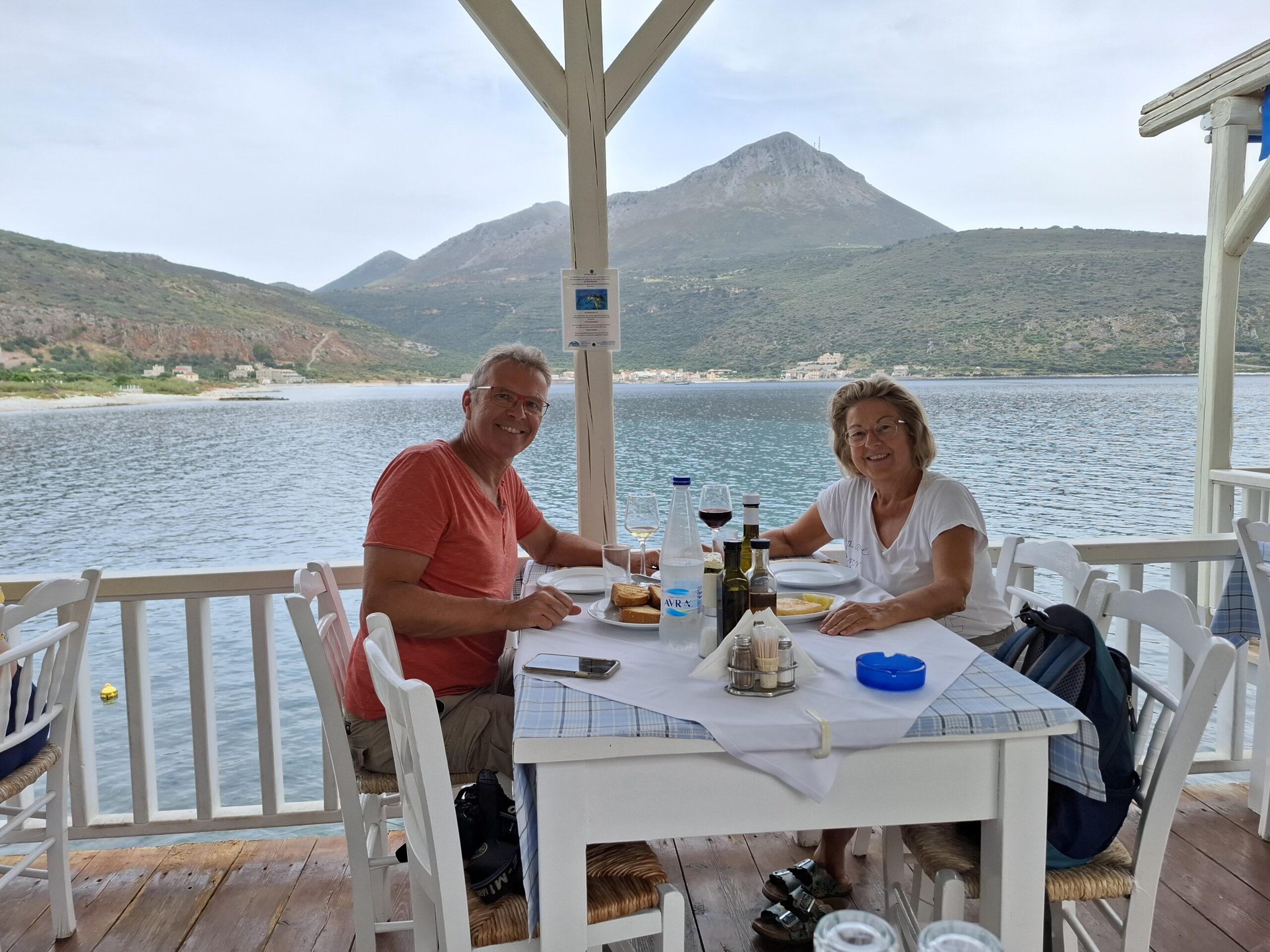 Das Essen in der Taverne ist ausgezeichnet: gegrillte Dorade, Beef Burger, Pommes, Saganaki und griechischer Salat – alles frisch zubereitet und sehr lecker. Auch der Kellner überzeugt mit Charme. Auf Renates rhetorische Frage, warum es statt Ouzo neuerdings Desserts gebe, antwortet er augenzwinkernd: “Your wish is my command.” Und keine Minute später stehen zwei Ouzos auf unserem Tisch.