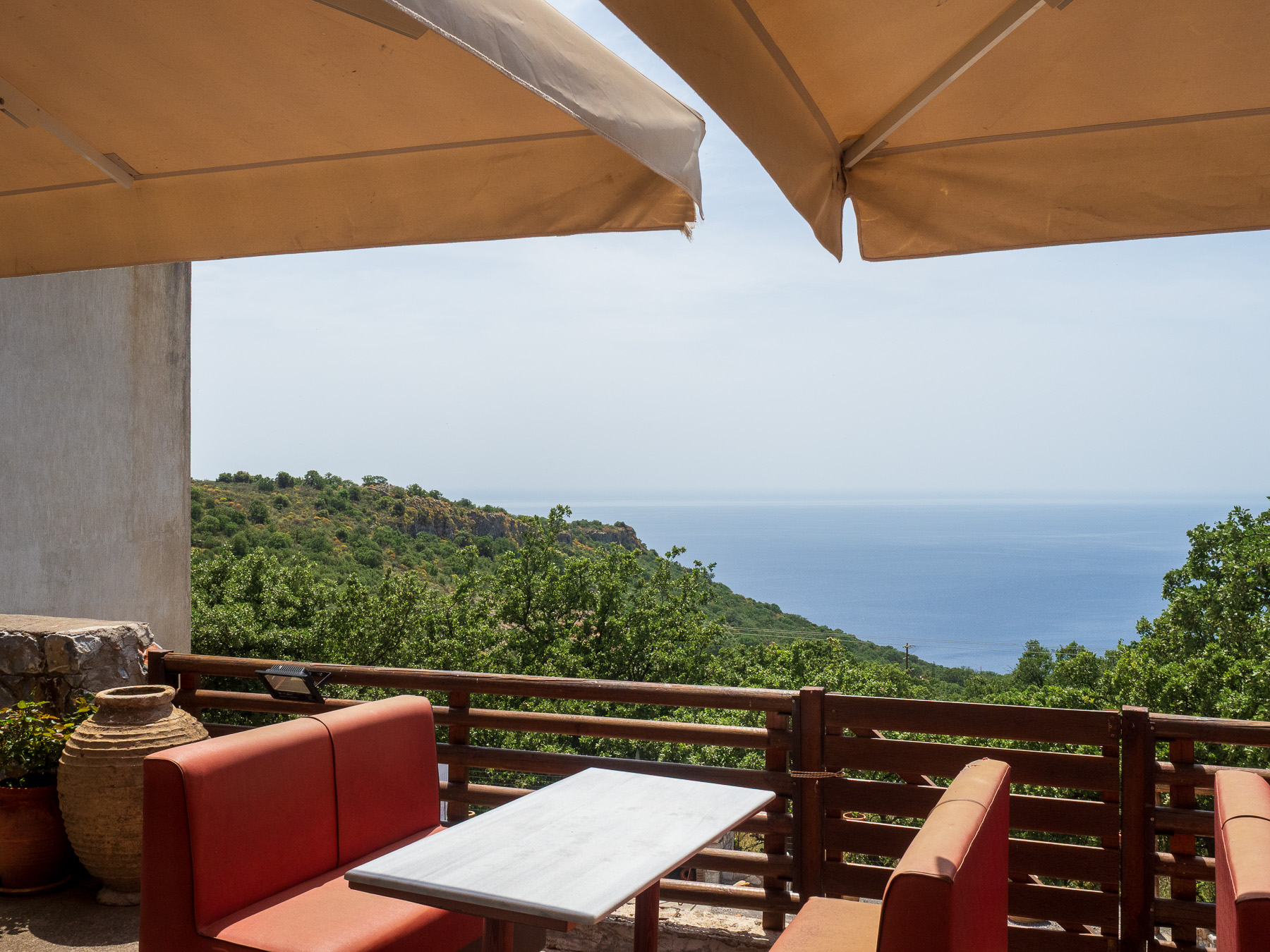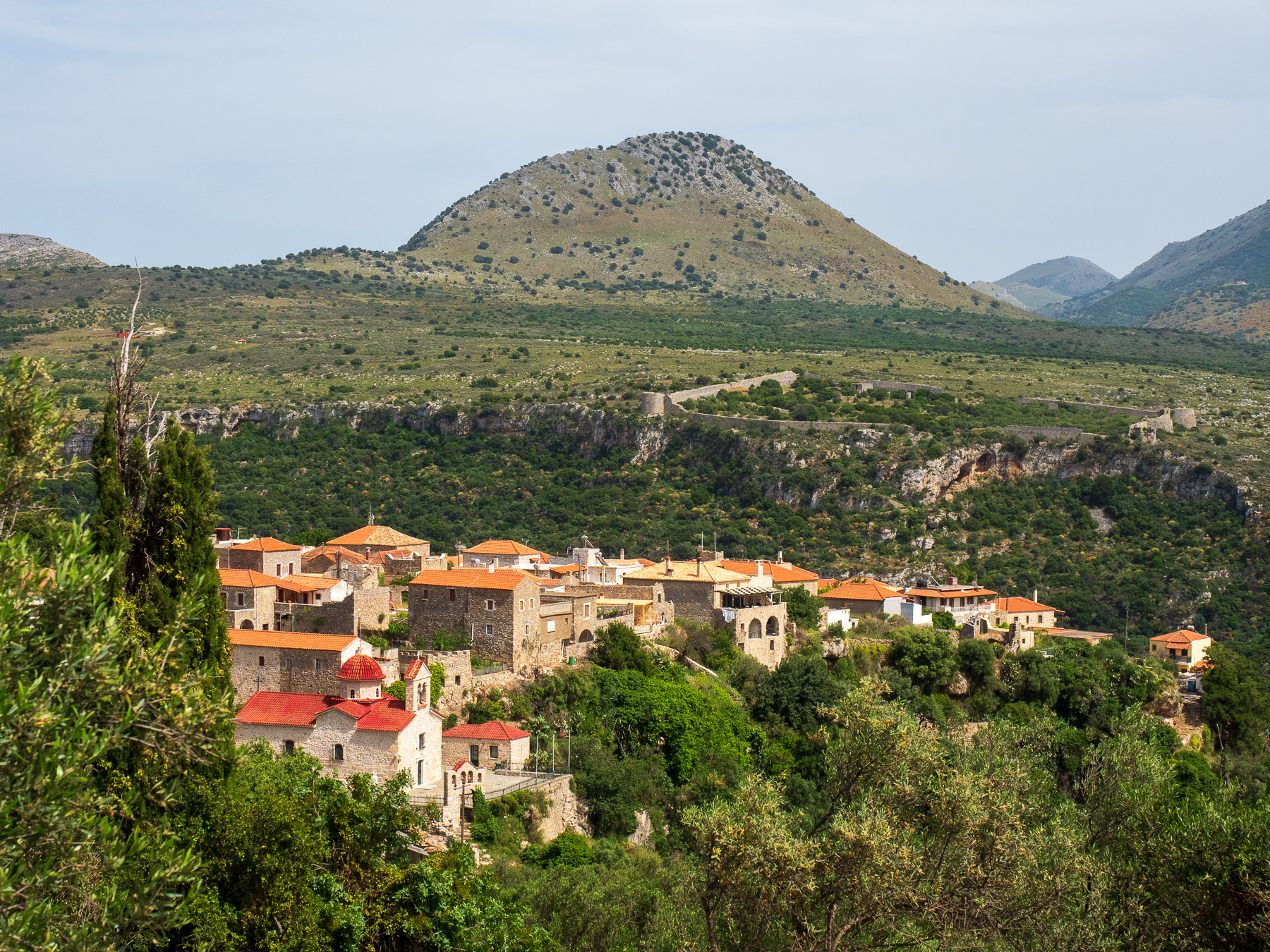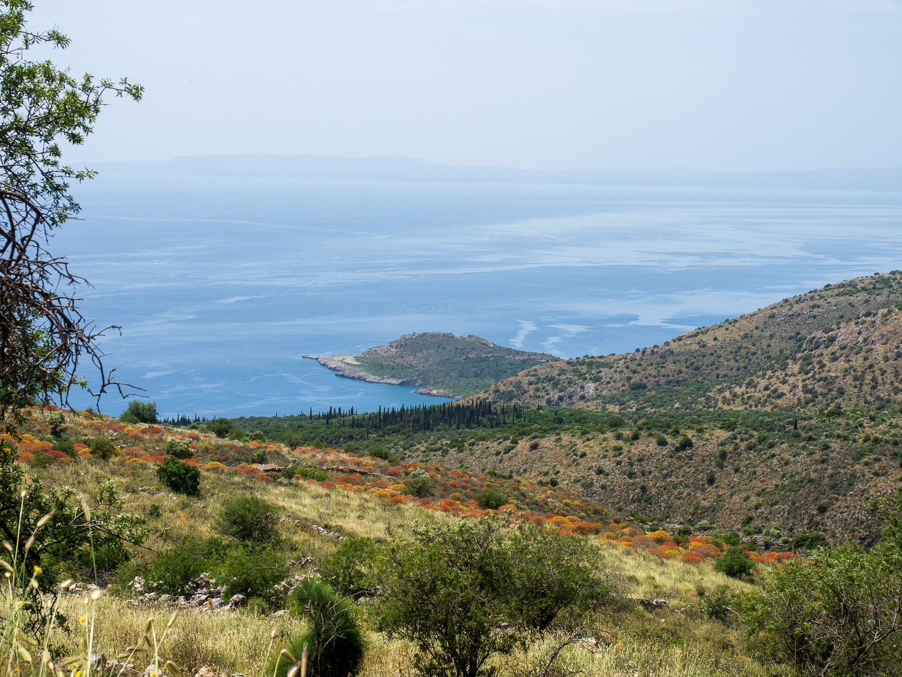 In engen Serpentinen winden wir uns durch die beeindruckende Berglandschaft der Mani. Die Straßen sind zwar asphaltiert, aber teilweise extrem schmal. Zum Glück begegnet uns an den Engstellen kein Gegenverkehr. Immer wieder öffnet sich der Blick auf die Küste und das tiefblaue Meer – eine traumhafte Kulisse.