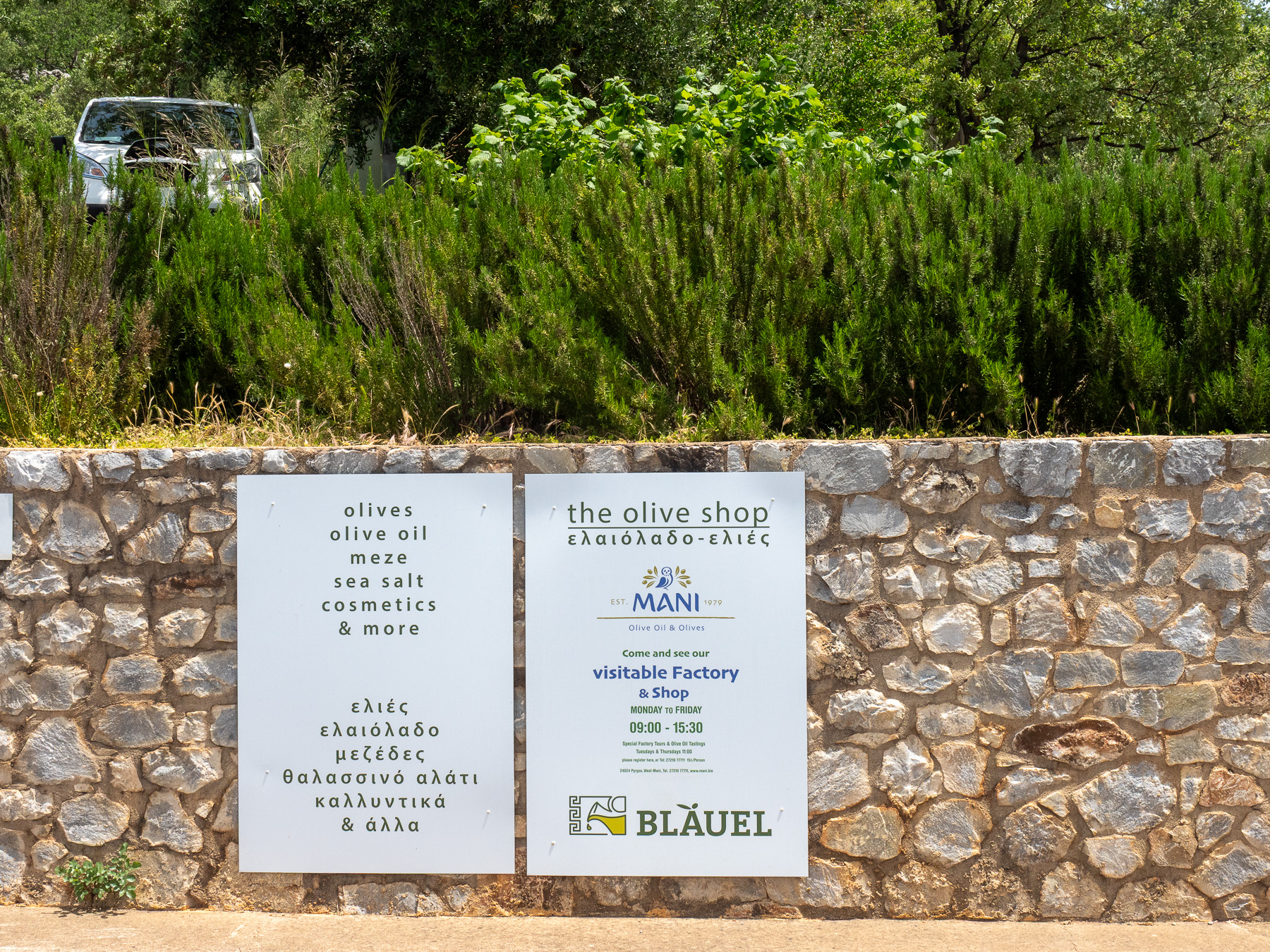 In Stoupa machen wir noch einen kurzen Stopp im Supermarkt, um unsere Vorräte aufzufüllen. Spontan entscheiden wir uns, die Olivenölfabrik Bläuel zu besuchen. Nach den guten Rezensionen hatten wir auf eine Führung und interessante Infos zur Olivenölproduktion gehofft – leider Fehlanzeige. Stattdessen wird man auf ein Video verwiesen. Die Abfüllanlage lässt sich nur durch eine Glasscheibe betrachten. Fazit: Der Besuch lohnt sich nur, wenn man gezielt einkaufen möchte.