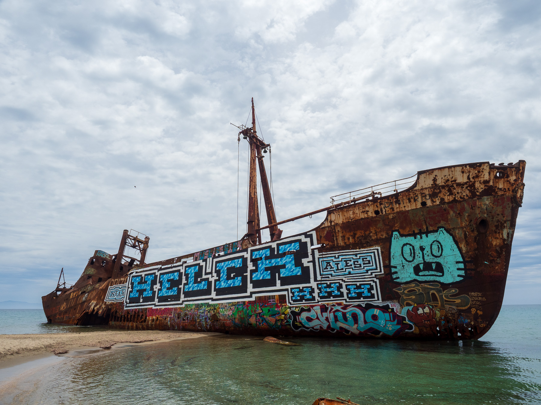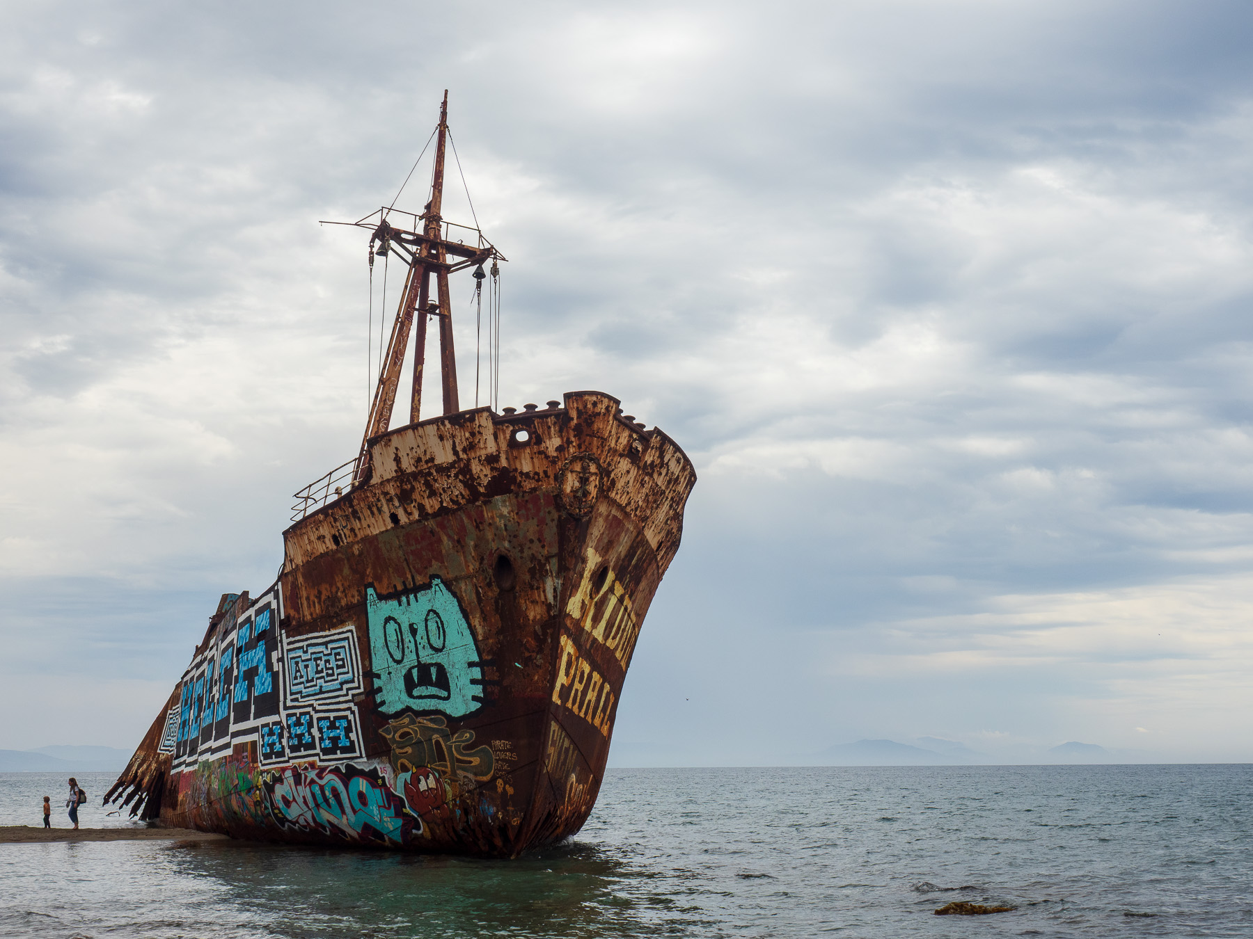 Zuvor fahren wir zum Strand von Valtaki, wo das bekannte Schiffswrack der Dimitrios liegt. Die Dimitrios war ein kleines Küstenmotorschiff, das am 23. Dezember 1981 strandete. Ihre Geschichte ist tragisch und faszinierend zugleich: Bereits im Dezember 1980 lag das Schiff im Hafen von Gythio, als der Kapitän überraschend ins Krankenhaus musste. Während seines Aufenthalts wurde das Schiff an die Kette gelegt und lag bis Juni 1981 still. Dann verlegten die Hafenbehörden das Schiff auf die Reede – nur um es wenige Monate später durch einen Sturm an den Strand gespült zu sehen. Heute ist das Wrack eindrucksvoll verrostet – ein lohnenswerter Fotospot.