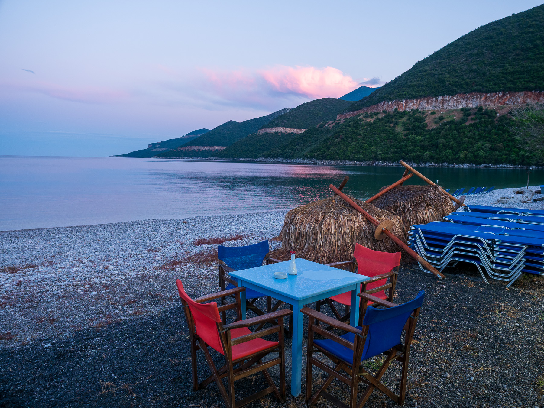 Von den Kieseln habe ich nun genug. Also fahren wir zurück zur Taverne, finden endlich jemanden – und parken direkt daneben auf sicherem Grund. Erst jetzt, nach dem Durchatmen, erkennen wir wirklich, wie traumhaft schön diese Bucht ist. Türkisblaues Wasser, ruhige Atmosphäre, umrahmt von Bergen – ein kleines Paradies, das sich alle Mühe der Anfahrt definitiv verdient hat.