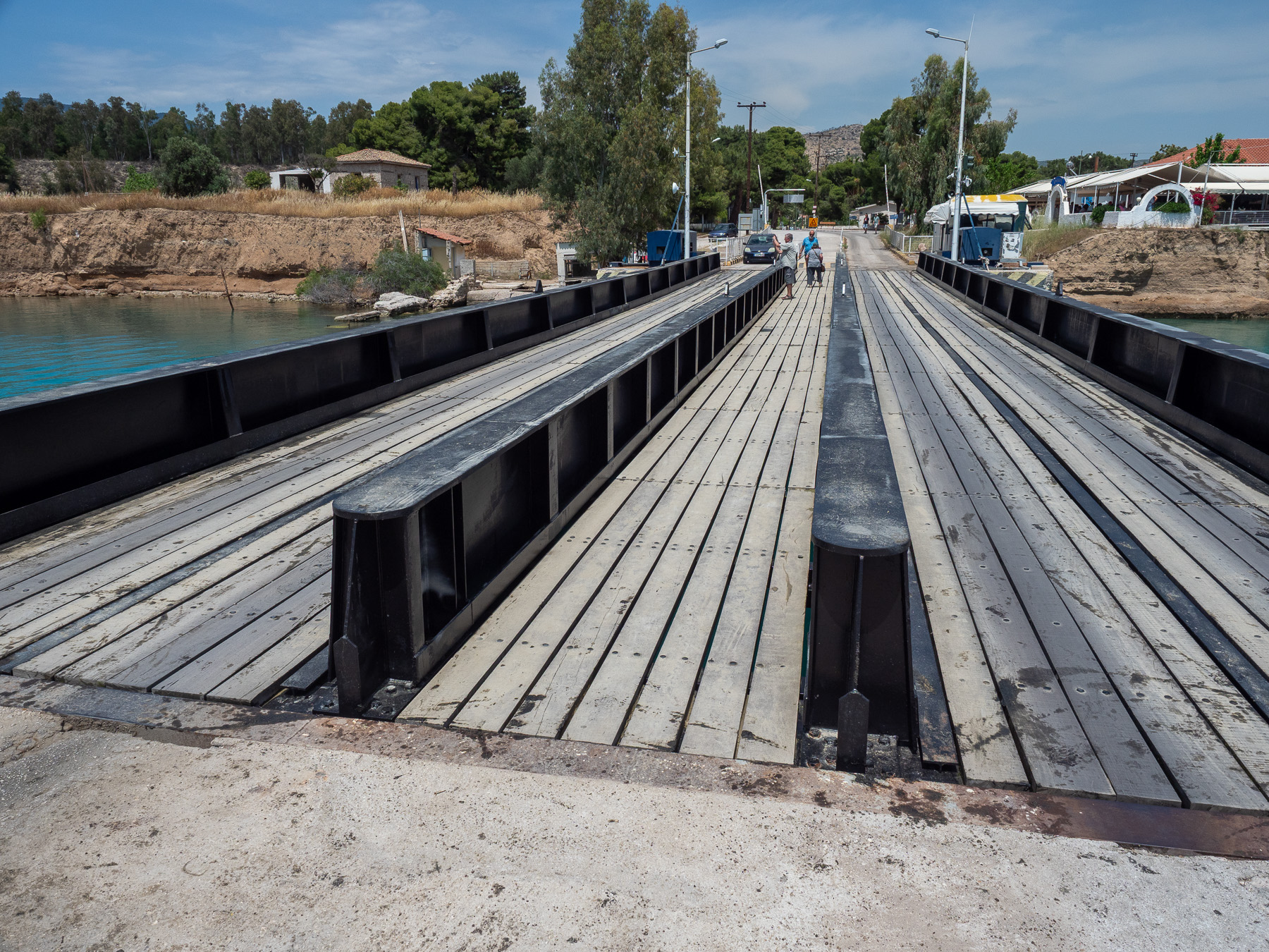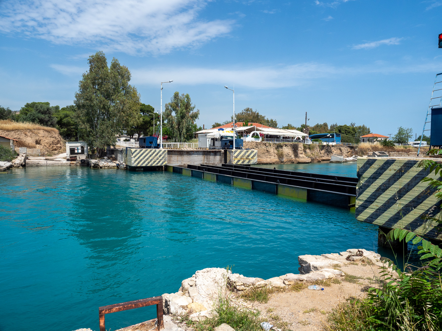 Nach dem Rundgang fahren wir weiter zur nächsten Sehenswürdigkeit: dem Kanal von Korinth. In Isthmia auf der Peloponnes-Seite parken wir in der Nähe der versenkbaren Brücke. In der Ferne sehen wir ein Schiff und hoffen auf eine Durchfahrt – leider vergeblich. Auch stellen wir fest, dass die Brücke auf unserer Seite eine 3-Tonnen-Beschränkung hat – für uns also gesperrt.