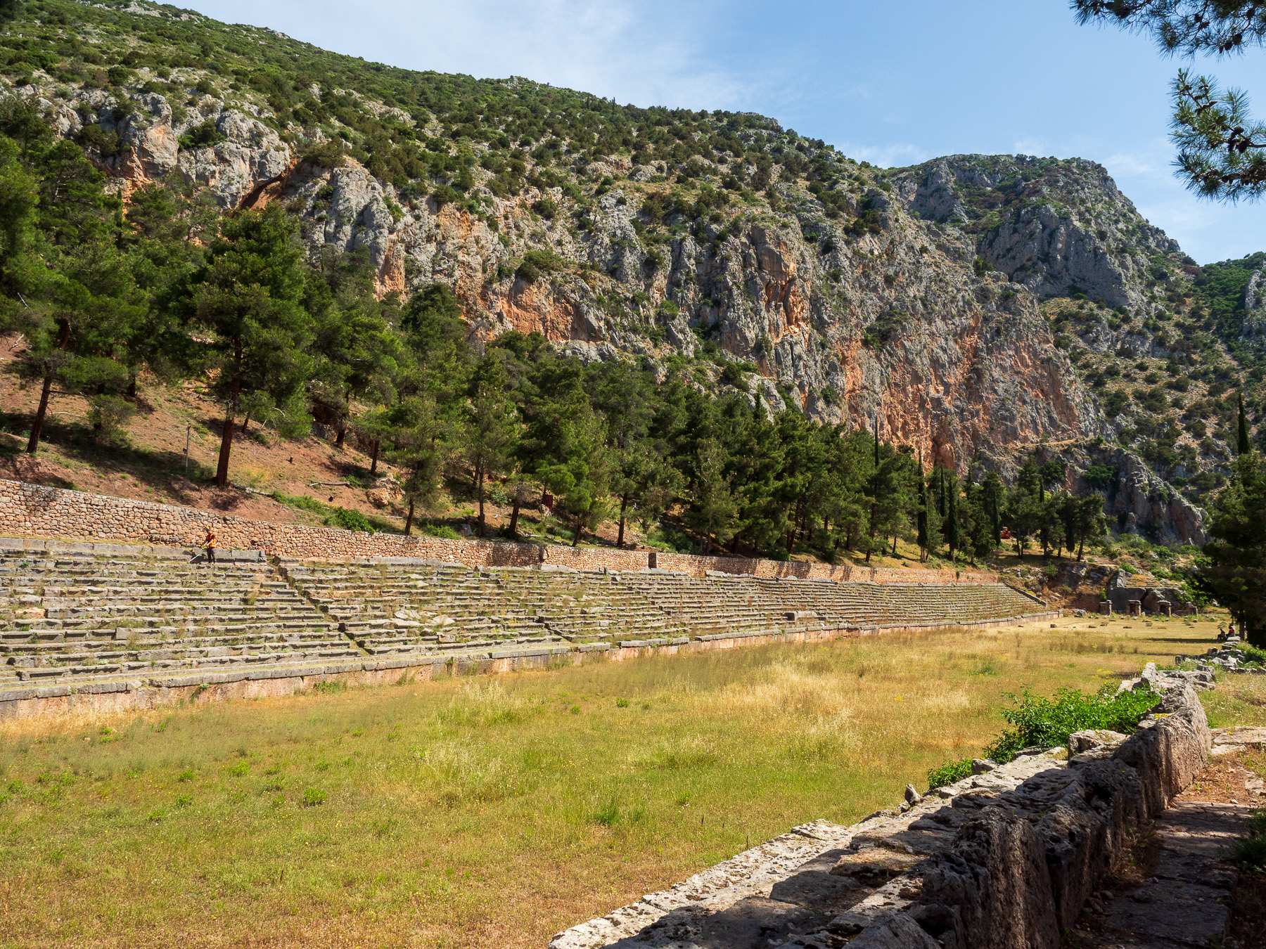 Etwas oberhalb liegt das antike Theater von Delphi, das sich perfekt in den Hang schmiegt. Von hier oben hat man einen grandiosen Blick über die gesamte Ausgrabungsstätte – und hinaus ins Tal. Noch ein Stück weiter hinauf: das Stadion, in dem damals sportliche Wettkämpfe ausgetragen wurden, ähnlich wie in Olympia.