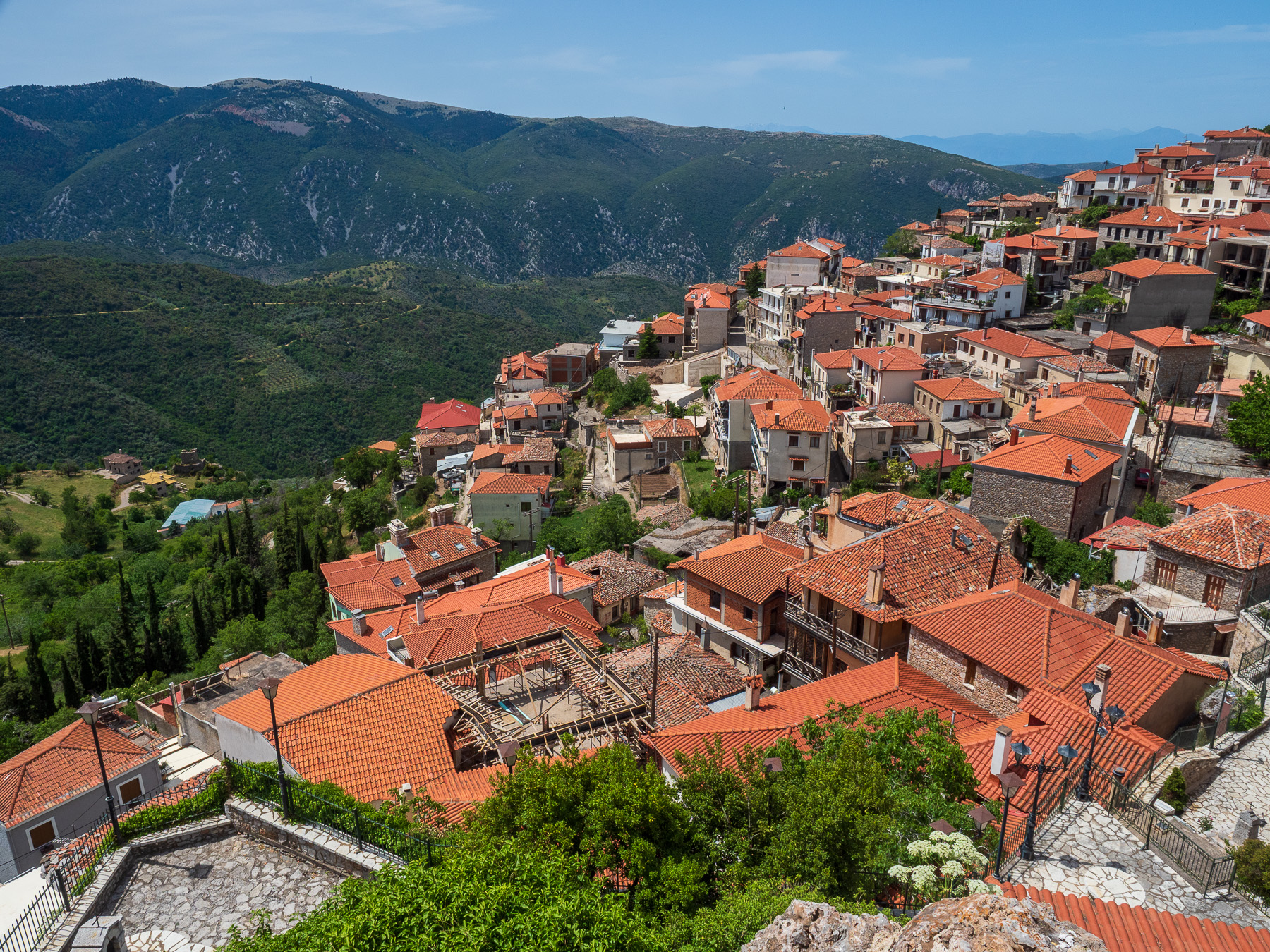 Auf unserer Fahrt nach Delphi durchquerten wir den Wintersportort Arachova – ja, du hast richtig gelesen: ein Wintersportort! Der Ort klebt malerisch an den Hang des Parnass-Gebirges. Als wir einfuhren, hätte ich am liebsten direkt angehalten. Aber: Wir waren spät dran, und die Sonne stand bereits so tief, dass gute Fotos kaum möglich gewesen wären.
