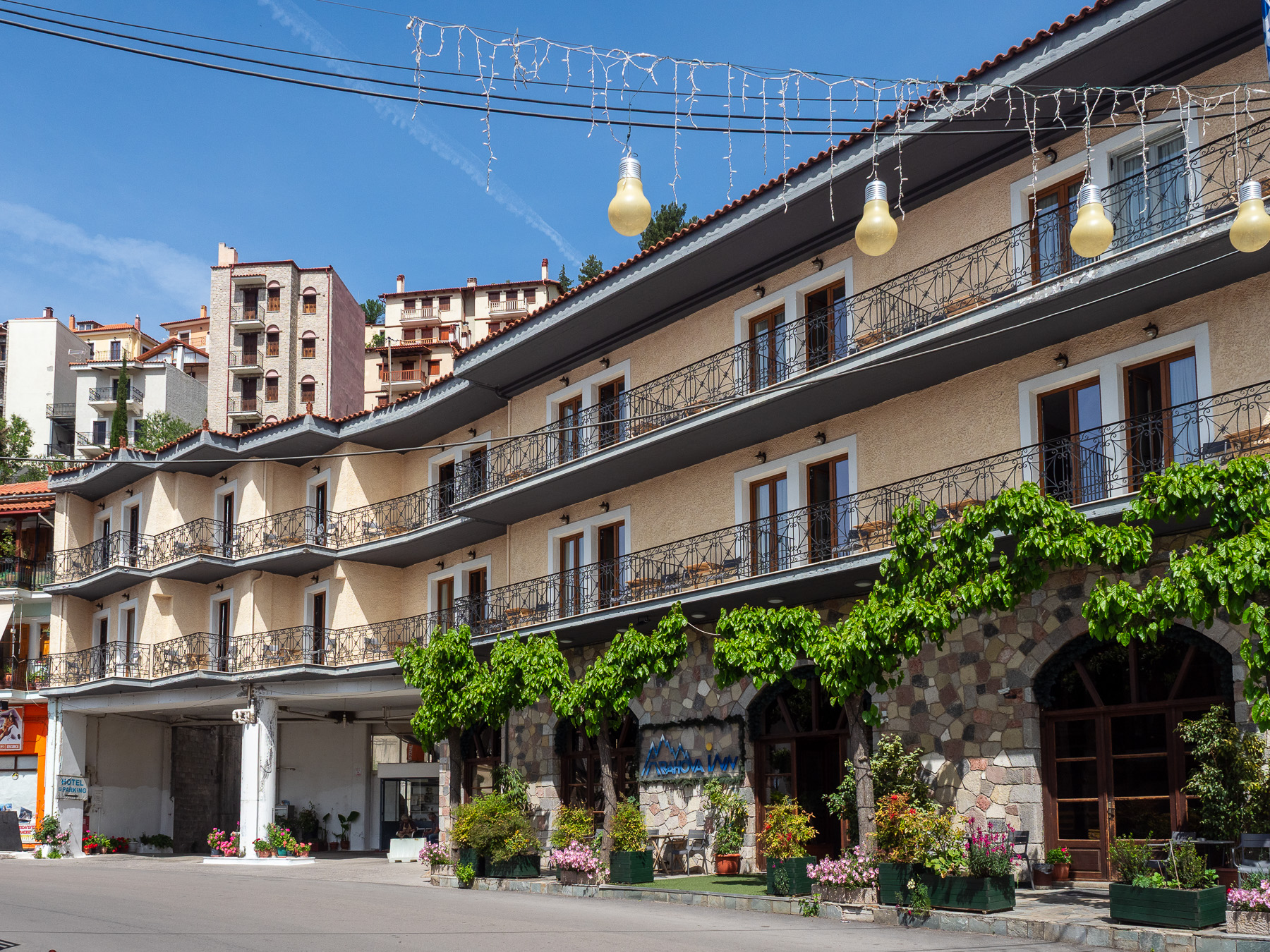 Arachova ist wirklich reizvoll – und gleichzeitig etwas skurril. Über der Hauptstraße hängen noch Lichterketten, die stark an Weihnachtsbeleuchtung erinnern. In den Auslagen der kleinen Läden entdecken wir Pelzmützen und Mäntel – und das bei 24 Grad. Es ist T-Shirt-Wetter! Hier treffen Wintersportflair und mediterraner Frühling direkt aufeinander.