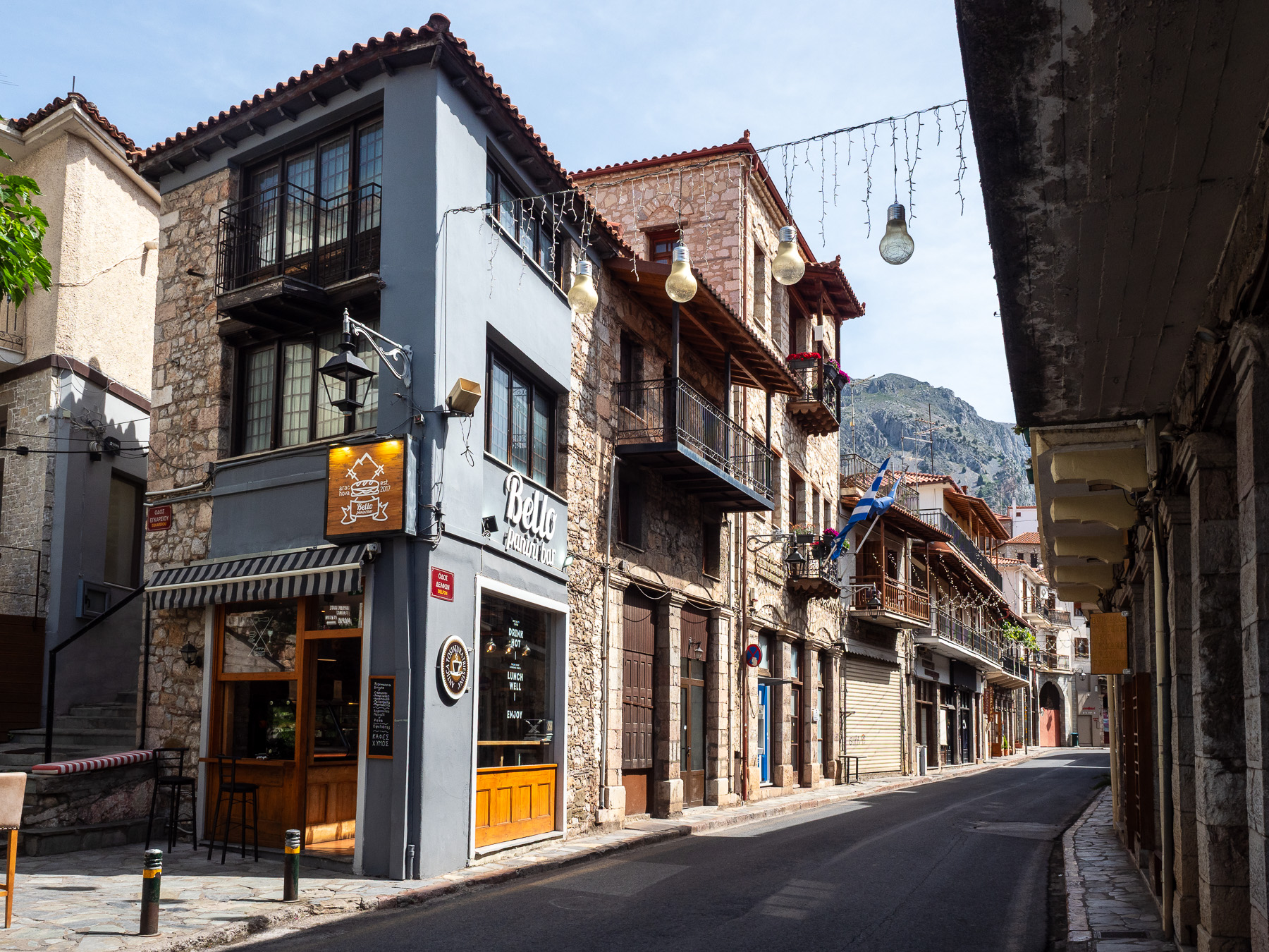 Da wir noch eine Nacht auf dem Camping Delphi verbringen, nutzen wir den Vormittag für einen Ausflug zurück nach Arachova. Von Delphi kommend, finden wir am Ortseingang direkt einen guten Parkplatz am Seitenstreifen. Perfekt, um gemütlich durch den Ort zu laufen.
