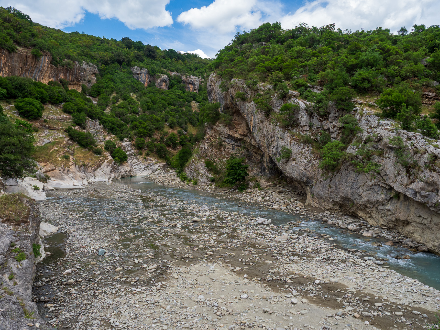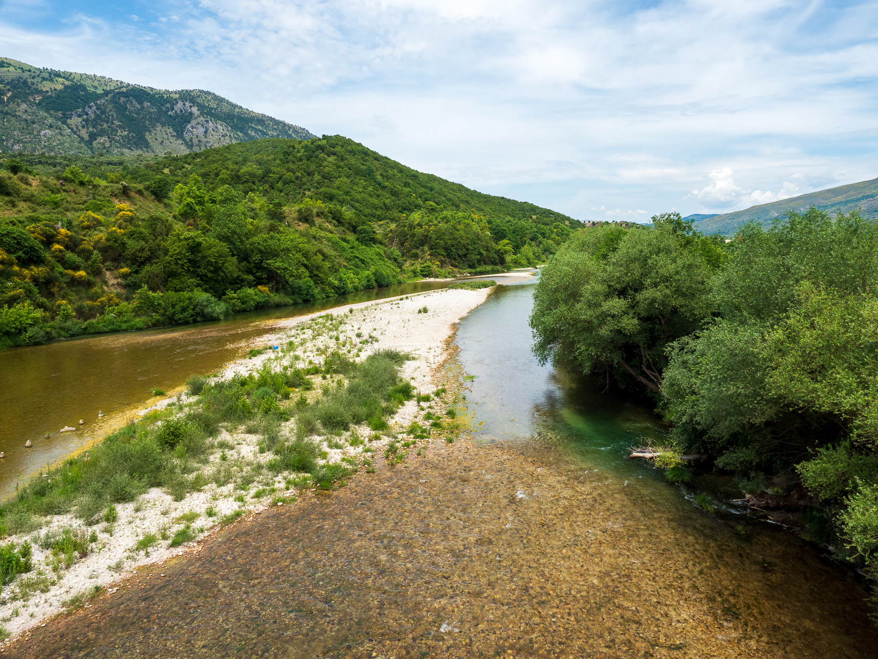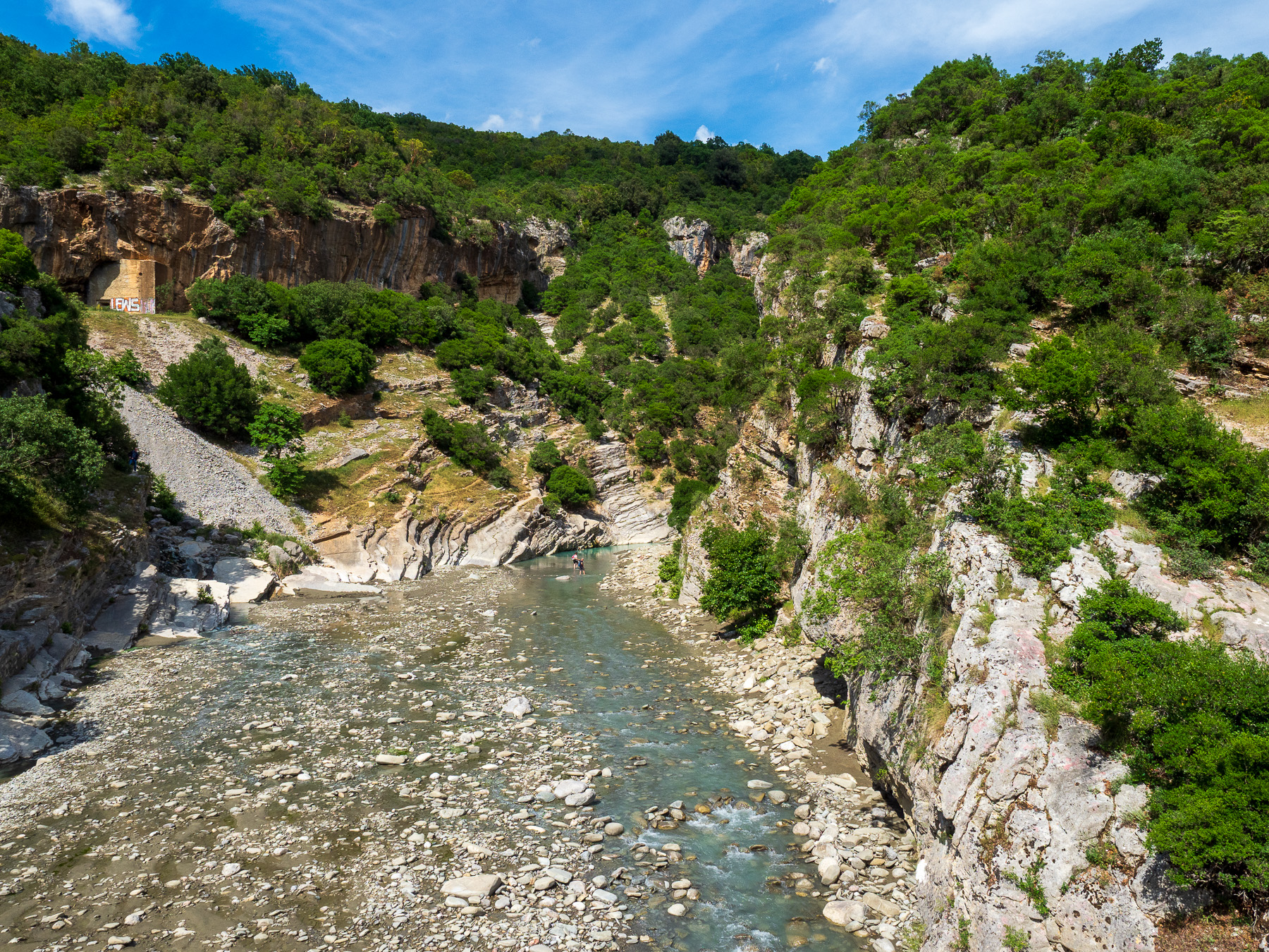 Kurz vor Tepelena biegen wir auf die SH75 in das Tal der Vjosa ab. Der Fluss gilt als einer der letzten unregulierten Wildflüsse Europas – und begleitet uns von nun an mit seinem türkisgrünen Wasser. Die Strecke ist ein echtes landschaftliches Highlight.