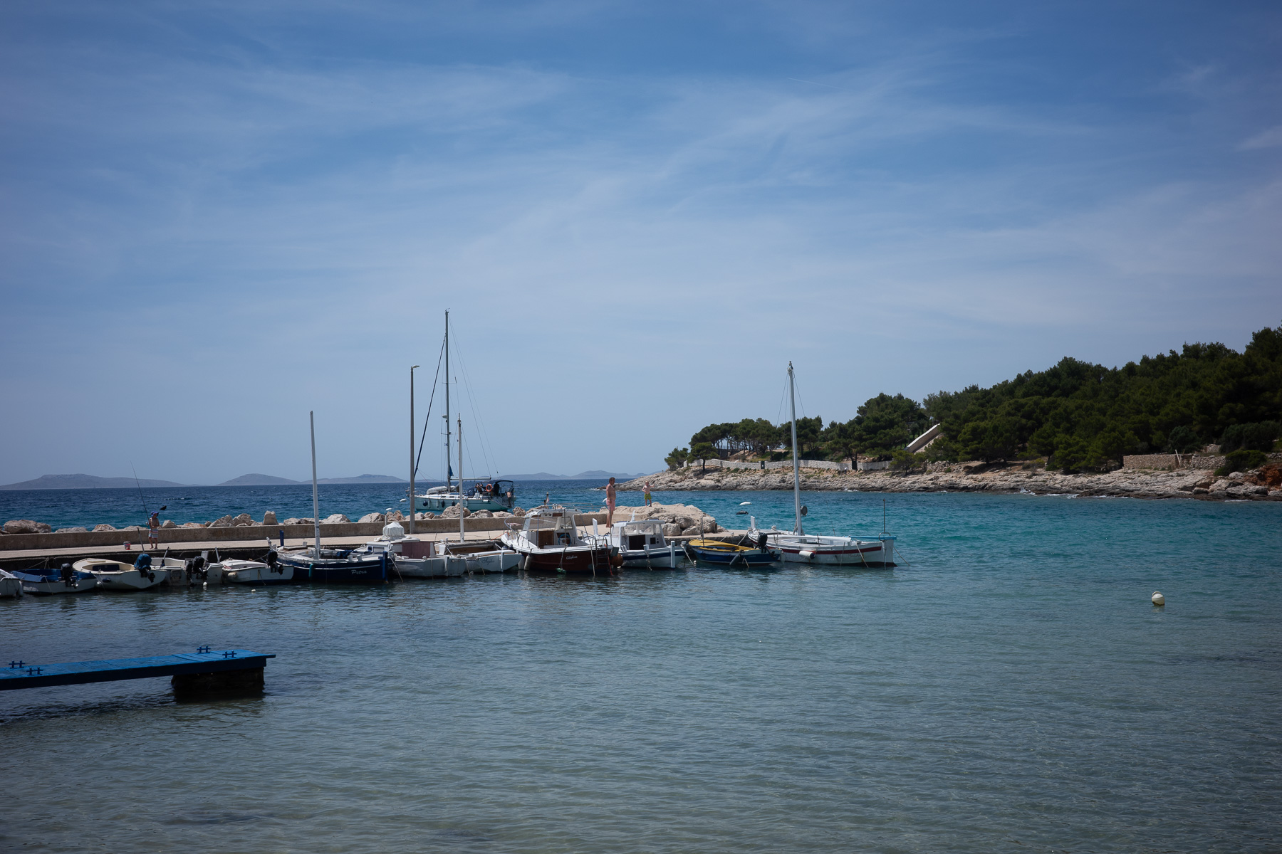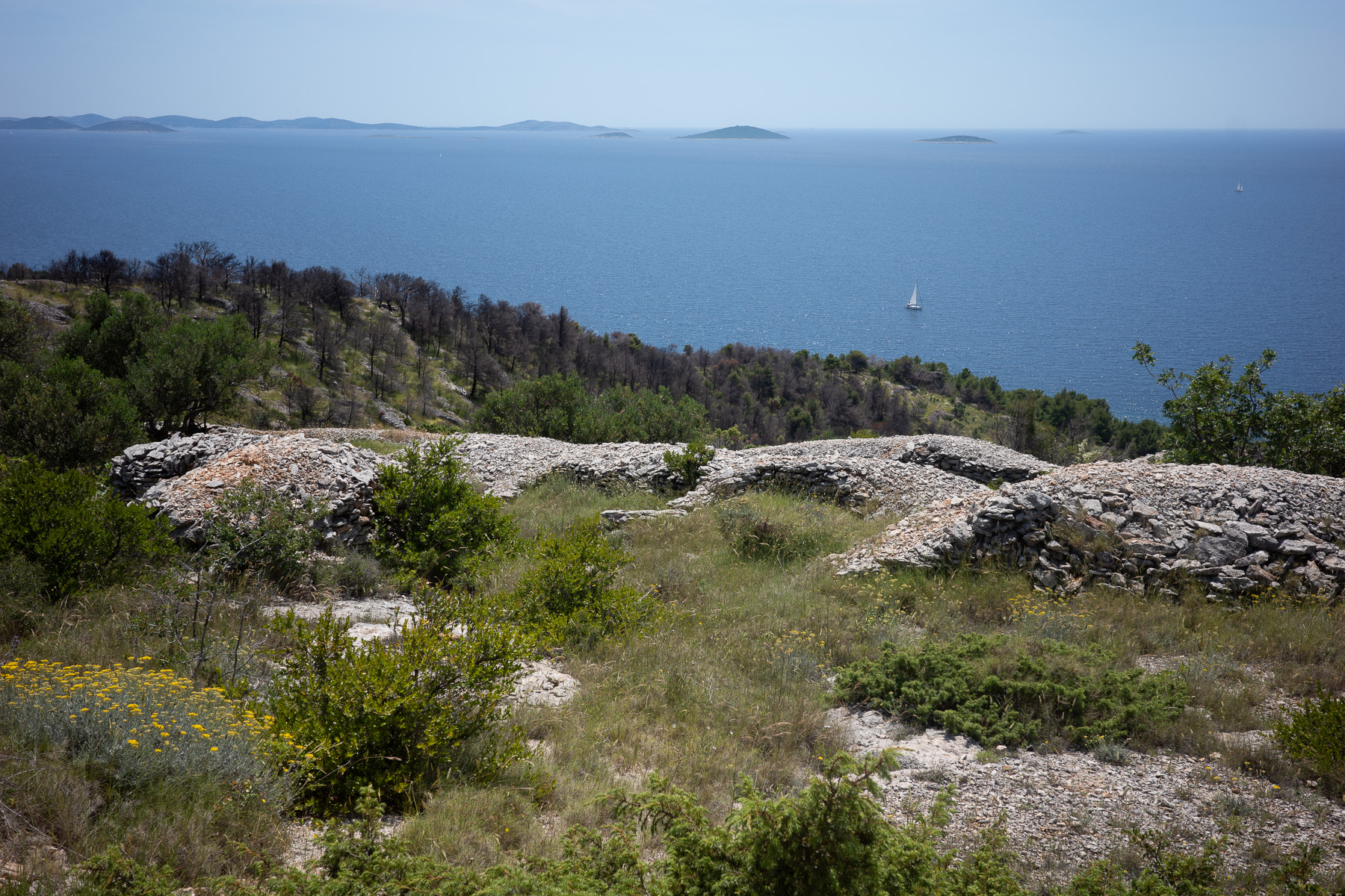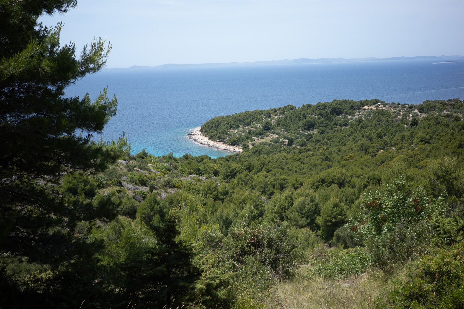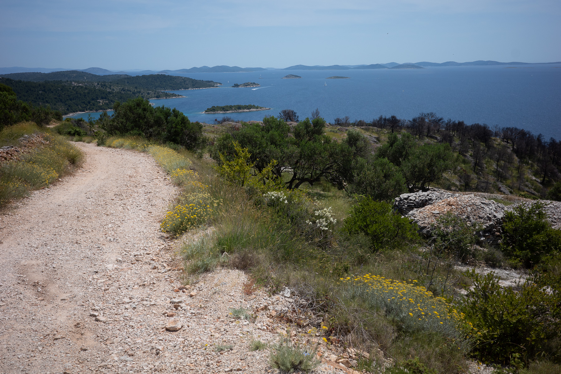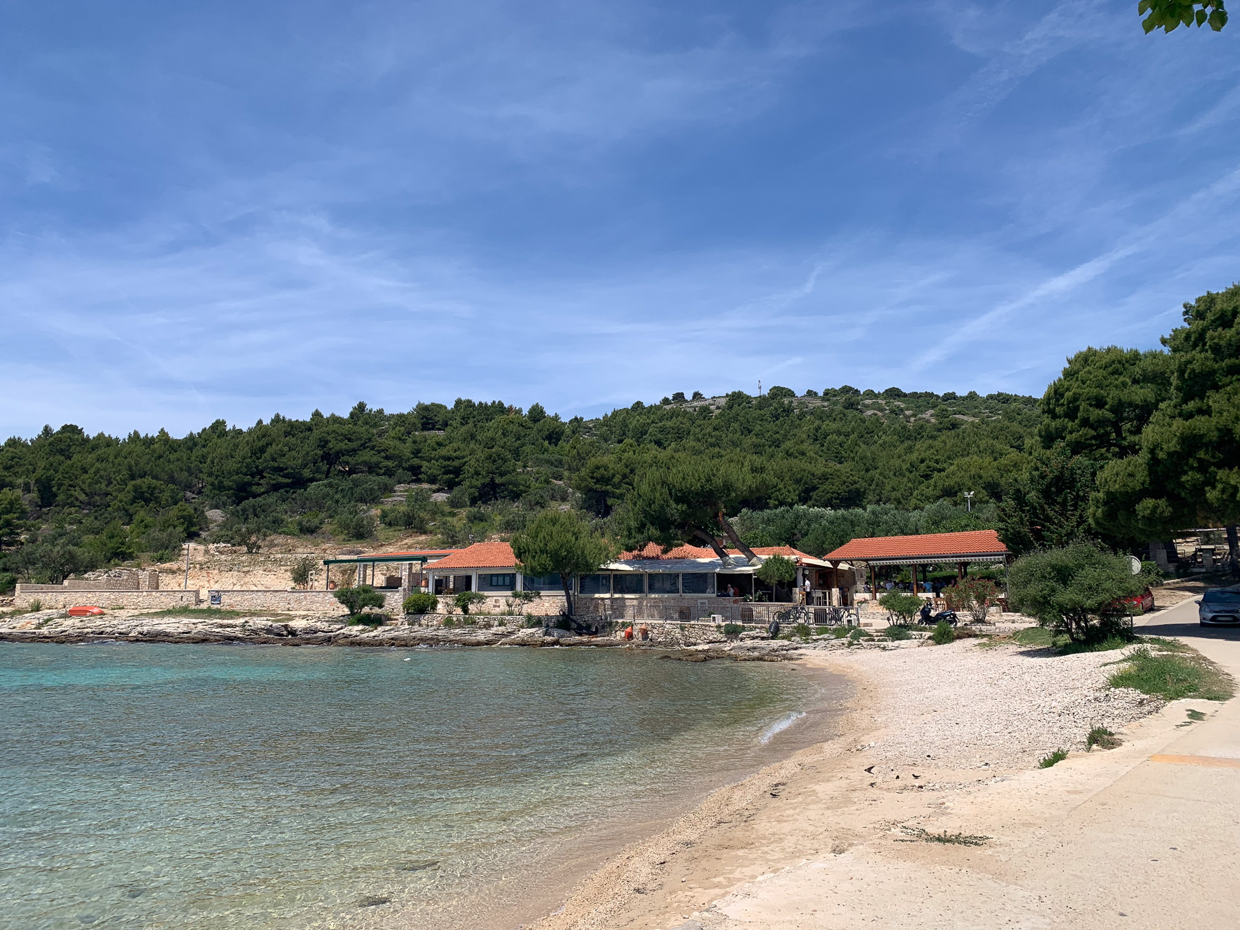 Wir orientieren uns neu, steuern die Straße an und fahren Richtung Tisno. Auf der Ostseite der Insel ist der Küstenweg ab dort deutlich besser befahrbar. Bis nach Betina rollen wir entspannt weiter – dieser Abschnitt versöhnt uns mit dem bisherigen holprigen Tourverlauf.