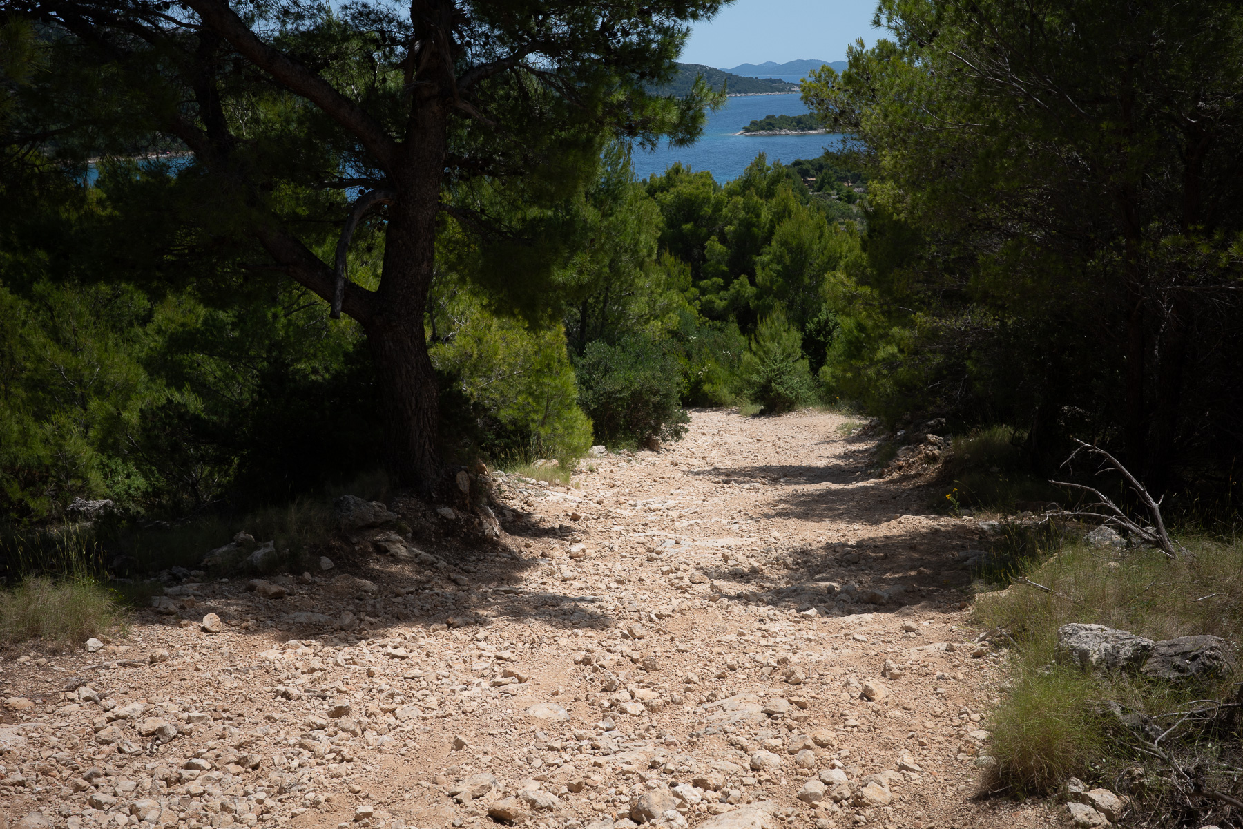 Zunächst geht es in Richtung Süden. Am Strand von Murter Cigrada wird der Küstenweg allerdings so schlecht, dass wir umkehren müssen. Also nehmen wir Kurs auf das Inselinnere. In der Nähe des Brdo geht es plötzlich steil bergab – die Piste ist mit dem Fahrrad kaum zu bewältigen. Wir müssen schieben. Und das macht nicht wirklich Spaß.